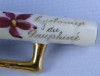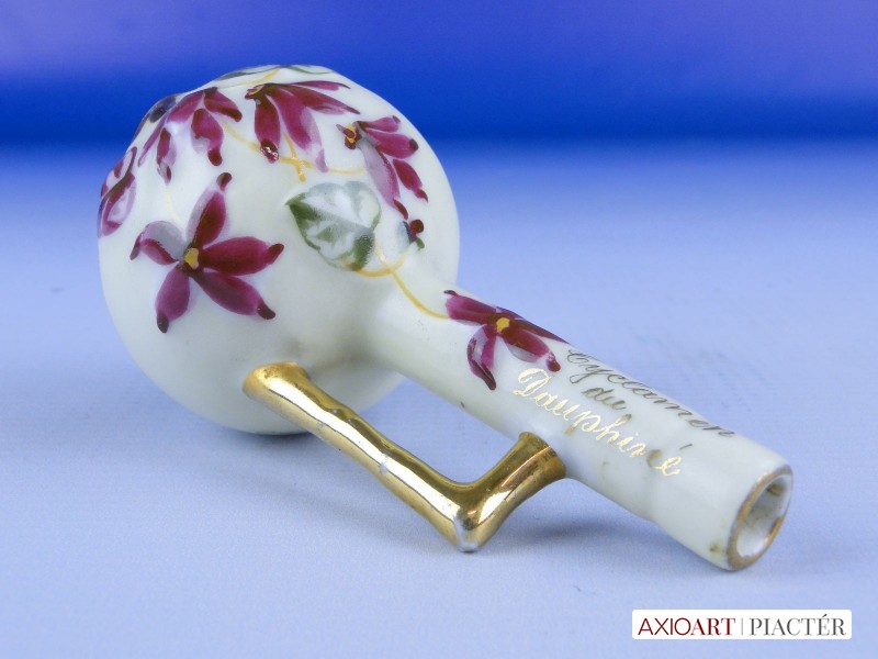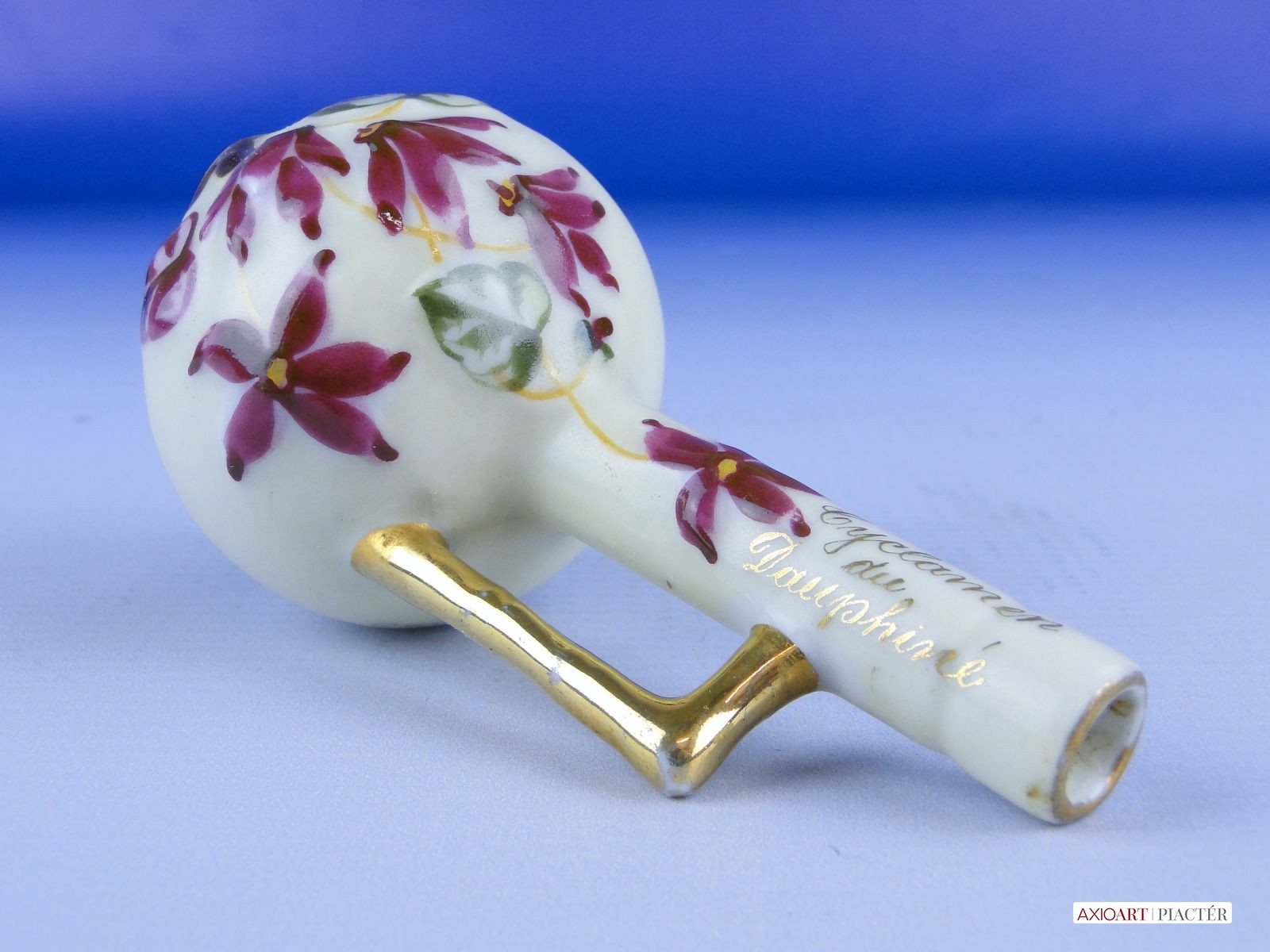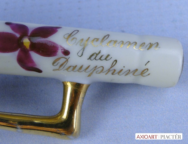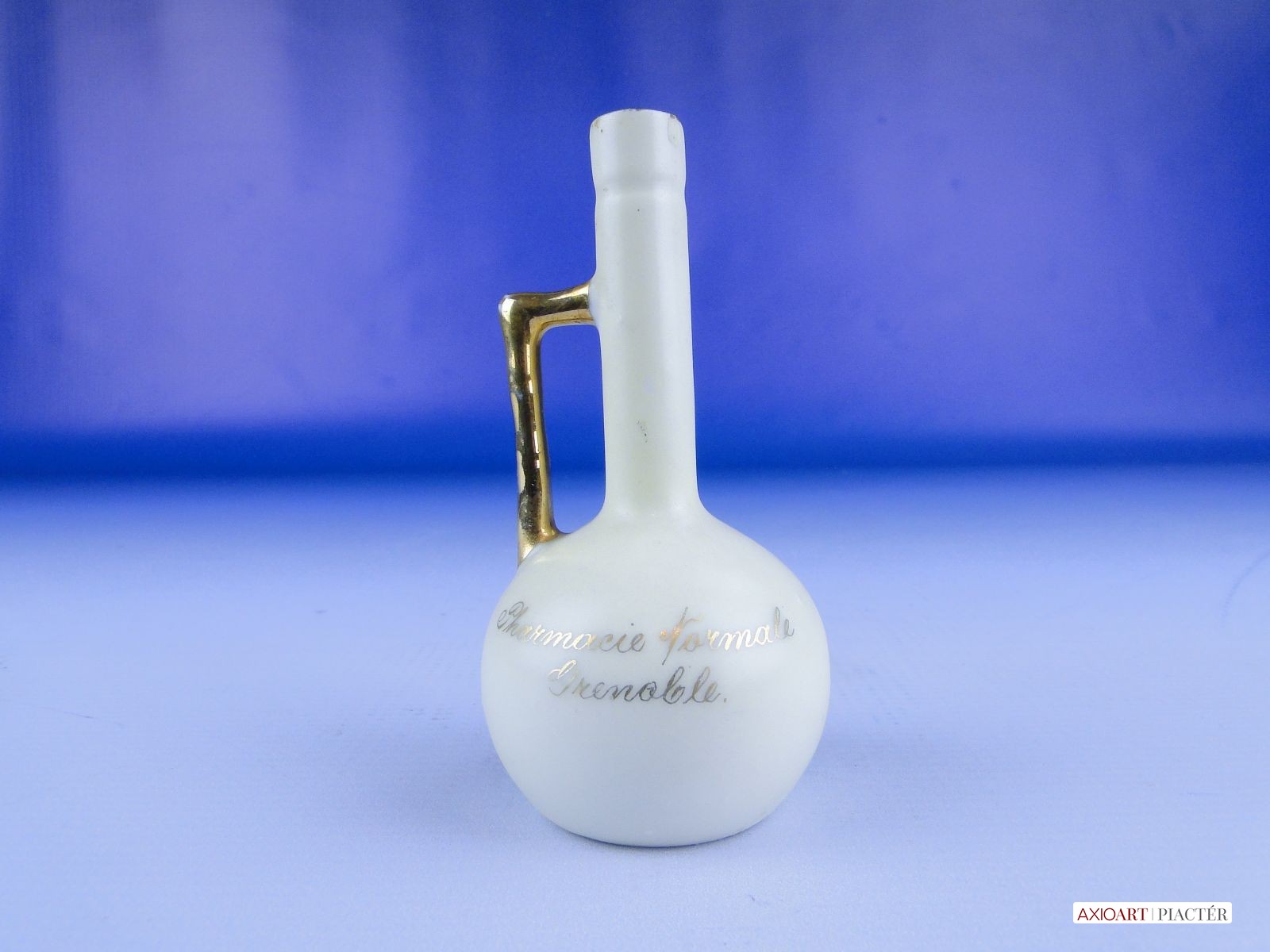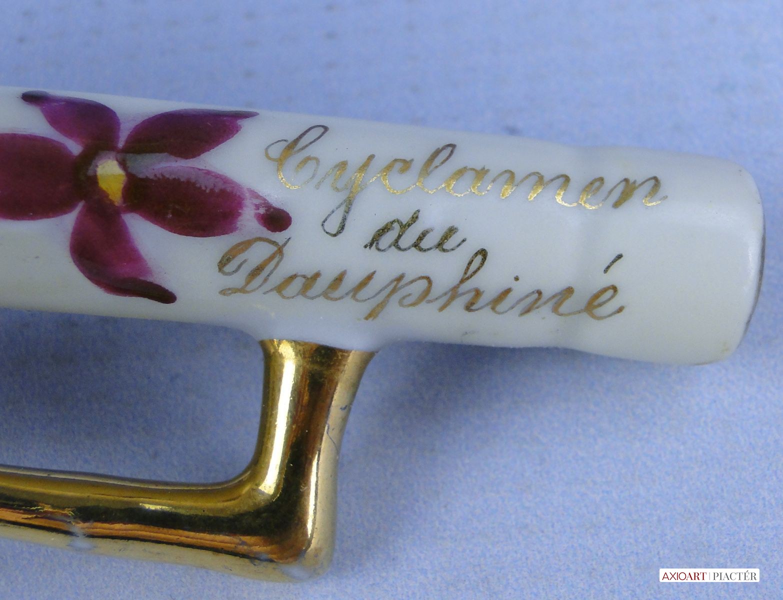 [0E621/UZ-K] Antik, hibátlan állapotú, jelzett, svájci porcelán váza, díszváza, ibolyaváza. Rajta kézi festésű virág, ciklámen díszítés. Oldalán, két helyen arannyal felirat: CYCLAMEN DU DAUPHINÉ PHARMACIE FORMALE GRENOBLE Alján jelzés, pirossal: IMPORTÉ DE SIUSSE Magasság: 9.2 cm Szélesség: 4.7 cm Súly: 0.055 kg