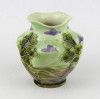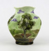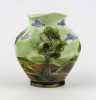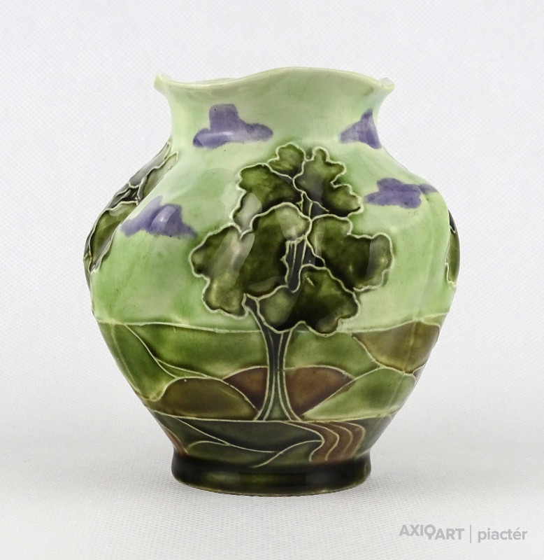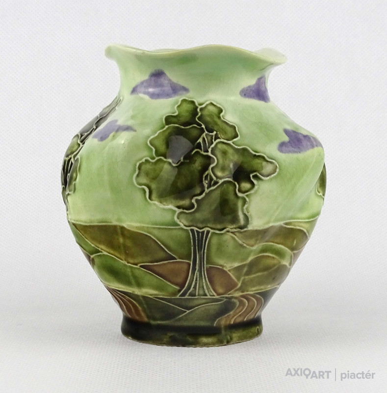 Antik, hibátlan állapotú, jelzetlen, zöld és barna színű, dombos, fás tájképpel díszített, szecessziós sítílusú, majolikából készült kis váza, díszváza.