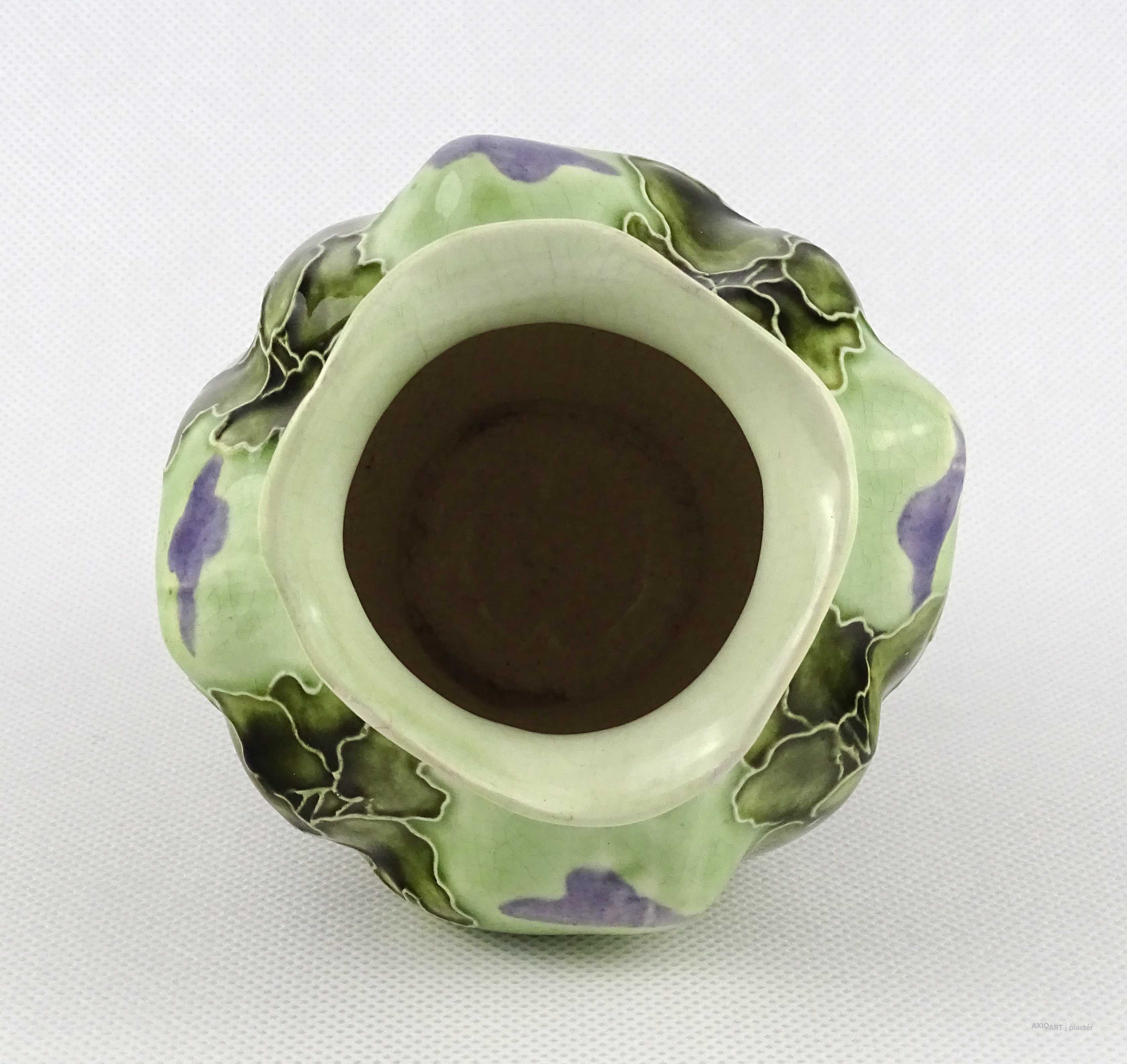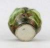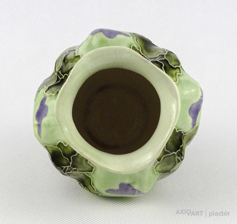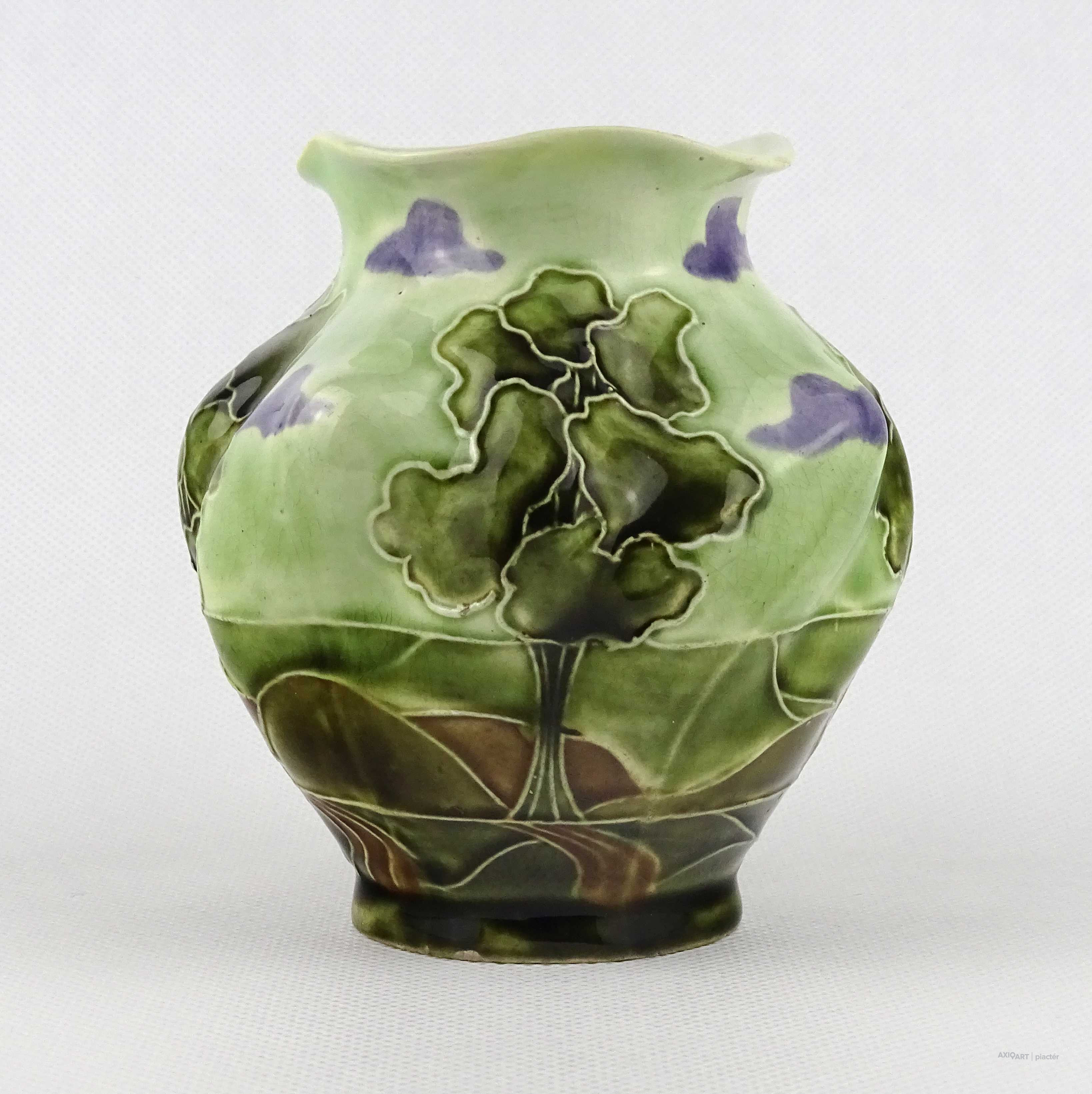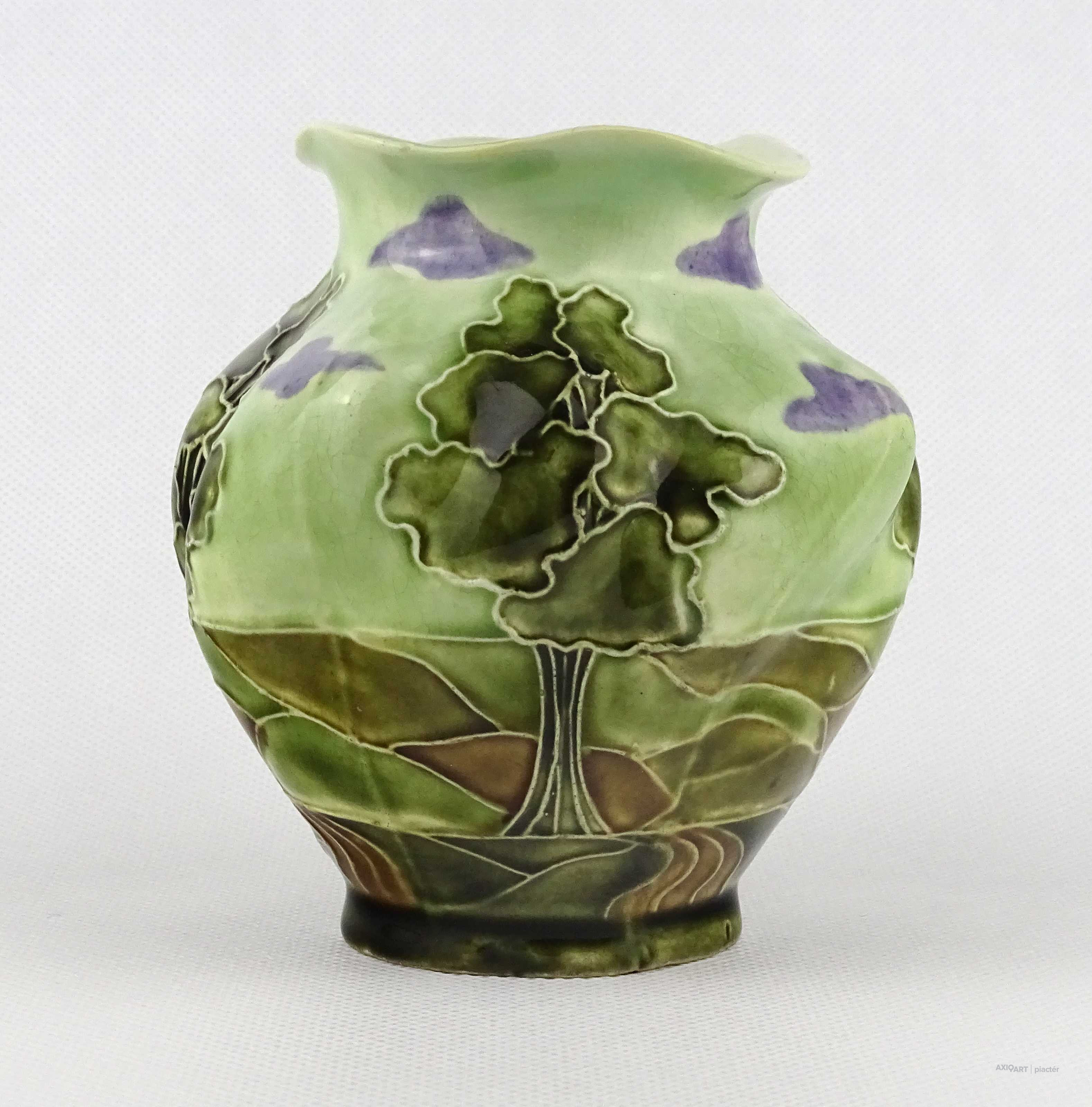 [1X542/X225] Antik, hibátlan állapotú, jelzetlen, zöld és barna színű, dombos, fás tájképpel díszített, szecessziós sítílusú, majolikából készült kis váza, díszváza. Alján formaszám látható: 2630 Magasság: 11.2 cm Szélesség: 10 cm Súly: 0.215 kg