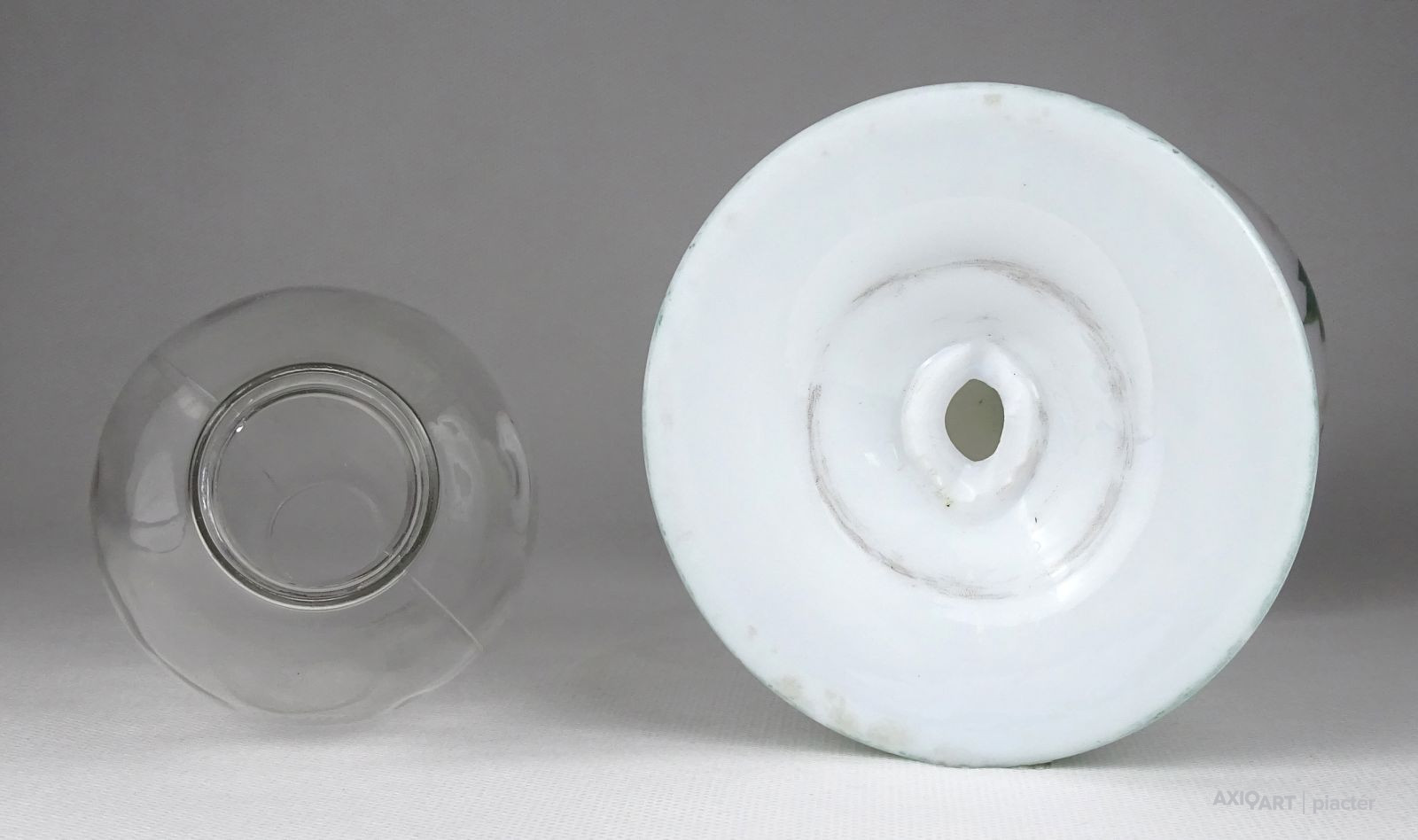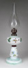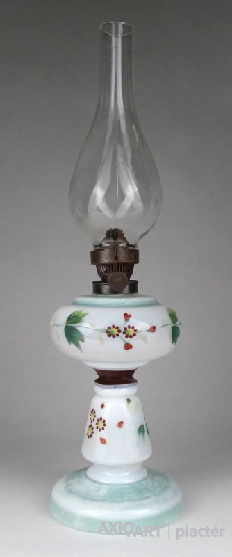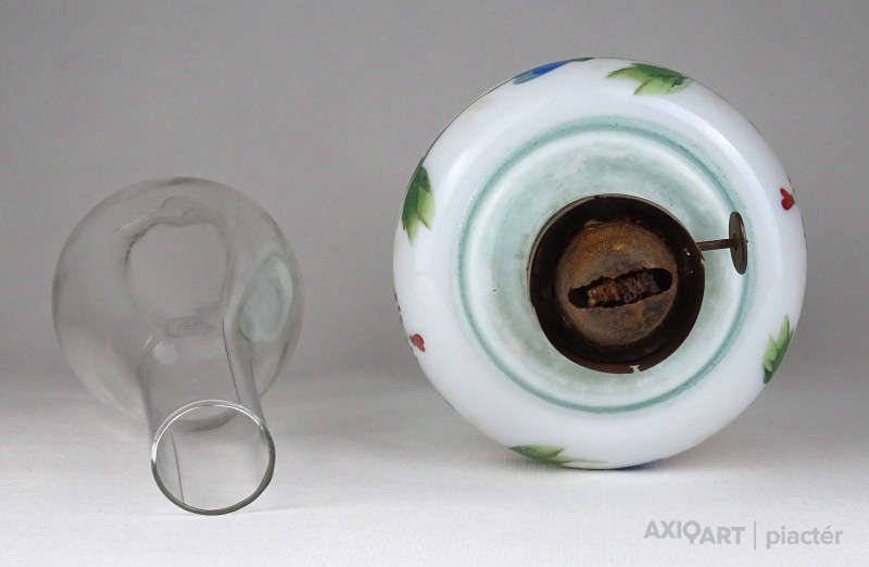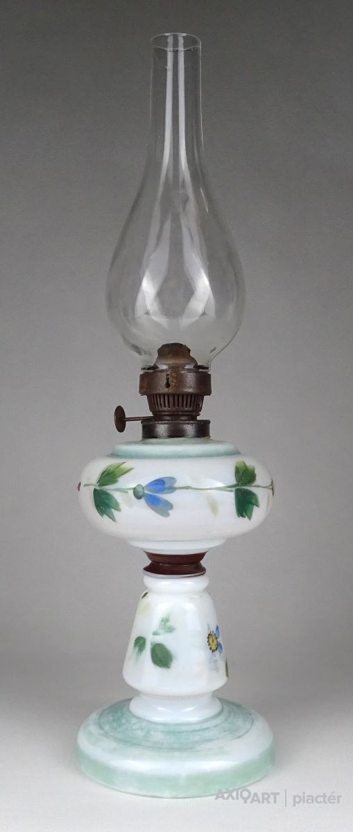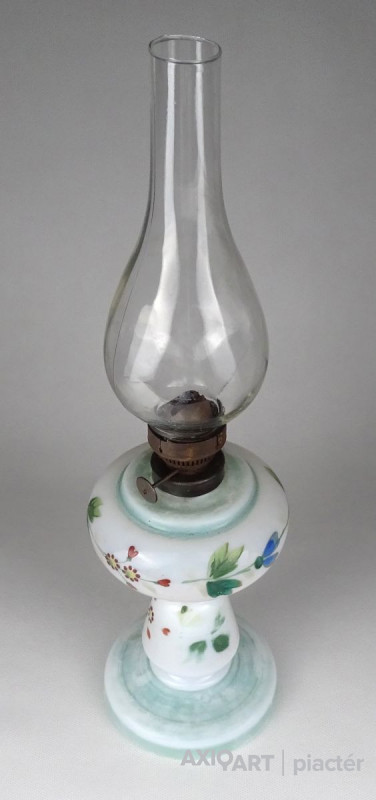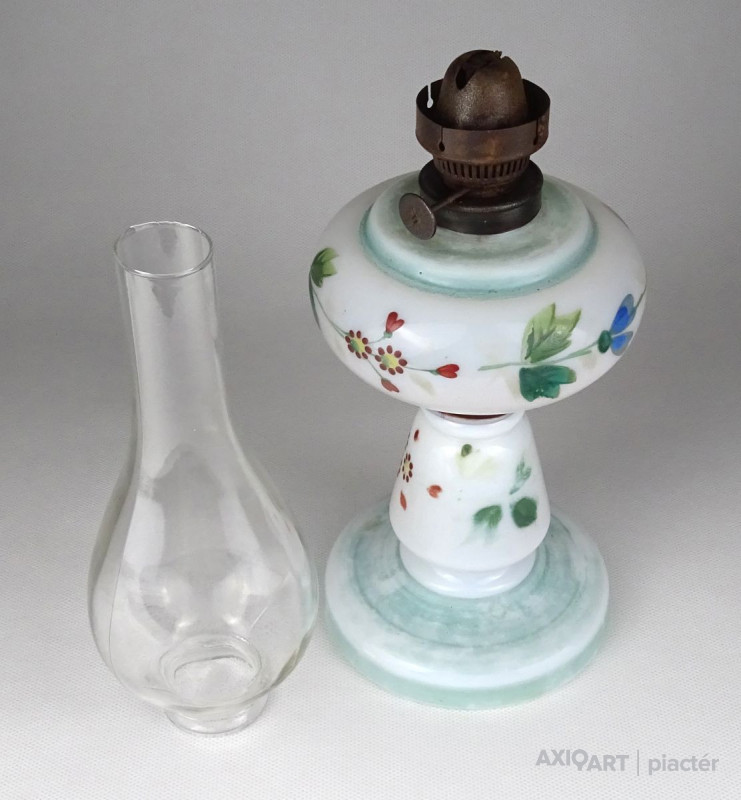 Szép, hibátlan állapotú fújt üveg petróleum lámpa, kézzel festett virágdíszítéssel. Vastagfalú hibátlan cilinderrel rendelkezik.