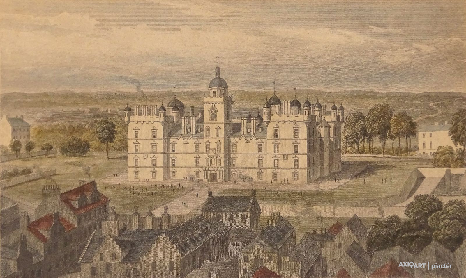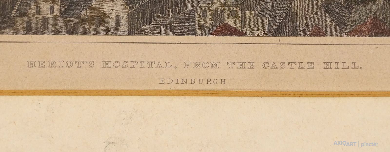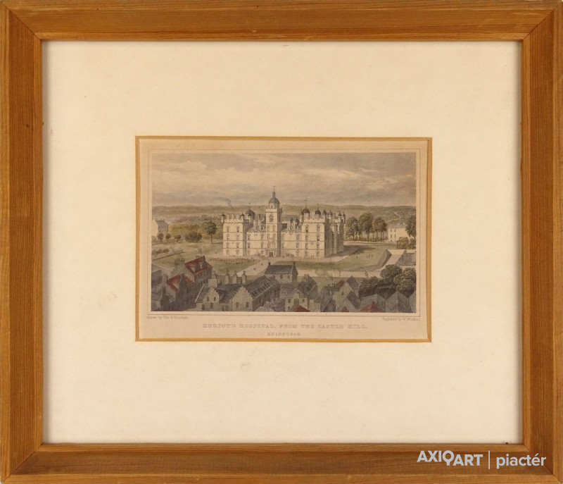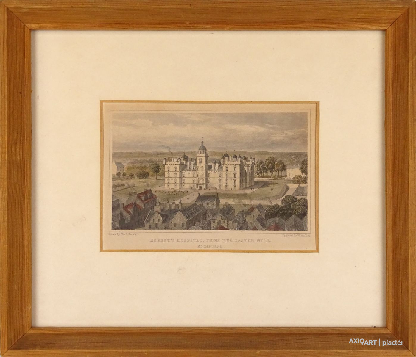 [0Z668/057] Nagyon régi színezett acélmetszet az 1800-as évek elejéről. Üveglap nélkül, egyszerű keretben, falra akasztási lehetőséggel. Feliratok: DRAWN BY THO. H. SHEPHERD HERIOT'S HOSPITAL, FROM THE CASTLE HILL EDINBURGH ENGRAVED BY W. WATKINS Magasság: 25.5 cm Szélesség: 30 cm Súly: 0.255 kg