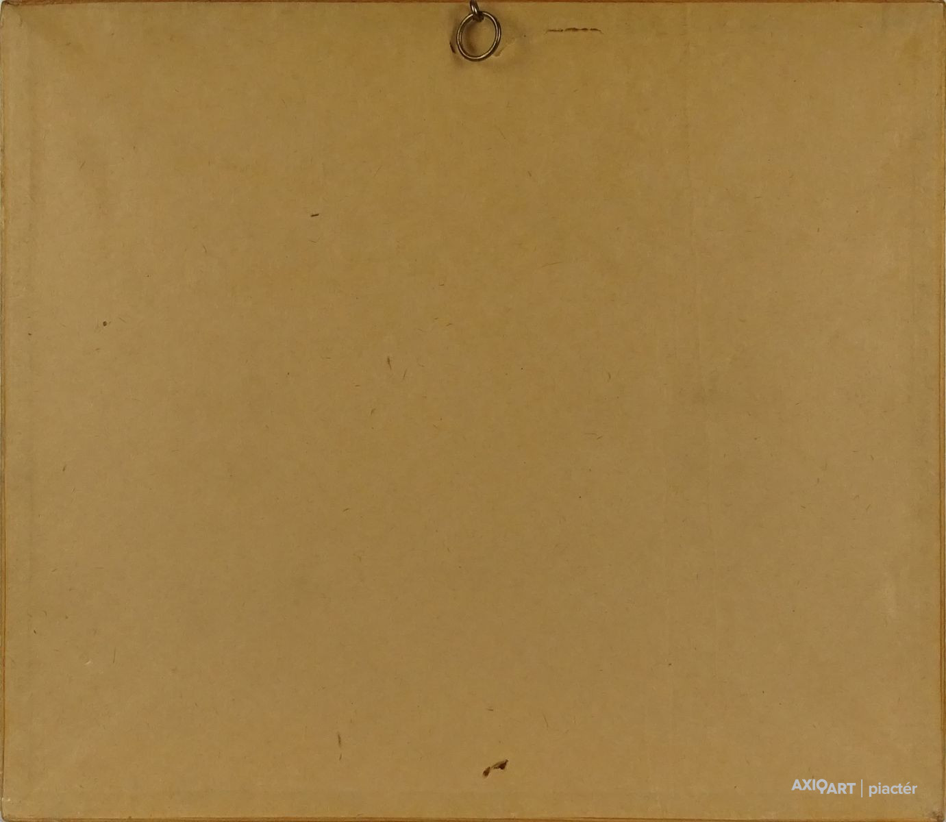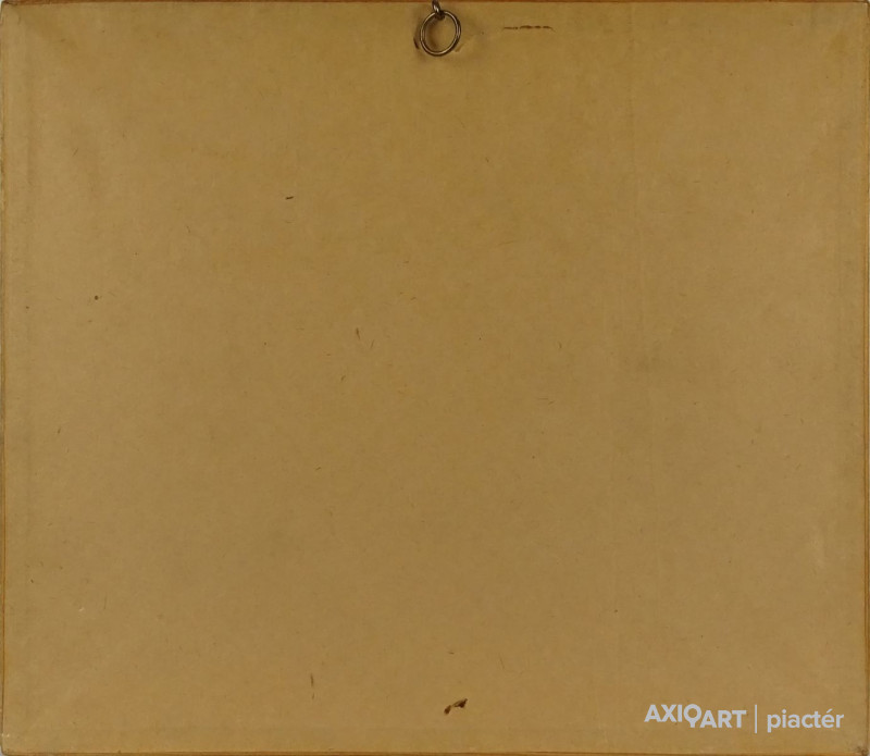 [1Y029/Z018] Olaj farost festmény, üveglap mögött, hibátlan képcsarnokos keretben. Hátoldalán Képcsarnok Vállalat papír címkéje: A művész neve: SCHÉNER MIHÁLY A kép címe: TÁJ Magasság: 66.5 cm Szélesség: 86 cm Súly: 6.54 kg Schéner Mihály festő, grafikus, szobrász, keramikus, bábtervező Medgyesegyháza, 1923-01-9 Elhalálozott: Budapest, 2009. május 11. Honlap: http://www.kormendigaleria.hu/kiadvany.html 1942-1947: Magyar Képzőművészeti Főiskola, tanára: Rudnay Gyula. 1978: Munkácsy-díj; 1984: érdemes művész; 1989: kiváló művész; 1995: Kossuth-díj. 1992-től a Magyar Művészeti Akadémia, 1993-tól a Széchenyi Irodalmi és Művészeti Akadémia tagja. 1956-ig tanított. 1982: Nagyatádi Faszobrász Alkotótelep, 1985: Nemzetközi Acélszobrász Alkotótelep, Dunaújváros. A stílusában felismerhető, mégis sokféle műtárgyat létrehozó ~ gazdag, állandóan alakuló életműve a folyton változó világban helyét kereső, az alkotói szabadságot megvalósító XX. századi képzőművész példázata lehetne. Magát expresszív-szürrealista alkotónak nevezi. Egyaránt dolgozik festékkel, textillel, fával, fémmel. Rajzol, szerkeszt, farag, épít, gyúr, varr és ragaszt, felhasználja a mézesbábok öntőformáit. Festő, rajzoló, textilszobor- és bábkészítő, fazekas, asztalos, esztergályos. Háromlépcsős folyamatban gondolkozik: rajzban tervez, majd fest, szobrot készít, “formába önt”, mindig a végső plasztikai megoldást keresi. Ami állandó és mégis játékosan változékony megjelenésű Schéner művészetében, az a gyermekkori emlékek által meghatározott népi mesterségek iránti tiszteletet kifejező motívumkincs, a tárgyi folklór formakészlete, amely már-már kézjegyként ismétlődik munkáin. Mitologikussá nőtt képzelete új lényeket teremt, pl: a Pigulát, amely disznótestű, emberfejű teremtmény. Schéner festményein a szürrealista motívumokat konstruktív szerkezetbe rendezi, a geometriát és az organikus természeti motívumokat egyaránt beépíti műveibe. A népi, népművészeti formakincsből merített lovas huszárok, betyárok, szegénylegények cifra szűr mentéje, piros csákója, fekete csizmája, az önálló életet élő zsinórdíszek és mézeskalács bábok, a kiskocsik a gyermekkori vásárok, búcsúk színes forgatagába vezet. A primér motívumokat aztán felváltják a vastagon felhordott felületbe karcolt jelek, vonalhálózatok, amelyek a játszó gyermek homokba rajzolt ábráit, a pásztorember fába vésett üzeneteit, az ősember barlang falába rótt mágikus jeleneteit idézik meg. A művész pillanatnyi érdeklődésének megfelelően a színek búvópatakként tűnnek el és jelennek meg ismét. A 60-as években leginkább a formákkal való játék érdekelte, a festmények felülete egyre gazdagodott: a táblaképek felületén applikációk jelentek meg, vagy lemállasztott rétegek hagyták maguk után hiányukat, motívumok nélküli ősformák, archetipikus képzetek bukkantak fel művészetében. A véletlenszerűnek látszó rétegekkel való játék azonban tudatos komponálás eredménye, amely később nyilvánvaló ritmusnak és formai szerkesztettségnek adja át a helyét, mint a Törvénytáblák c. sorozaton. A különböző művészi kifejezési formák egymásra termékenyítő hatással vannak, át- meg áthatják egymást. Textilszobrai, amelyekkel új műfajt teremtett, ugyanazzal az automatikus, expresszív-szürrealista módszerrel készülnek, mint festményei. A hagyományosan a népművészetben alkalmazott anyag, a filc lehetőséget ad a népi formakincs felelevenítésére, amely azonban a művész különös szürrealista átiratában jelenik meg. A szívekkel kivarrt, zsinórdíszes Posztókotlós c. művén mézesbábok lógnak, hátán huszárok lovagolnak. Egész sor textilből készült kéz-plasztikát alkot, amelyeket az ujjakra rávarrt díszekkel öltöztet, személyesít meg. A színes-különös világból aztán ~ újra puritán képi és formai rendbe juttatja el a nézőt, majd nemsokára tépett, gyűrt, vágott, csorgatott, repedezni hagyott szenvedélyesen vonagló képi felületeket hagy hátra. Schéner készített apró gyermekjátékokat, térstruktúra-tereket, mászókákat is. A magyar népi formák mellett szürreális játékaiban gyakran alkalmaz görög mitológiai alakokat, “elkentaurosodott” lovakat, Gorgó-fejeket, sellőket, hárpiákat, Pán-ábrázolásokat. Schéner nemcsak saját művészetéről publikál, hanem művésztársairól is számos írása jelenik meg, elsősorban az Új Auróra c. folyóiratban, amelynek egy ideig főmunkatársa volt. Irodalom kiállítása, Magyar Építőművészet, 1962/4. Húsz év után, Művészet, 1965/4. BOZÓKY M.: ~, Tiszatáj, 1968/5. PERNECZKY G.: Nincs uborkaszezon, Élet és Irodalom, 1969. augusztus 8. BARÁNSZKY-JÓB L.: ~, Művészet, 1969/9. LÁSZLÓ GY.: ~ kaposvári kiállítása, Jelenkor, 1969/4. MAJOR M.: Pásztorok, betyárok, huszárok - kezek, Tükör, 1970. szeptember 15. FRANK J.: Bemutatjuk ~t, Élet és Irodalom, 1972. május 6. ról kiállítása ürügyén, Képzőművészeti Almanach, Budapest, 1972 Sötétkék kokasok, Élet és Irodalom, 1973. szeptember 9. MAJOR M.: ~ játékai, Élet és Irodalom, 1974. július 27. BARTA J.: Egy különös művész, Alföld, 1974/6. VADAS J.: Szárnykészítők, Élet és Irodalom, 1975. október 4. JUHÁSZ F.: A halál ellen játszani, Élet és Irodalom, 1975. május 17. PAP G.: Kincsek és műkincsek, Művészet, 1975/6. P. SZŰCS J.: Az utak kettéválnak, Művészet, 1978/3. Békési művészet, Művészet, 1978/7. SZAMOSI F.: ~ [kismonográfia], Budapest, 1978 VADAS J.: Játék a játékkal, Élet és Irodalom, 1979. augusztus 18. NÉMETH L.: ~ műveiről, Művészet, 1979/4. MIKLÓS P.: Mit akar ez a múzeum?, Művésze