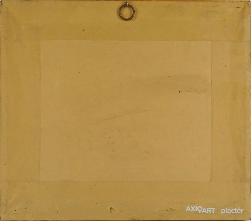 [1Y029/Z018] Olaj farost festmény, üveglap mögött, hibátlan képcsarnokos keretben. Hátoldalán Képcsarnok Vállalat papír címkéje: A művész neve: SCHÉNER MIHÁLY A kép címe: TÁJ Magasság: 66.5 cm Szélesség: 86 cm Súly: 6.54 kg Schéner Mihály festő, grafikus, szobrász, keramikus, bábtervező Medgyesegyháza, 1923-01-9 Elhalálozott: Budapest, 2009. május 11. Honlap: http://www.kormendigaleria.hu/kiadvany.html 1942-1947: Magyar Képzőművészeti Főiskola, tanára: Rudnay Gyula. 1978: Munkácsy-díj; 1984: érdemes művész; 1989: kiváló művész; 1995: Kossuth-díj. 1992-től a Magyar Művészeti Akadémia, 1993-tól a Széchenyi Irodalmi és Művészeti Akadémia tagja. 1956-ig tanított. 1982: Nagyatádi Faszobrász Alkotótelep, 1985: Nemzetközi Acélszobrász Alkotótelep, Dunaújváros. A stílusában felismerhető, mégis sokféle műtárgyat létrehozó ~ gazdag, állandóan alakuló életműve a folyton változó világban helyét kereső, az alkotói szabadságot megvalósító XX. századi képzőművész példázata lehetne. Magát expresszív-szürrealista alkotónak nevezi. Egyaránt dolgozik festékkel, textillel, fával, fémmel. Rajzol, szerkeszt, farag, épít, gyúr, varr és ragaszt, felhasználja a mézesbábok öntőformáit. Festő, rajzoló, textilszobor- és bábkészítő, fazekas, asztalos, esztergályos. Háromlépcsős folyamatban gondolkozik: rajzban tervez, majd fest, szobrot készít, “formába önt”, mindig a végső plasztikai megoldást keresi. Ami állandó és mégis játékosan változékony megjelenésű Schéner művészetében, az a gyermekkori emlékek által meghatározott népi mesterségek iránti tiszteletet kifejező motívumkincs, a tárgyi folklór formakészlete, amely már-már kézjegyként ismétlődik munkáin. Mitologikussá nőtt képzelete új lényeket teremt, pl: a Pigulát, amely disznótestű, emberfejű teremtmény. Schéner festményein a szürrealista motívumokat konstruktív szerkezetbe rendezi, a geometriát és az organikus természeti motívumokat egyaránt beépíti műveibe. A népi, népművészeti formakincsből merített lovas huszárok, betyárok, szegénylegények cifra szűr mentéje, piros csákója, fekete csizmája, az önálló életet élő zsinórdíszek és mézeskalács bábok, a kiskocsik a gyermekkori vásárok, búcsúk színes forgatagába vezet. A primér motívumokat aztán felváltják a vastagon felhordott felületbe karcolt jelek, vonalhálózatok, amelyek a játszó gyermek homokba rajzolt ábráit, a pásztorember fába vésett üzeneteit, az ősember barlang falába rótt mágikus jeleneteit idézik meg. A művész pillanatnyi érdeklődésének megfelelően a színek búvópatakként tűnnek el és jelennek meg ismét. A 60-as években leginkább a formákkal való játék érdekelte, a festmények felülete egyre gazdagodott: a táblaképek felületén applikációk jelentek meg, vagy lemállasztott rétegek hagyták maguk után hiányukat, motívumok nélküli ősformák, archetipikus képzetek bukkantak fel művészetében. A véletlenszerűnek látszó rétegekkel való játék azonban tudatos komponálás eredménye, amely később nyilvánvaló ritmusnak és formai szerkesztettségnek adja át a helyét, mint a Törvénytáblák c. sorozaton. A különböző művészi kifejezési formák egymásra termékenyítő hatással vannak, át- meg áthatják egymást. Textilszobrai, amelyekkel új műfajt teremtett, ugyanazzal az automatikus, expresszív-szürrealista módszerrel készülnek, mint festményei. A hagyományosan a népművészetben alkalmazott anyag, a filc lehetőséget ad a népi formakincs felelevenítésére, amely azonban a művész különös szürrealista átiratában jelenik meg. A szívekkel kivarrt, zsinórdíszes Posztókotlós c. művén mézesbábok lógnak, hátán huszárok lovagolnak. Egész sor textilből készült kéz-plasztikát alkot, amelyeket az ujjakra rávarrt díszekkel öltöztet, személyesít meg. A színes-különös világból aztán ~ újra puritán képi és formai rendbe juttatja el a nézőt, majd nemsokára tépett, gyűrt, vágott, csorgatott, repedezni hagyott szenvedélyesen vonagló képi felületeket hagy hátra. Schéner készített apró gyermekjátékokat, térstruktúra-tereket, mászókákat is. A magyar népi formák mellett szürreális játékaiban gyakran alkalmaz görög mitológiai alakokat, “elkentaurosodott” lovakat, Gorgó-fejeket, sellőket, hárpiákat, Pán-ábrázolásokat. Schéner nemcsak saját művészetéről publikál, hanem művésztársairól is számos írása jelenik meg, elsősorban az Új Auróra c. folyóiratban, amelynek egy ideig főmunkatársa volt. Irodalom kiállítása, Magyar Építőművészet, 1962/4. Húsz év után, Művészet, 1965/4. BOZÓKY M.: ~, Tiszatáj, 1968/5. PERNECZKY G.: Nincs uborkaszezon, Élet és Irodalom, 1969. augusztus 8. BARÁNSZKY-JÓB L.: ~, Művészet, 1969/9. LÁSZLÓ GY.: ~ kaposvári kiállítása, Jelenkor, 1969/4. MAJOR M.: Pásztorok, betyárok, huszárok - kezek, Tükör, 1970. szeptember 15. FRANK J.: Bemutatjuk ~t, Élet és Irodalom, 1972. május 6. ról kiállítása ürügyén, Képzőművészeti Almanach, Budapest, 1972 Sötétkék kokasok, Élet és Irodalom, 1973. szeptember 9. MAJOR M.: ~ játékai, Élet és Irodalom, 1974. július 27. BARTA J.: Egy különös művész, Alföld, 1974/6. VADAS J.: Szárnykészítők, Élet és Irodalom, 1975. október 4. JUHÁSZ F.: A halál ellen játszani, Élet és Irodalom, 1975. május 17. PAP G.: Kincsek és műkincsek, Művészet, 1975/6. P. SZŰCS J.: Az utak kettéválnak, Művészet, 1978/3. Békési művészet, Művészet, 1978/7. SZAMOSI F.: ~ [kismonográfia], Budapest, 1978 VADAS J.: Játék a játékkal, Élet és Irodalom, 1979. augusztus 18. NÉMETH L.: ~ műveiről, Művészet, 1979/4. MIKLÓS P.: Mit akar ez a múzeum?, Művésze