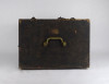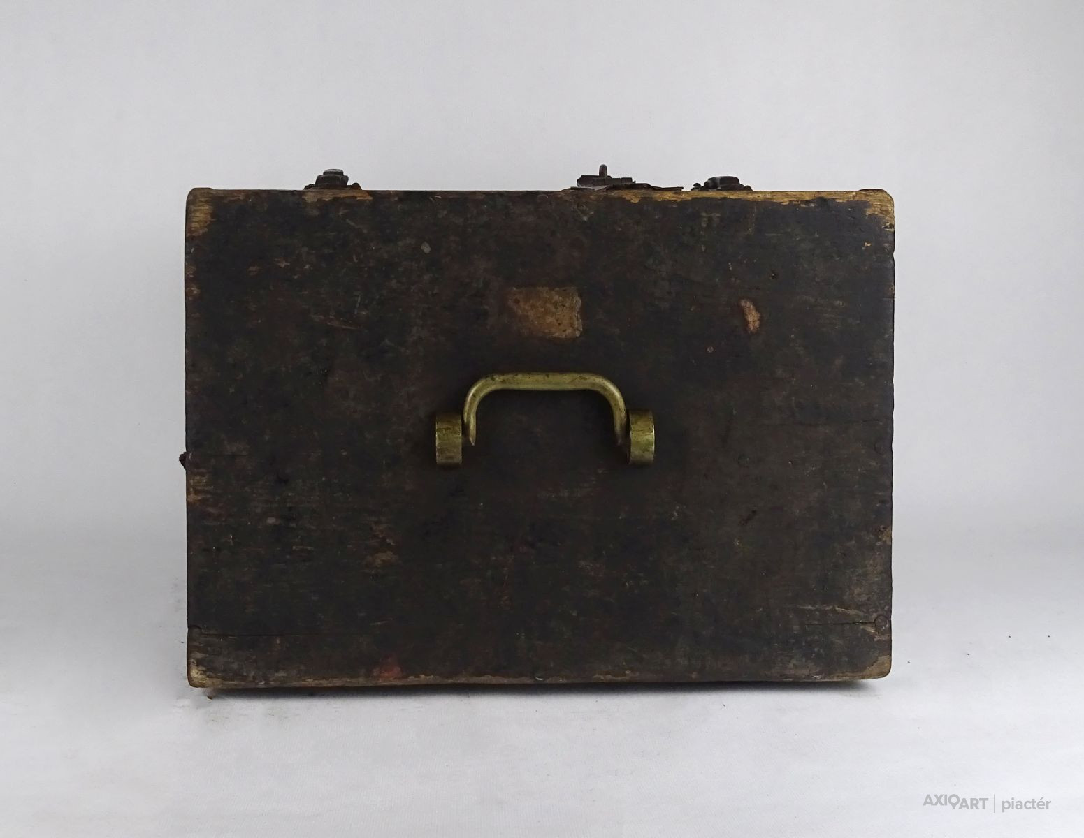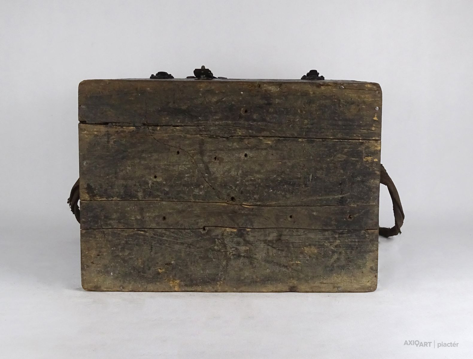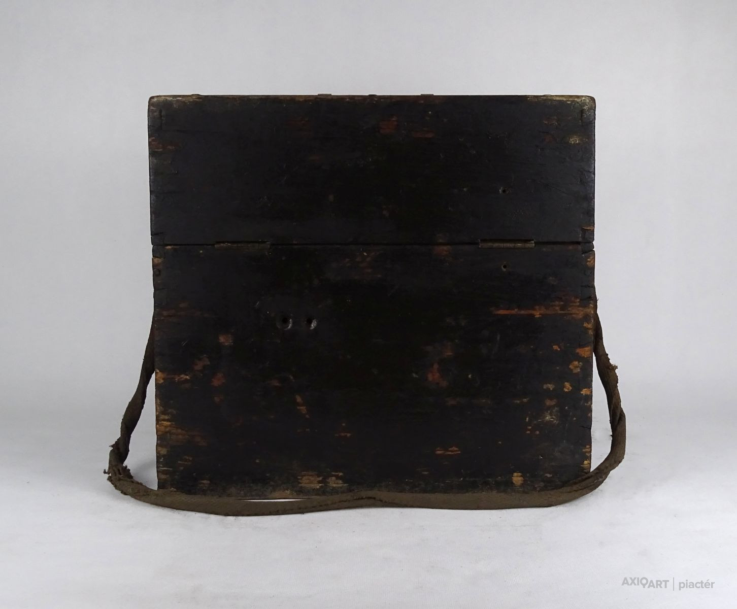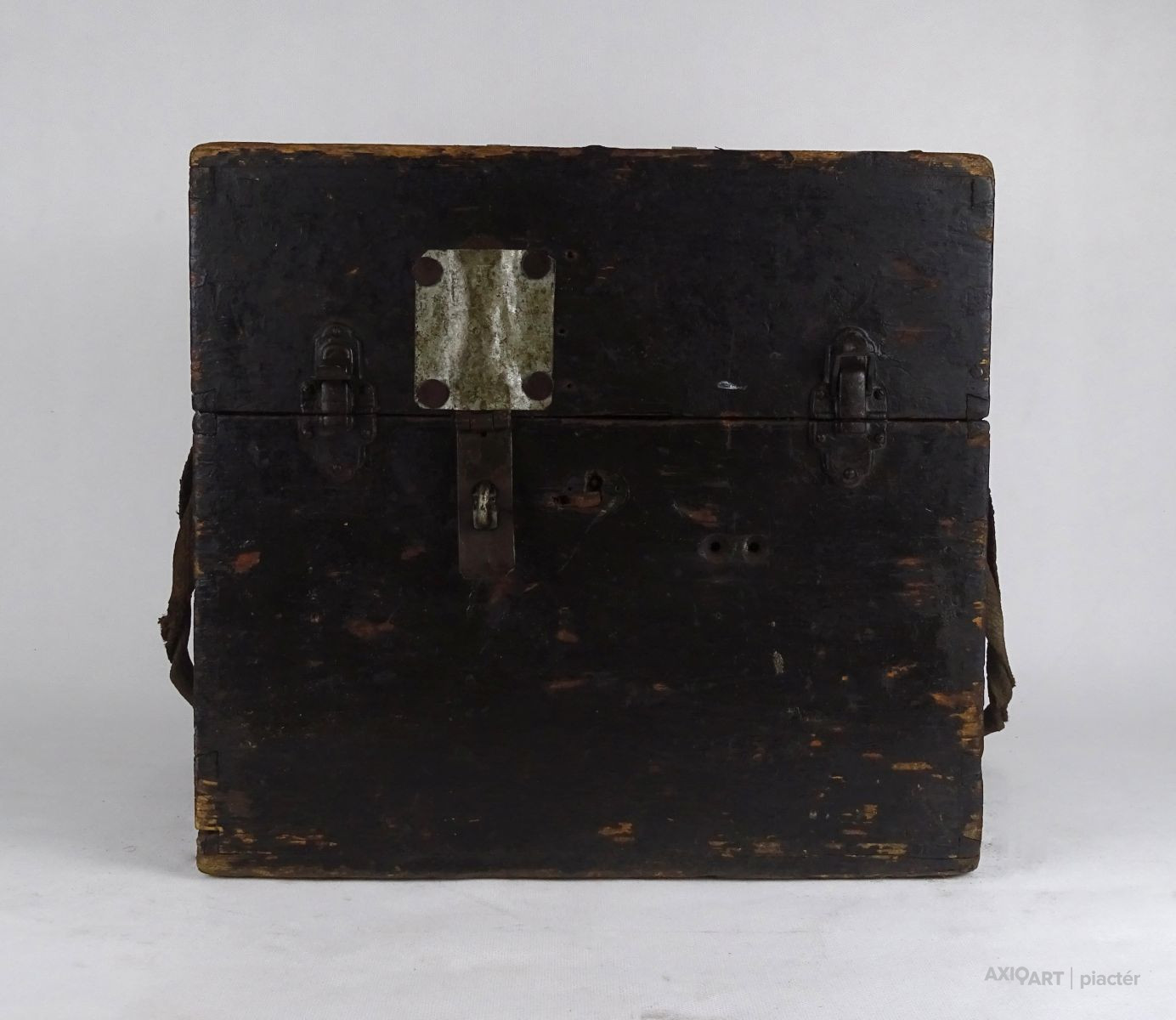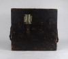 Régi, nagyméretű, fából készült, réz hord füllel és vállpánttal rendelkező doboz, fadoboz, műszerdoboz. Zárható.