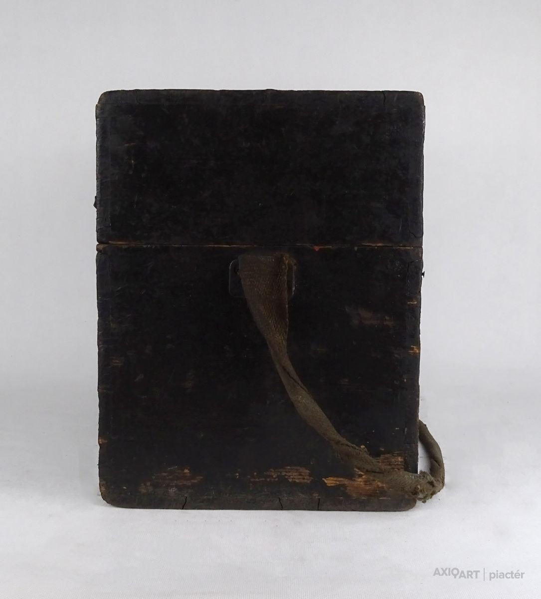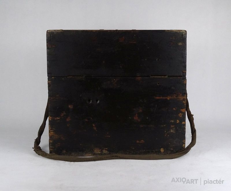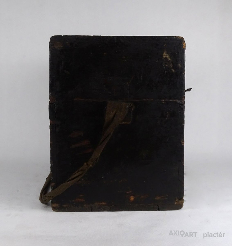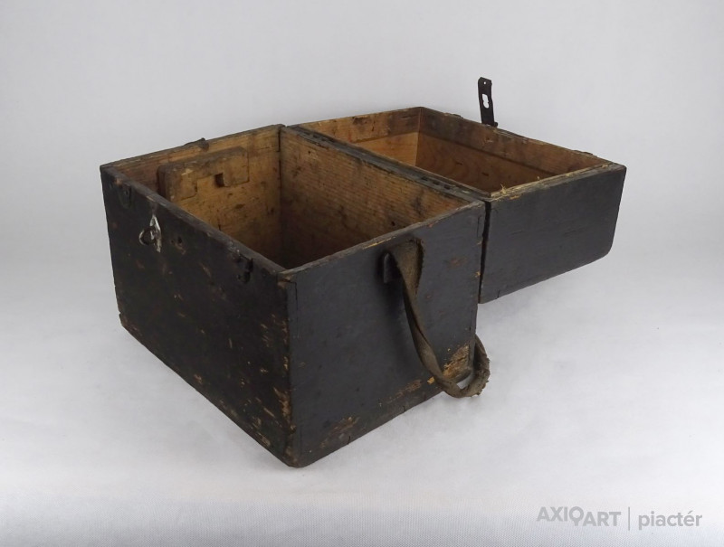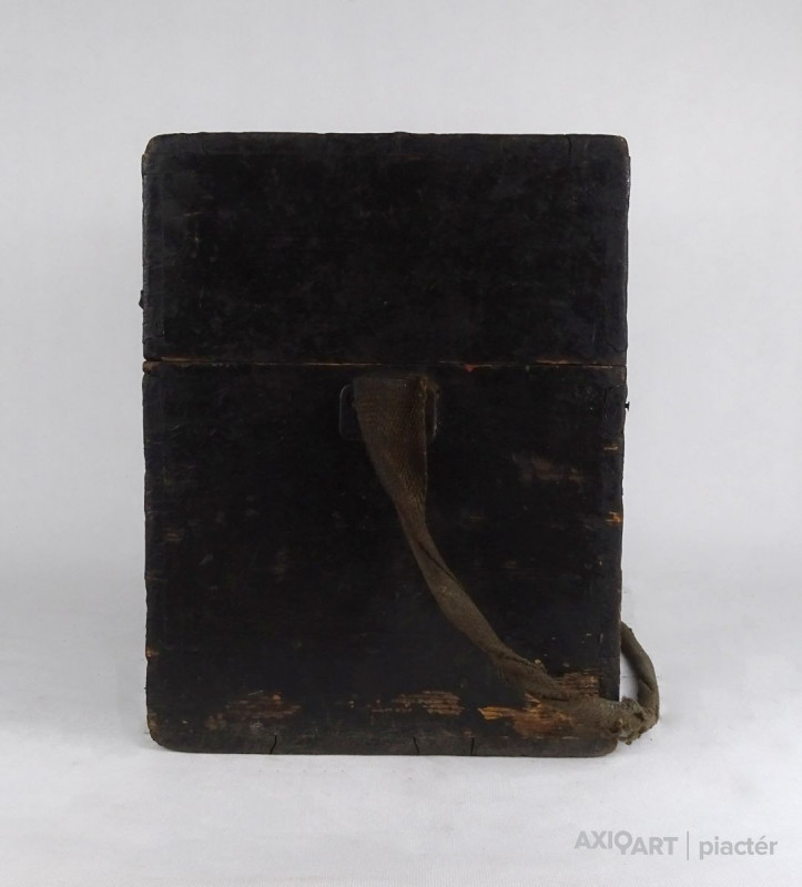 [1T063/KCS] Régi, nagyméretű, fából készült, réz hord füllel és vállpánttal rendelkező doboz, fadoboz, műszerdoboz. Zárható. Fedelében beleragasztott papír található, rajta felirat: 1875 SZÁMÚ EGYETEMES SZINTEZŐ MŰSZER ... BUDAPEST, 1909 FEBRUÁR 10 SÜSS NÁNDOR FÉLE PRÄCIS MECHANIKAI INTÉZET Magasság: 35 cm Szélesség: 27 cm Hosszúság: 37.5 cm Súly: 3.99 kg Süss Nándor Süss Nándor Született Ferdinand Suess 1848. szeptember 25. Marburg Elhunyt 1921. április 1. (72 évesen) Budapest Állampolgársága magyar Nemzetisége magyar Foglalkozása gépészmérnök tanár üzletember Sírhelye Farkasréti temető (6/A (6/15)-1-161) Süss Nándor (Marburg, Hessen tartomány, Németország, 1848. szeptember 25. – Budapest, 1921. április 1.) német származású mechanikus, a magyarországi műszerészképzés és finommechanikai ipar megteremtője, az egykori Magyar Optikai Művek jogelődjének alapítója.  Életpályája Magyarországon A kezdetek 1876-ban, 28 évesen érkezett Kolozsvárra, hogy az egyetemen felállítandó Mechanikusi Állomást megszervezze. Az ott kialakított műhelyben kezdte el az egyetemi oktatáshoz és a kutatáshoz szükséges kísérleti eszközök készítését. 1884-ben megbízták a Budapesten akkor létesített Állami Mechanikai Tanműhely (VI. Mozsár u. 8.) vezetésével, mely az ország első műszerész szakiskolája volt, emellett azonban megrendeléseket is vállalt. Süss kinevezését Eötvös Loránd ajánlotta, aki azután maga is tőle rendelte műszereit, Süss készítette többek között a később világhírűvé lett torziós ingáit is. Az intézet gyorsan fejlődött, termékeit szerződés alapján az akkori idők egyik jó nevű kereskedőcége, a Calderoni és Tsa értékesítette. Süss műszerei több hazai és külföldi kiállításon sikerrel szerepeltek. Az 1896. évi millenniumi kiállításon az intézet fizikaoktatást segítő- és más taneszközein kívül számos geodéziai, erdészeti és egyéb műszerét is kiállították. Az 1900. évi párizsi világkiállításon egyik szintezőműszerüket aranyéremmel tüntették ki.  Saját vállalat élén  Ugyanebben az 1900-as évben a tanműhelyt megszüntették. Süss Nándor Budán magánvállalatot alapított (Süss Nándor-féle Precíziós Mechanikai Intézet), ahol műszerfejlesztői tevékenységét és – rövid idő múlva – a szakemberképzést is folytathatta. Öt évvel később vállalatát a XII. ker. Csörsz utcában épített gyárépületbe helyezte át, ahol az önálló kutatómunka elősegítésére kísérleti laboratóriumot létesített. Ebben az időben ő maga is több találmányra kapott szabadalmat. A tudomány, az ipar és a közlekedés gyors fejlődése a századelőn egyre újabb és egyre pontosabb műszereket igényelt. A gyár hagyományossá vált, ismert termékei voltak a távcsöves geodéziai műszerek – teodolitok és különféle szintezők –, melyeket térképezésnél, híd- és vasútépítésnél mérésekre, kitűzésre használtak. Geodéziai rendeltetésű gyártmányok mellett nagy számban készültek erdészeti, bányászati, majd később katonai műszerek, távcsövek, valamint iskolai szemléltető és kísérleti célú eszközök is.  Vállalatának sorsa Süss 1918-ban visszavonult, vállalatát részvénytársasággá alakították át. Halálának évében, 1921-ben német licenc átvételével bevezették az optikai üvegek csiszolást és – az önálló kutatási tevékenységgel jórészt felhagyva – korszerűsítették a termelést. A következő évben megkezdték az Eötvös-inga exportra készülő gyártását. Süss Nándor gyárából fokozatosan a hazai optikai- és finommechanikai ipar meghatározó vállalata lett, melynek nevét az 1930-as évek végén Magyar Optikai Művekre (MOM) változtatták. A MOM egészen a rendszerváltásig sikerrel állta a történelem és a szocialista tervgazdálkodás meg-megújuló viharait, majd az eladósodott vállalatot részekre bontották és megszüntették.    Forrás: wikipédia