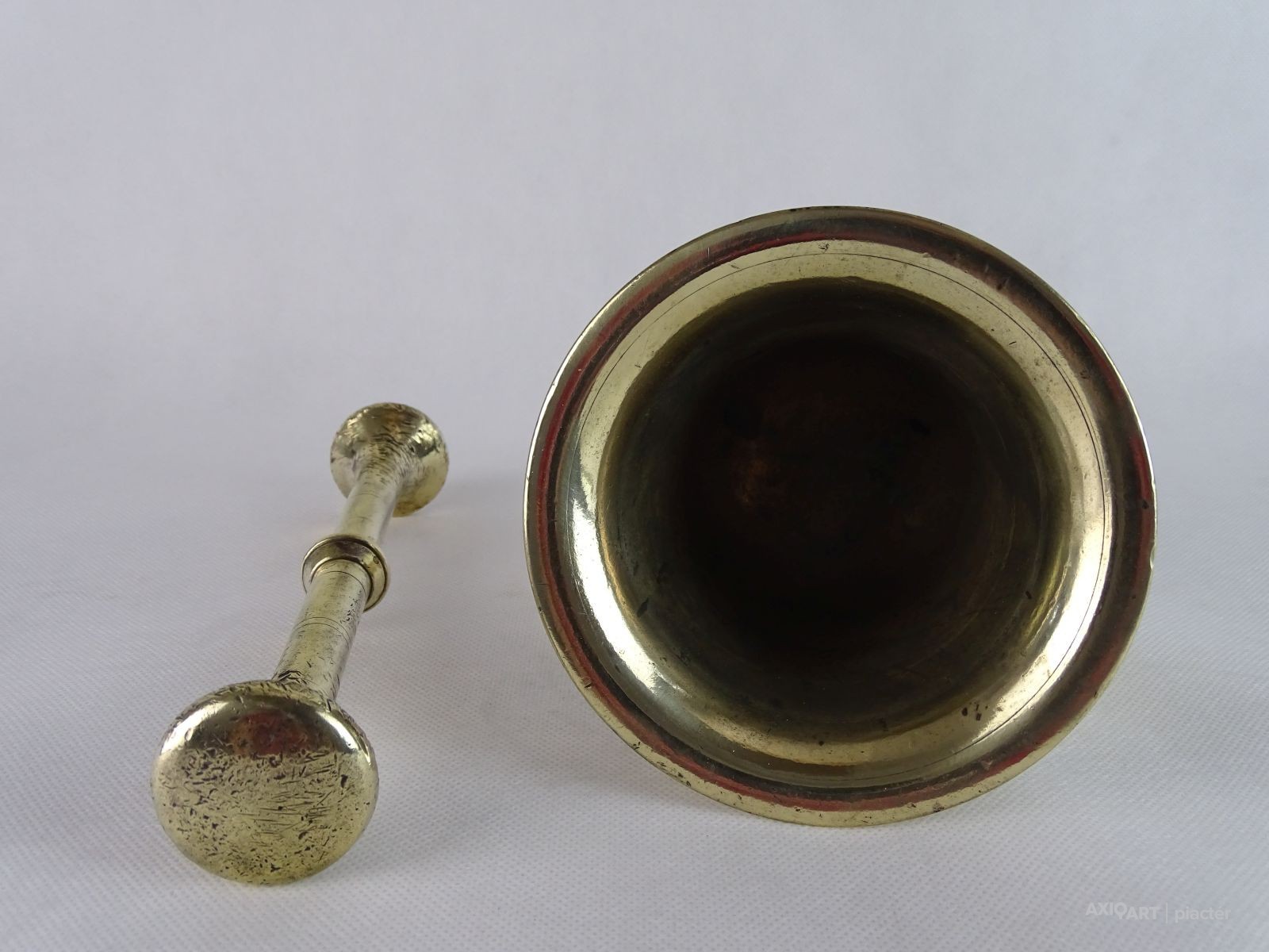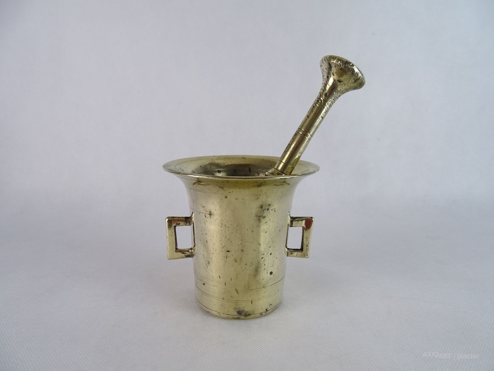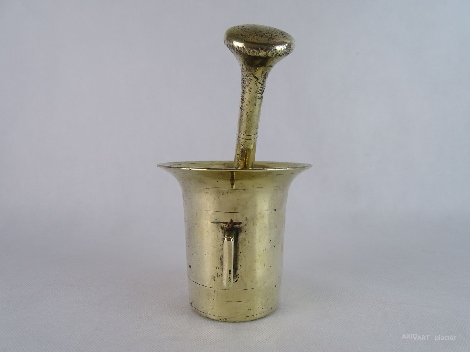 Régi, szögletes fülű, nagy méretű réz mozsár törővel. Dísznek és használatra egyaránt tökéletes.