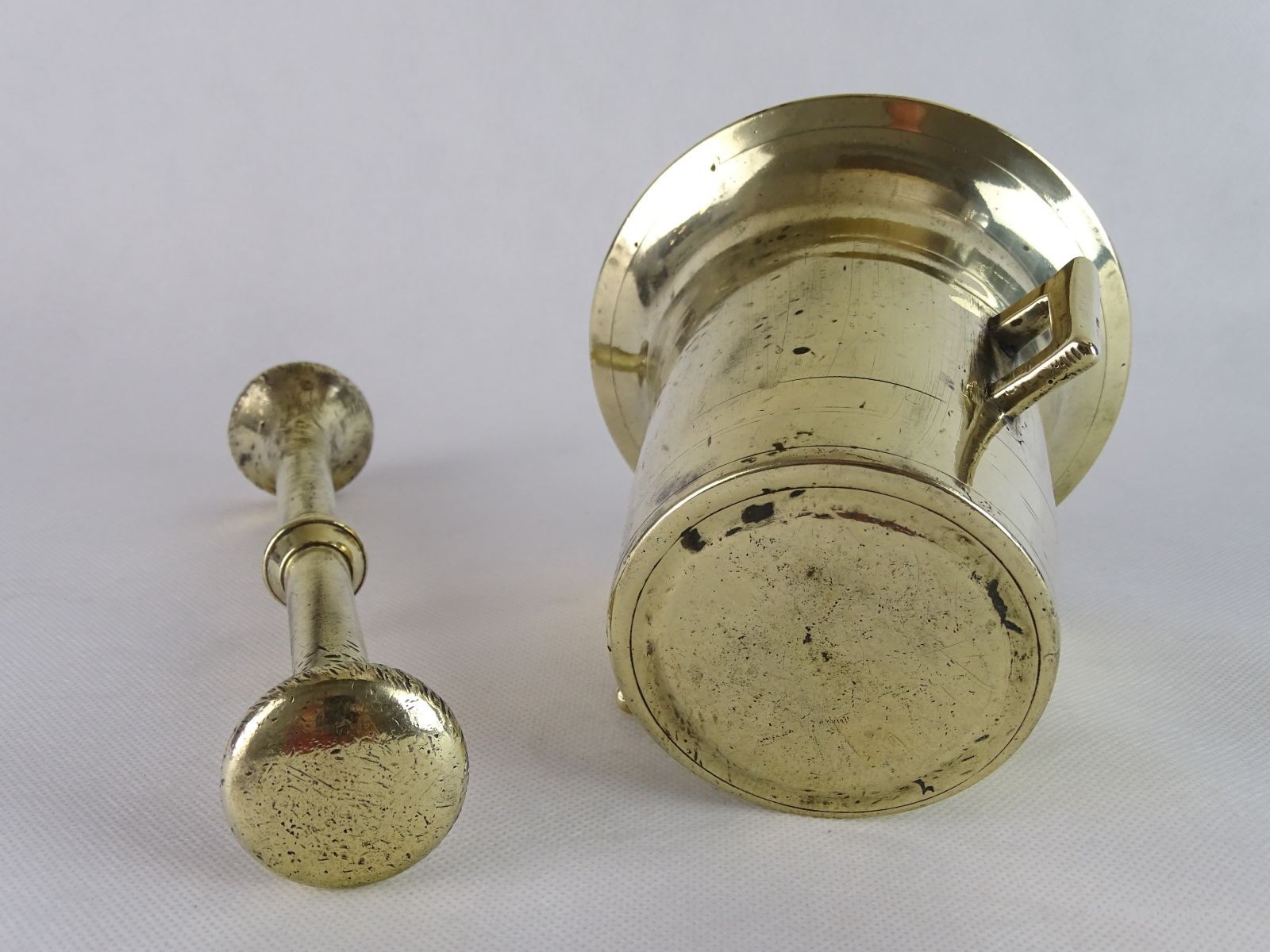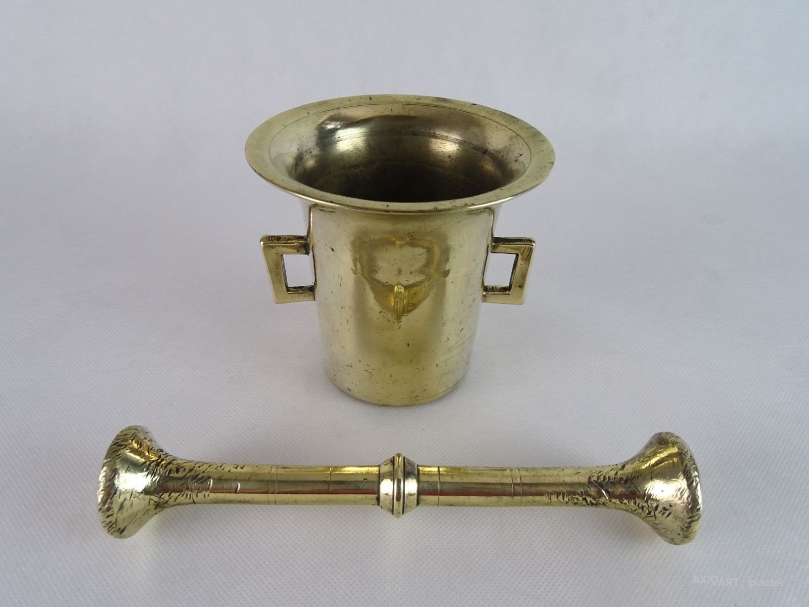 [0L629/X216] Régi, szögletes fülű, nagy méretű réz mozsár törővel. Dísznek és használatra egyaránt tökéletes. Gyönyörű, felpucolt, ajándékozható állapotban! Magasság: 13 cm Szélesség: 13.8 cm Súly: 2.565 kg   A mozsár magassága 11 cm. Legnagyobb átmérője 12,5 cm. A törő hossza 18,5 cm.
