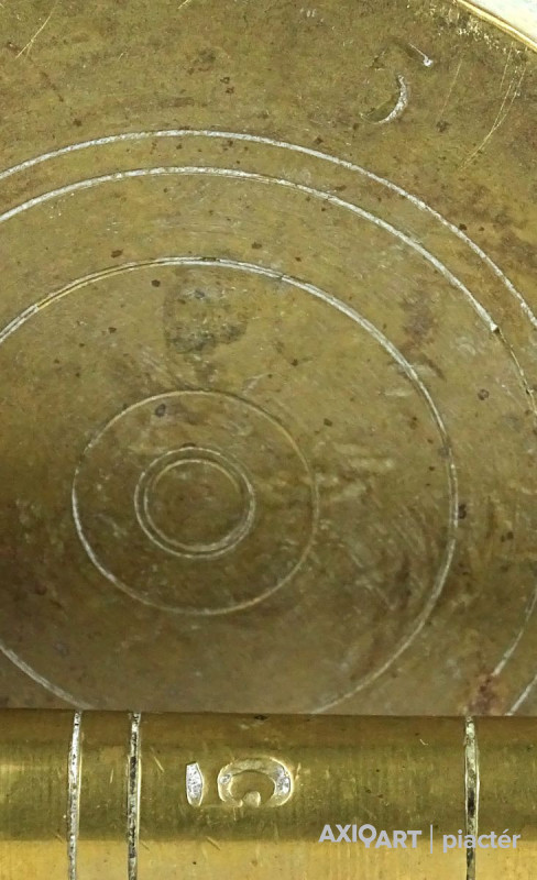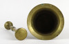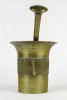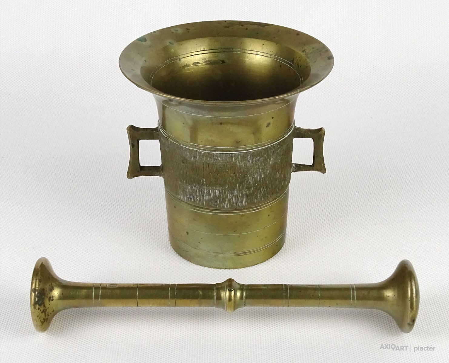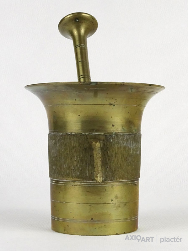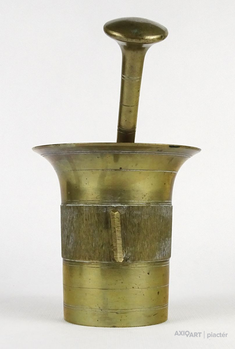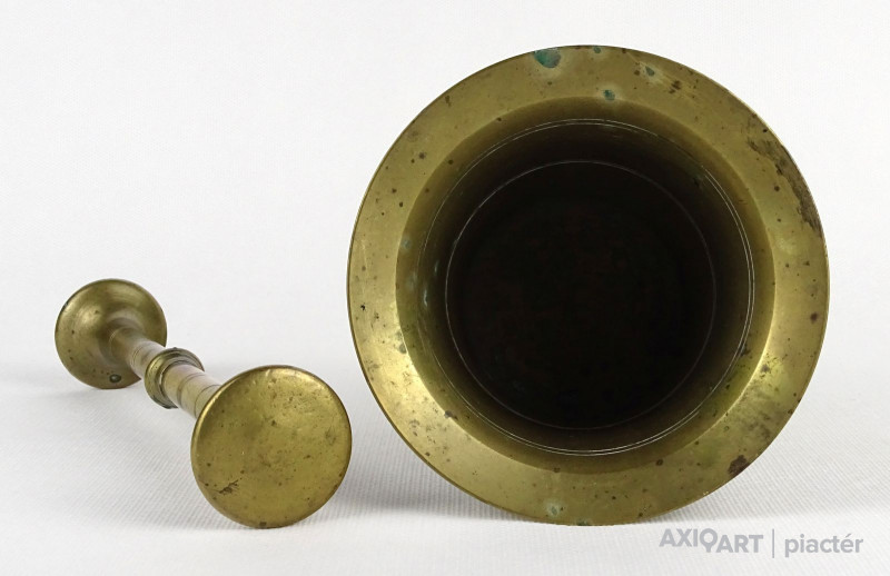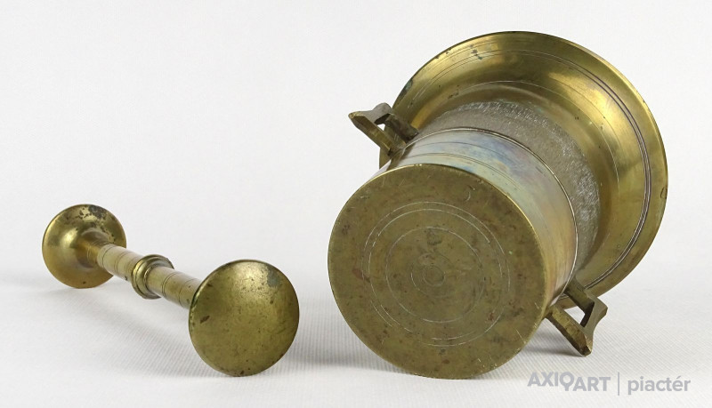 [1P214/X216] Antik, szép állapotú, szögletes fülű réz mozsár. Dísznek és használatra egyaránt tökéletes. A mozsár alján és a törőn méret jelölés: 5 Magasság: 11.7 cm Szélesség: 11.7 cm Súly: 1.11 kg   A mozsár magassága 11 cm. Legnagyobb átmérője 12,5 cm. A törő hossza 18,5 cm.