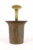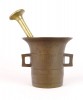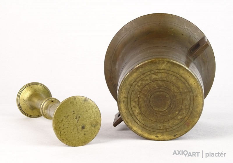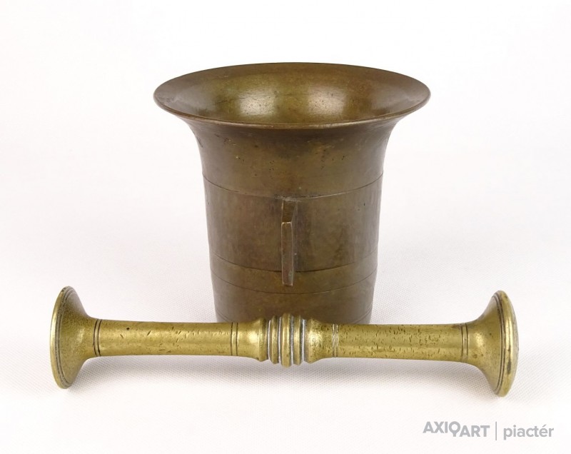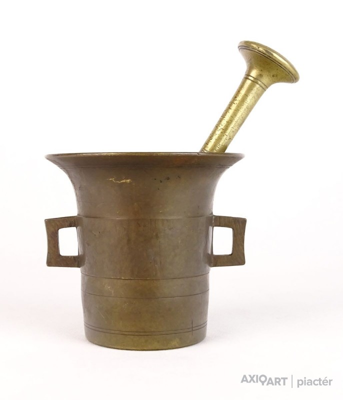 [0U164/X305] Antik, szép állapotú, szögletes fülű réz mozsár. Dísznek és használatra egyaránt tökéletes. A törőn méret jelölés: 4 Magasság: 12.3 cm Szélesség: 13.5 cm Súly: 2.075 kg   A mozsár magassága 11 cm. Legnagyobb átmérője 12,5 cm. A törő hossza 18,5 cm.