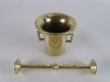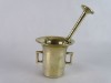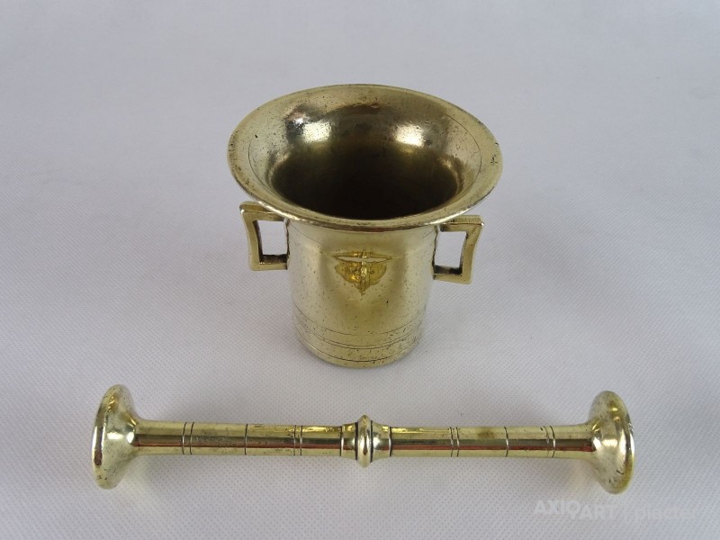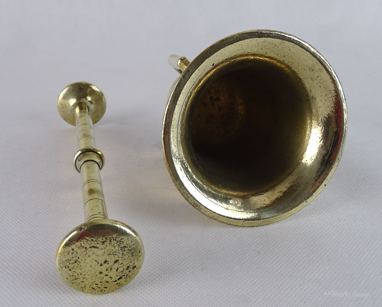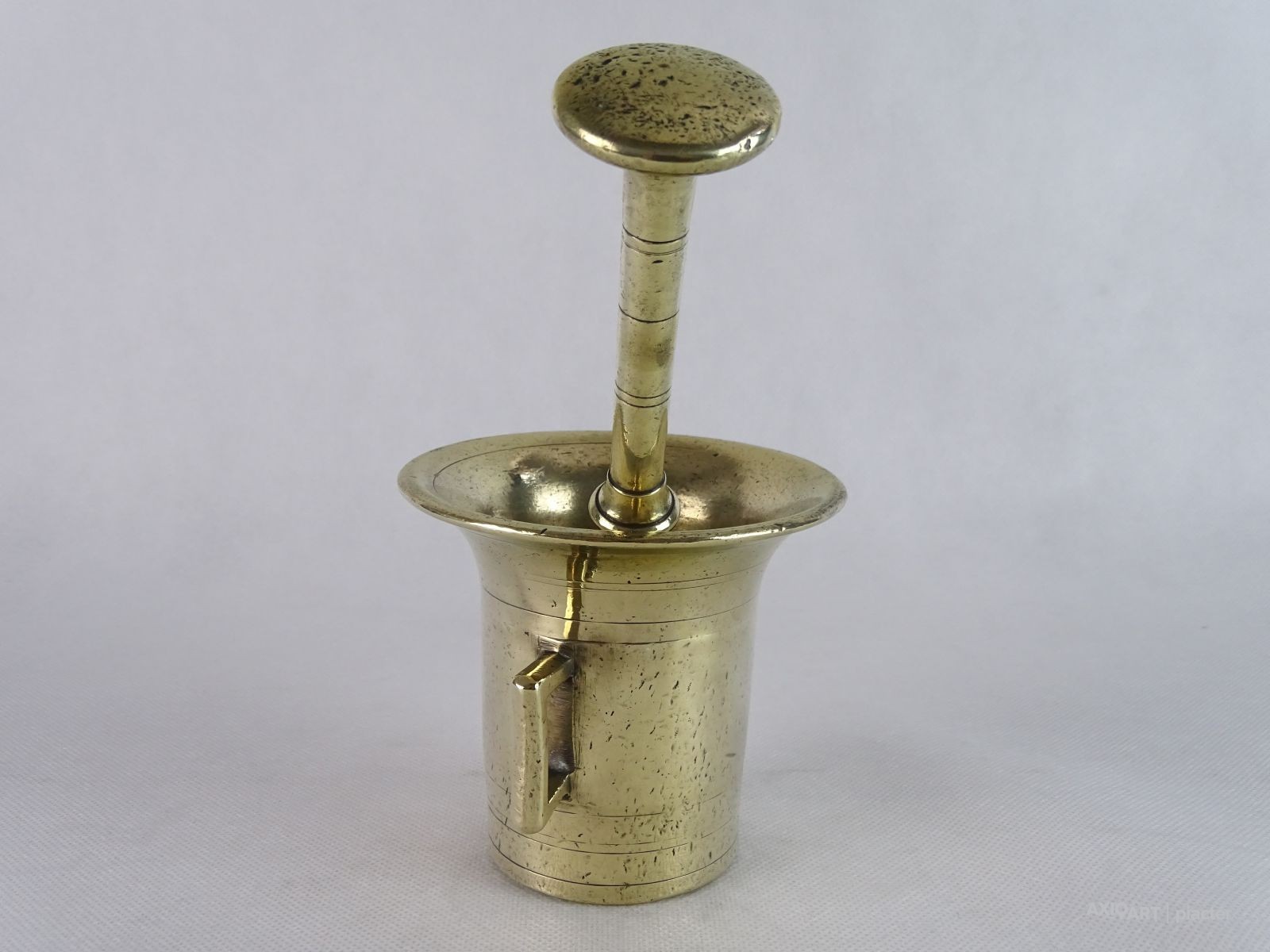 Régi, kisméretű, szögletes fülű réz mozsár törővel. Dísznek és használatra egyaránt tökéletes.