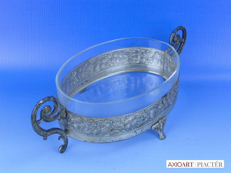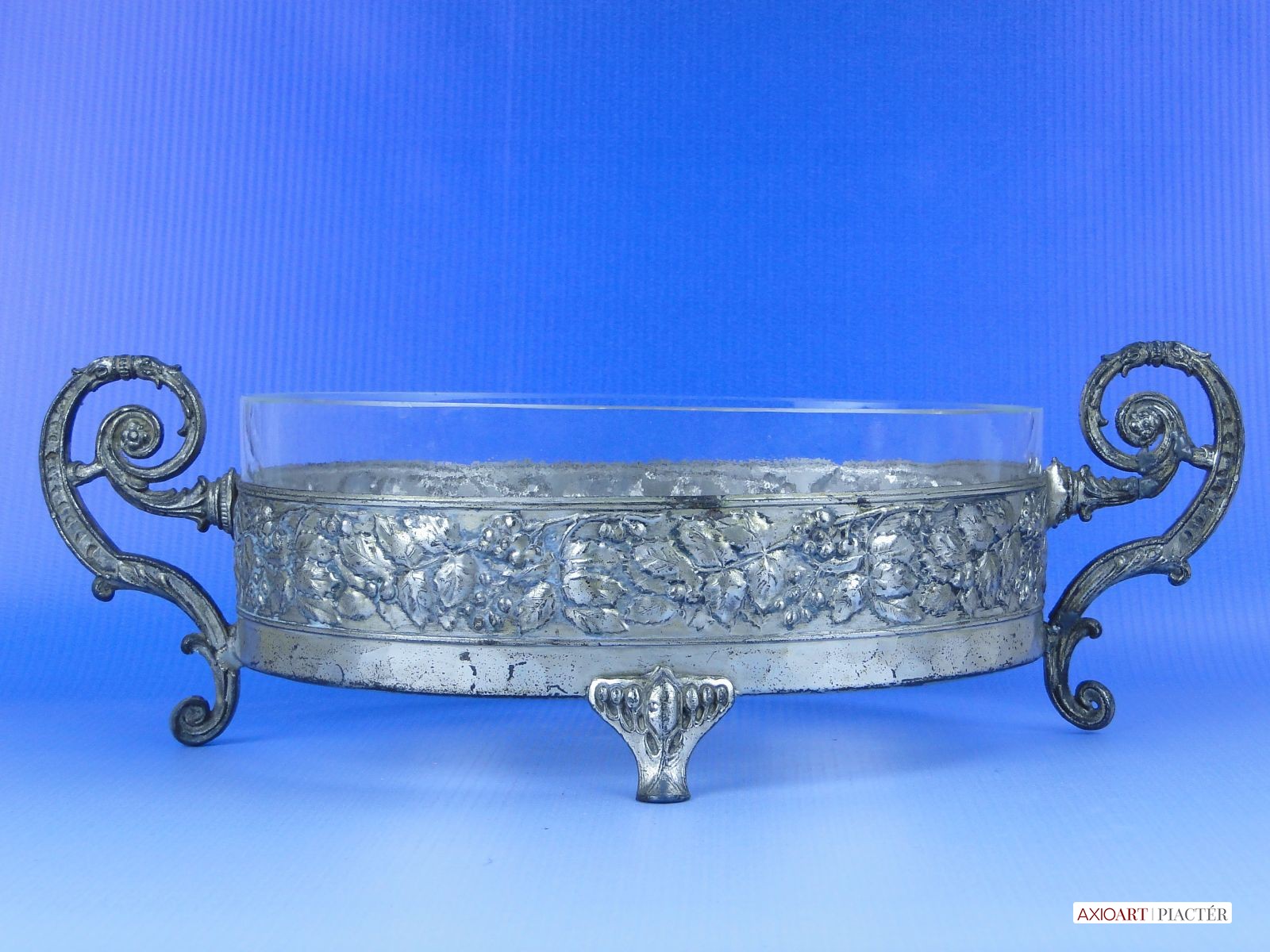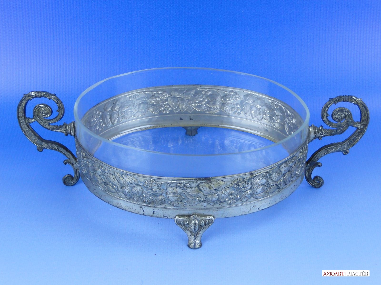 Ovális alakú, szőlőlevél, szőlőfürt mintákkal díszített szecessziós lábakon álló üvegbetétes asztalközép kínáló, gyümölcskínáló.