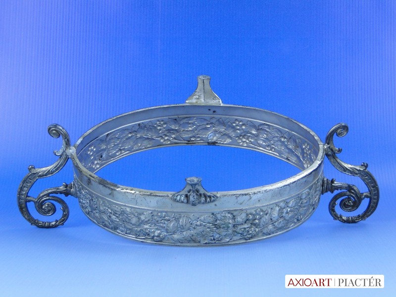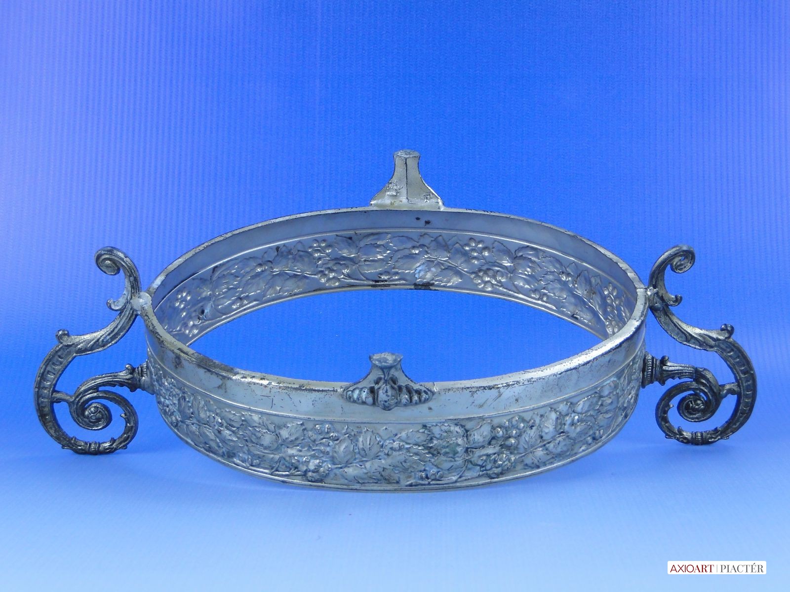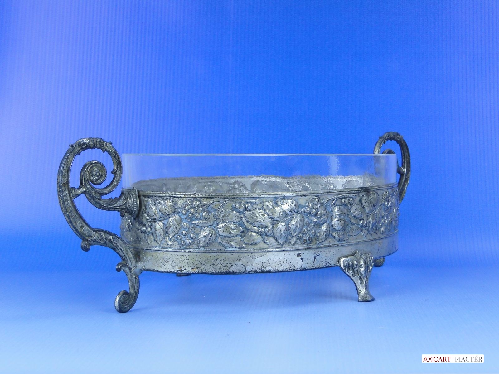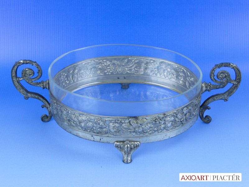 Ovális alakú, szőlőlevél, szőlőfürt mintákkal díszített szecessziós lábakon álló üvegbetétes asztalközép kínáló, gyümölcskínáló.