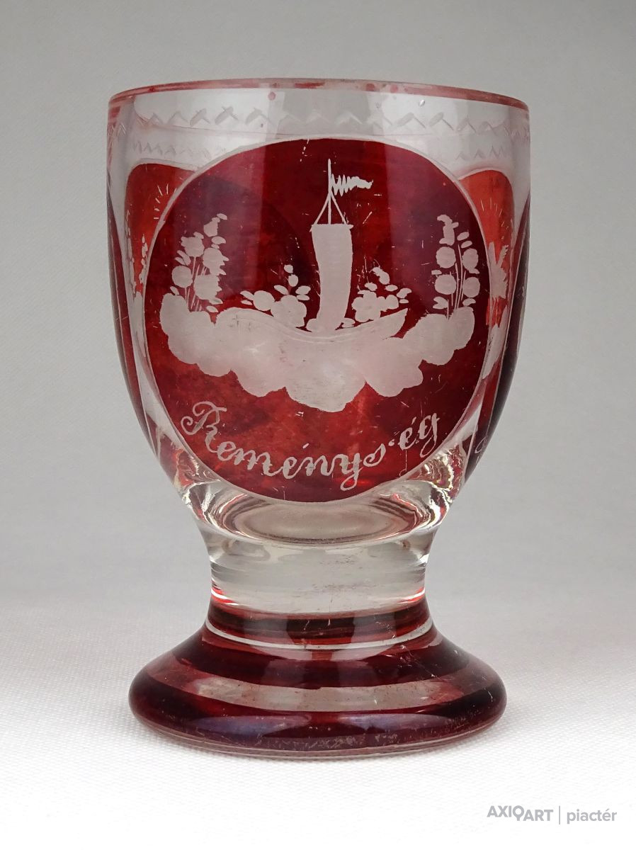 Antik talpas Biedermeier bíborpácolt pohár HIT - SZERETET - REMÉNYSÉG