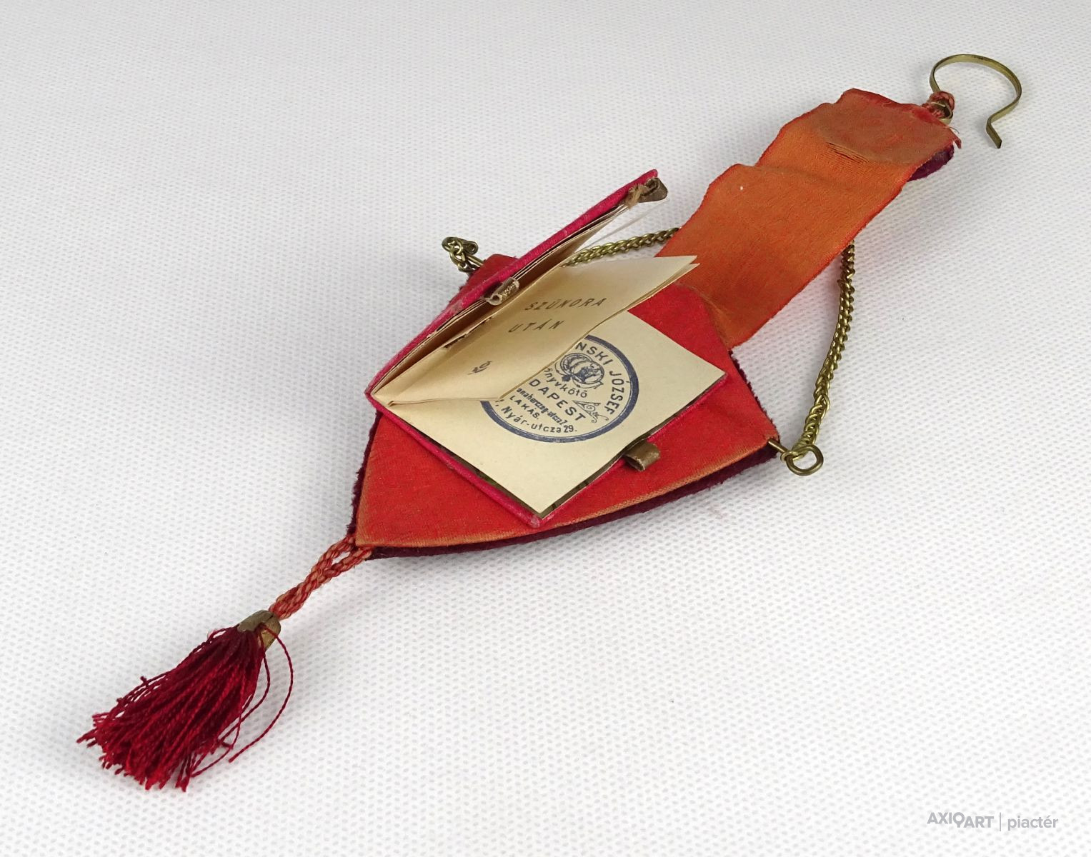 Régi, különleges, akasztóval rendelkező réz oroszlán fejjel és lánccal díszített táncrend füzet, fotón látható állapotban.