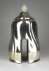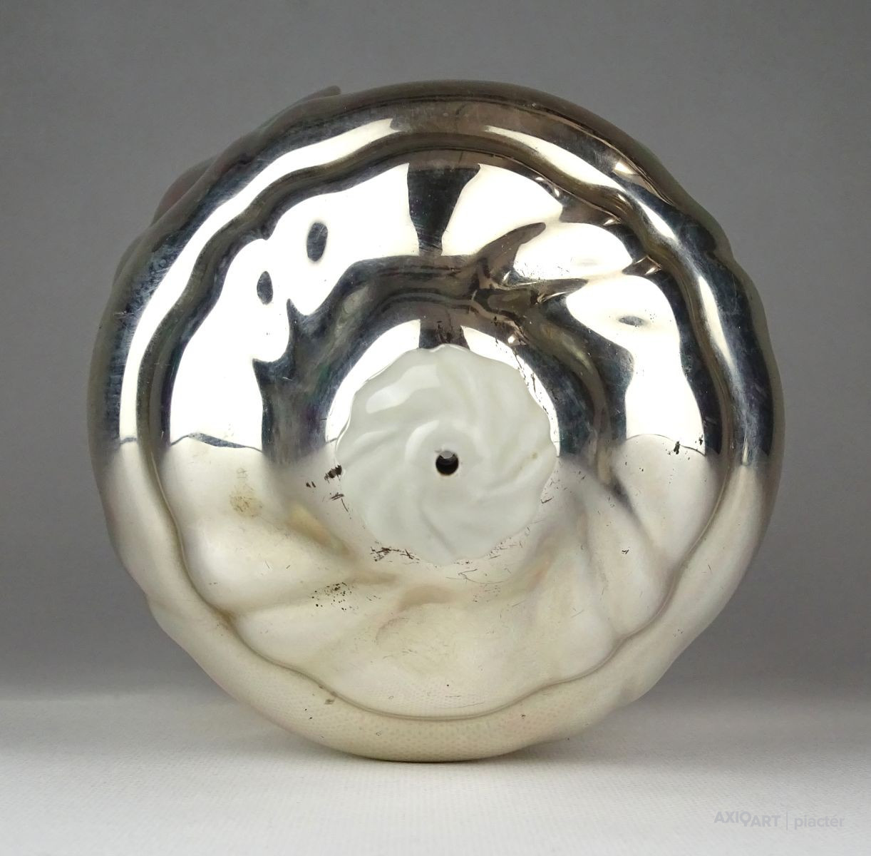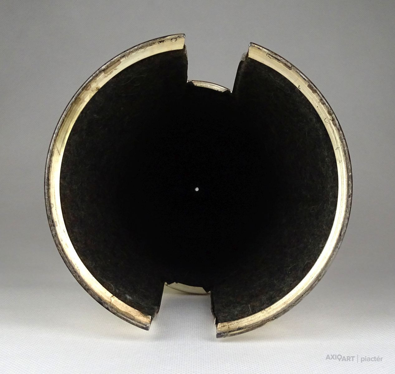 Antik nagy méretű porcelán fogantyús teáskanna, kávéskanna melegen tartó fedő. Belseje hőszigetelő filccel bélelt. A fedő két oldalán nyitott. Egyik oldalán a kiöntő füle, másik oldalán a kiömlő nyúlvány helye látható.