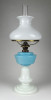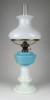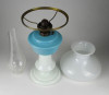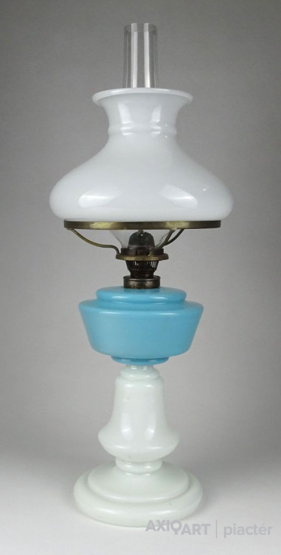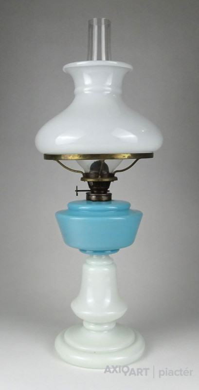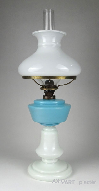Antik hibátlan állapotú tejfehér és kék üveg petróleum lámpa. Hibátlan cilinderrel és tejfehér burával rendelkezik.