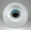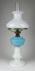 [1L977/UZ-N] Antik hibátlan állapotú tejfehér és kék üveg petróleum lámpa. Hibátlan cilinderrel és tejfehér burával rendelkezik. A kanócot hajtó réz forgatható szabályzón felirat: LÁMPAGYÁR BUDAPEST TRADE MARK Magasság: 47 cm Szélesség: 17.5 cm Súly: 1.185 kg