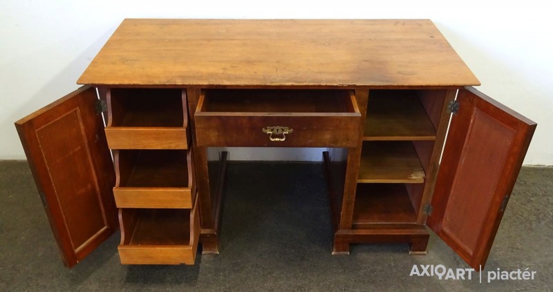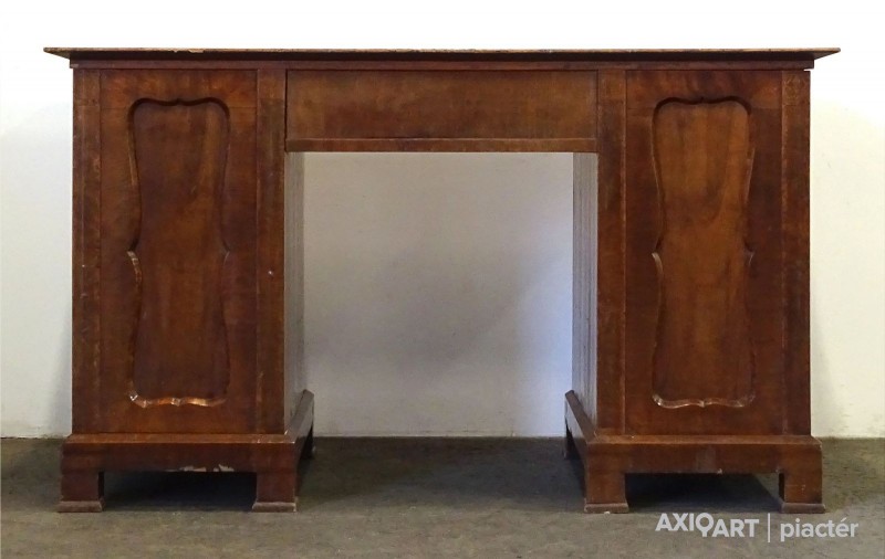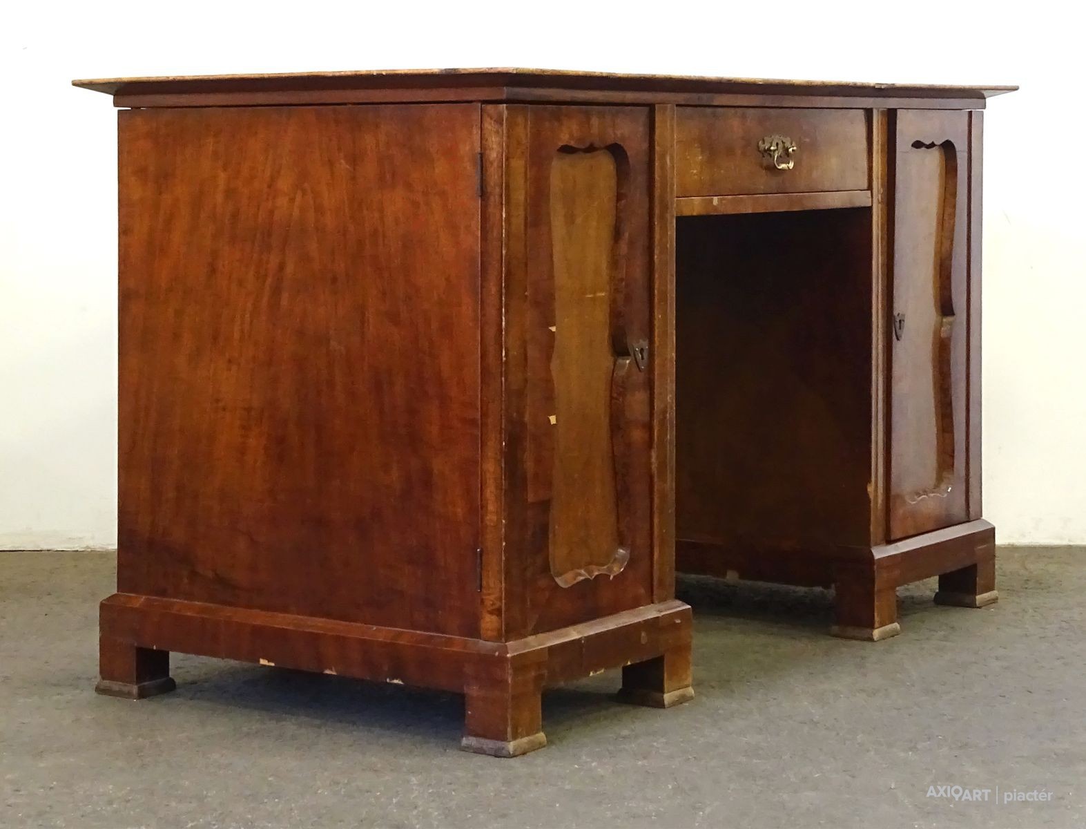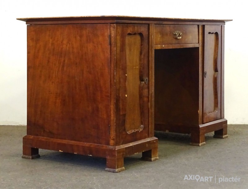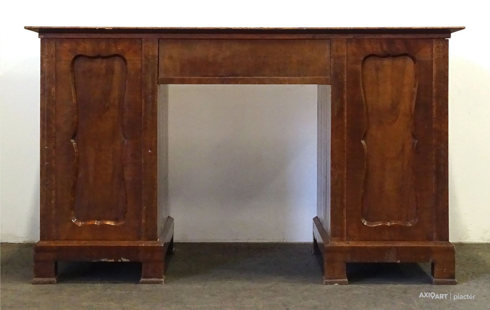 Térbe helyezhető, felújítatlan vastag svartnis Bieder íróasztal, réz veretekkel. Középen fiók, jobbra polcok, balra három fiók található. A bútoron furnérhibák találhatók.