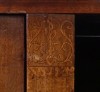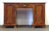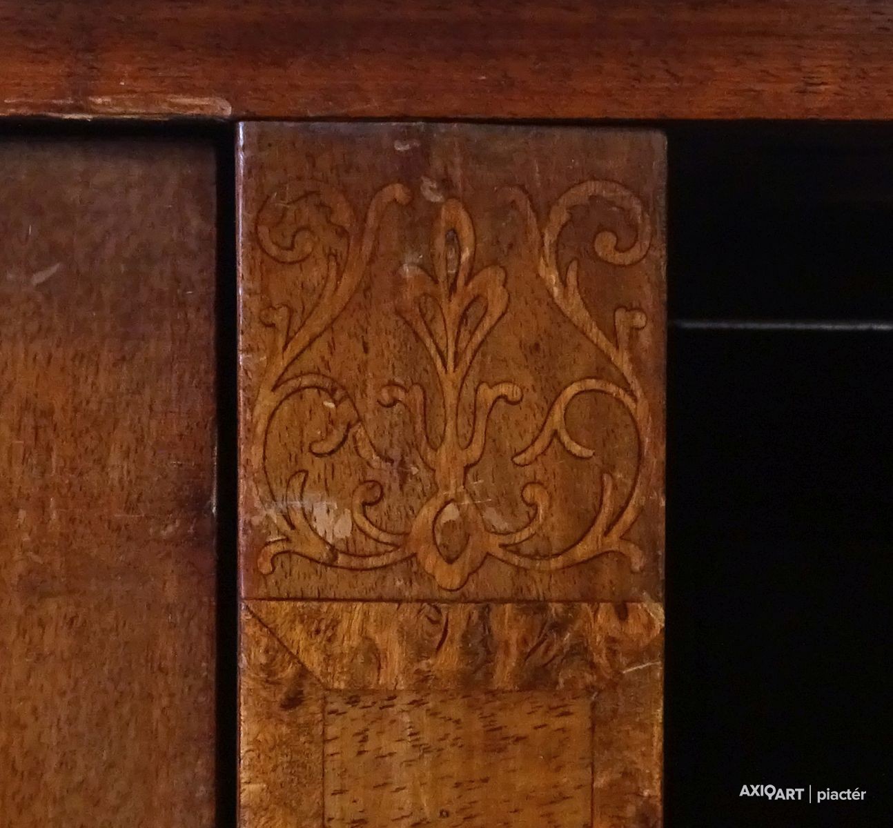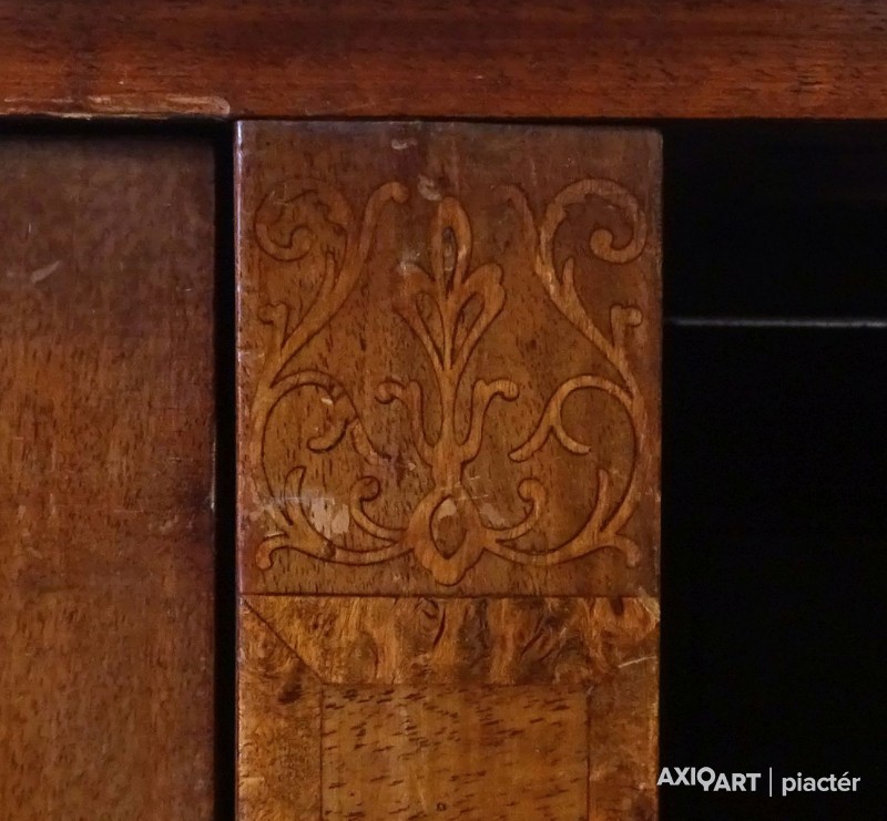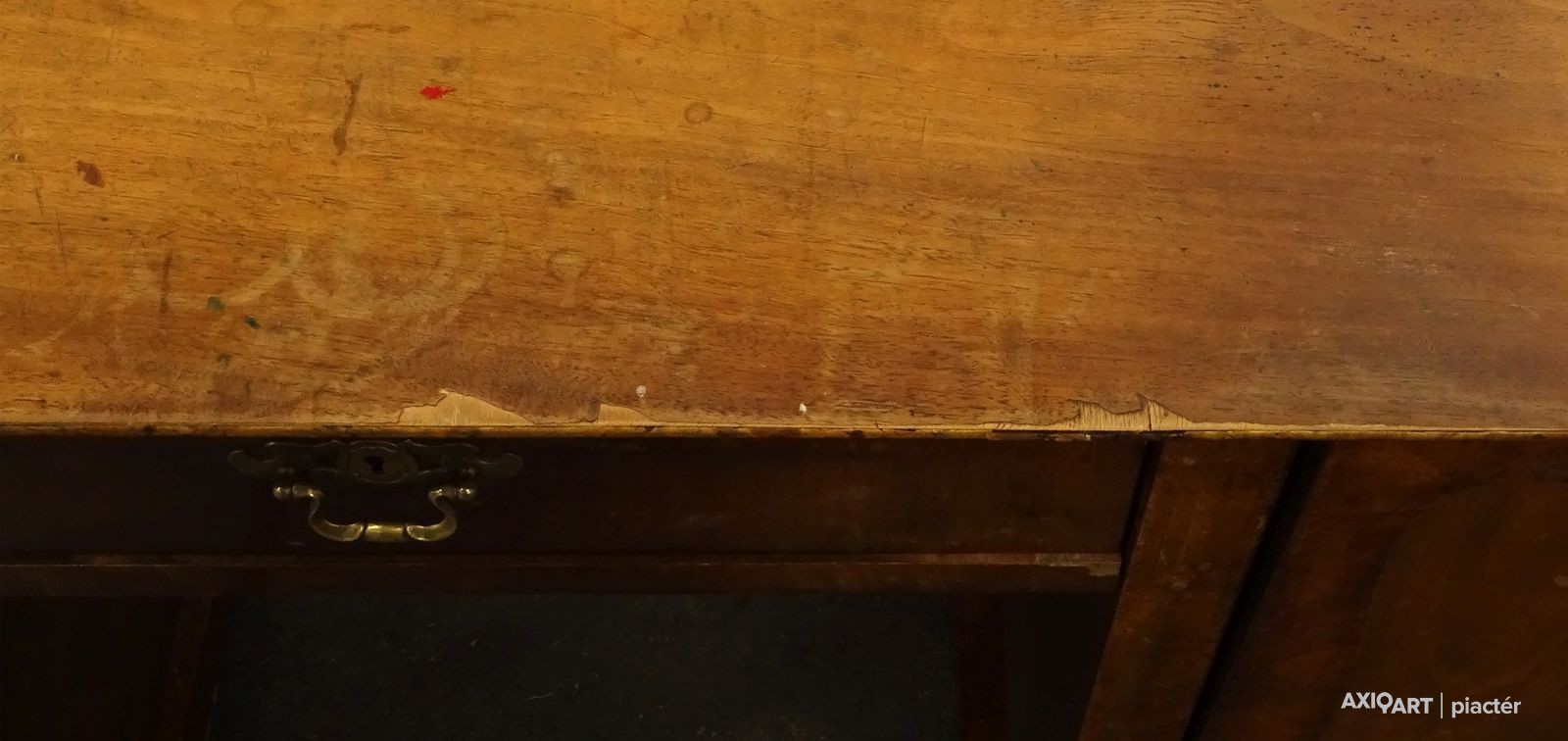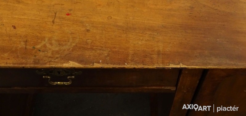 Térbe helyezhető, felújítatlan vastag svartnis Bieder íróasztal, réz veretekkel. Középen fiók, jobbra polcok, balra három fiók található. A bútoron furnérhibák találhatók.