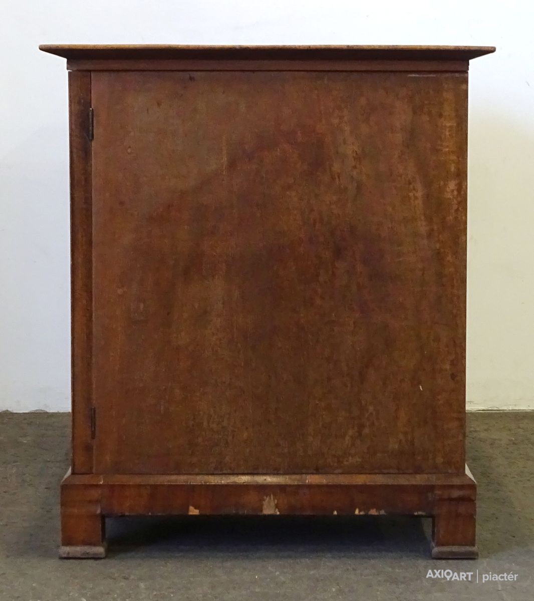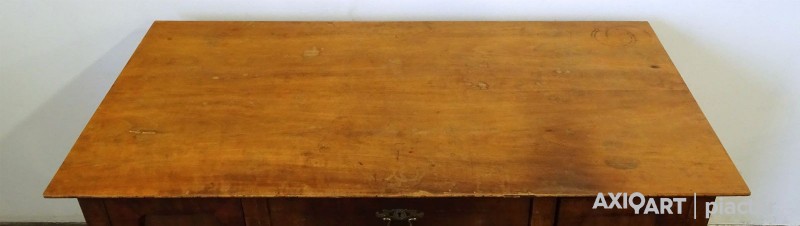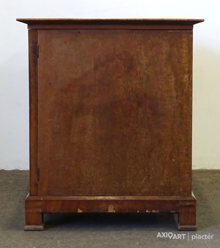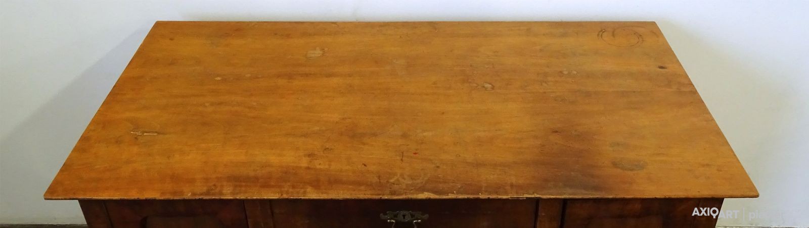 [0W158/KCS] Térbe helyezhető, felújítatlan vastag svartnis Bieder íróasztal, réz veretekkel. Középen fiók, jobbra polcok, balra három fiók található. A bútoron furnérhibák találhatók. Magasság: 80 cm Szélesség: 70 cm Hosszúság: 135 cm