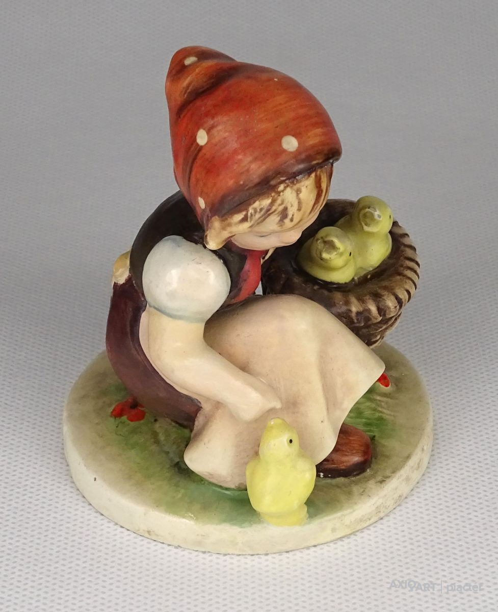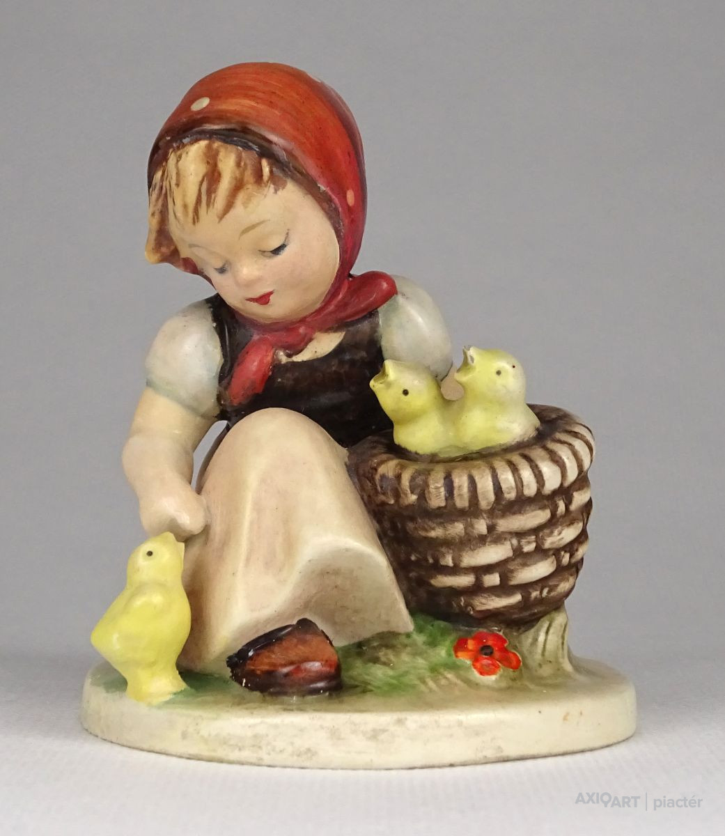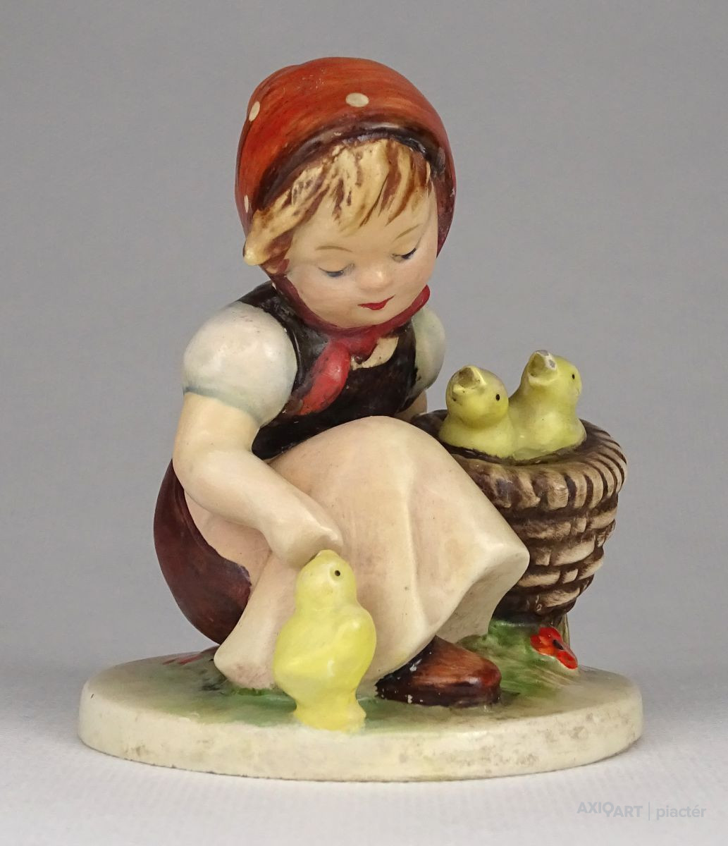 Antik hibátlan állapotú jelzett Hummel porcelán csibés kislány figura.