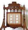 Szép állapotú, dúsan faragott támlás, karfás szék. alacsony, kisasszony fotel az 1800-as évek végéről. Szerkezetileg stabil. Újrakárpitozott, tiszta fotel. A kárpit a karfánál megfeslett. Két első lábán fém papucs található, lásd fotó.