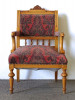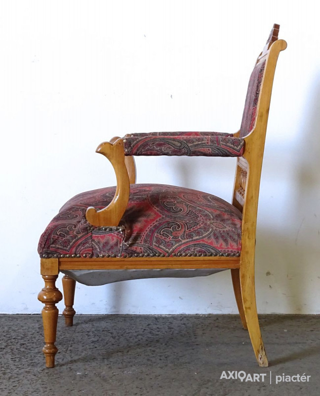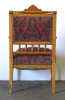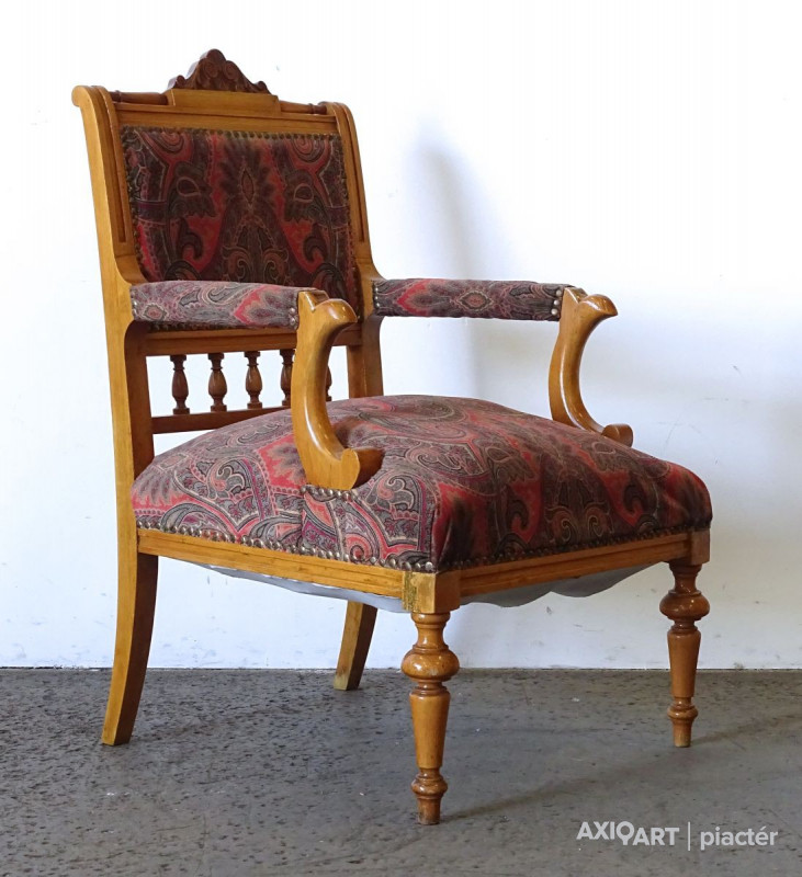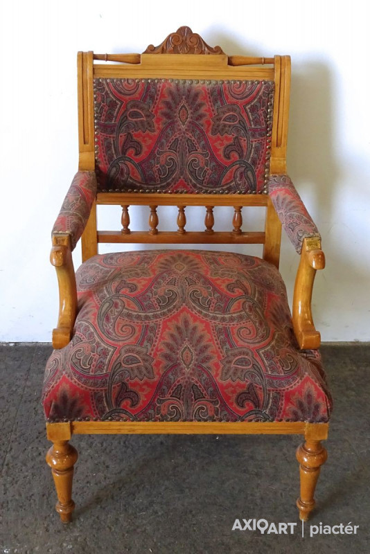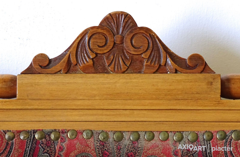 Régi faragott támlás, karfás szék. Alacsony fotel. Ülőfelülete epedarugós. A támla faragott csúcsban végződik.