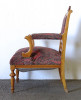 [1H345/KCS] Régi faragott támlás, karfás szék. Alacsony fotel. Ülőfelülete epedarugós. A támla faragott csúcsban végződik. Magasság: 95 cm Szélesség: 58 cm