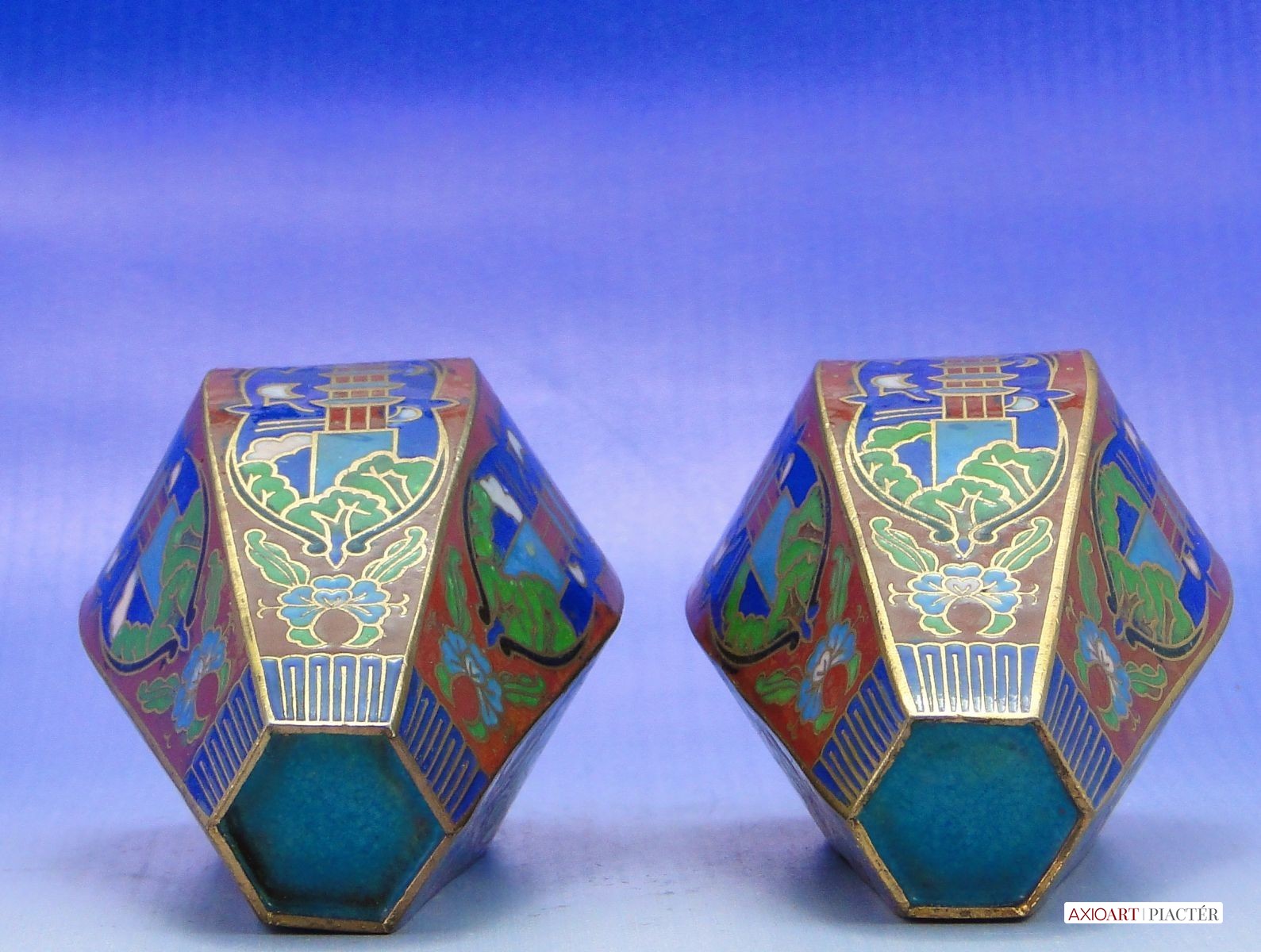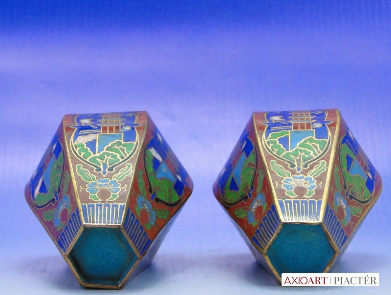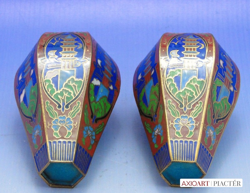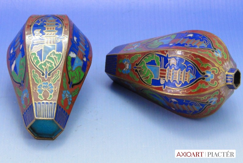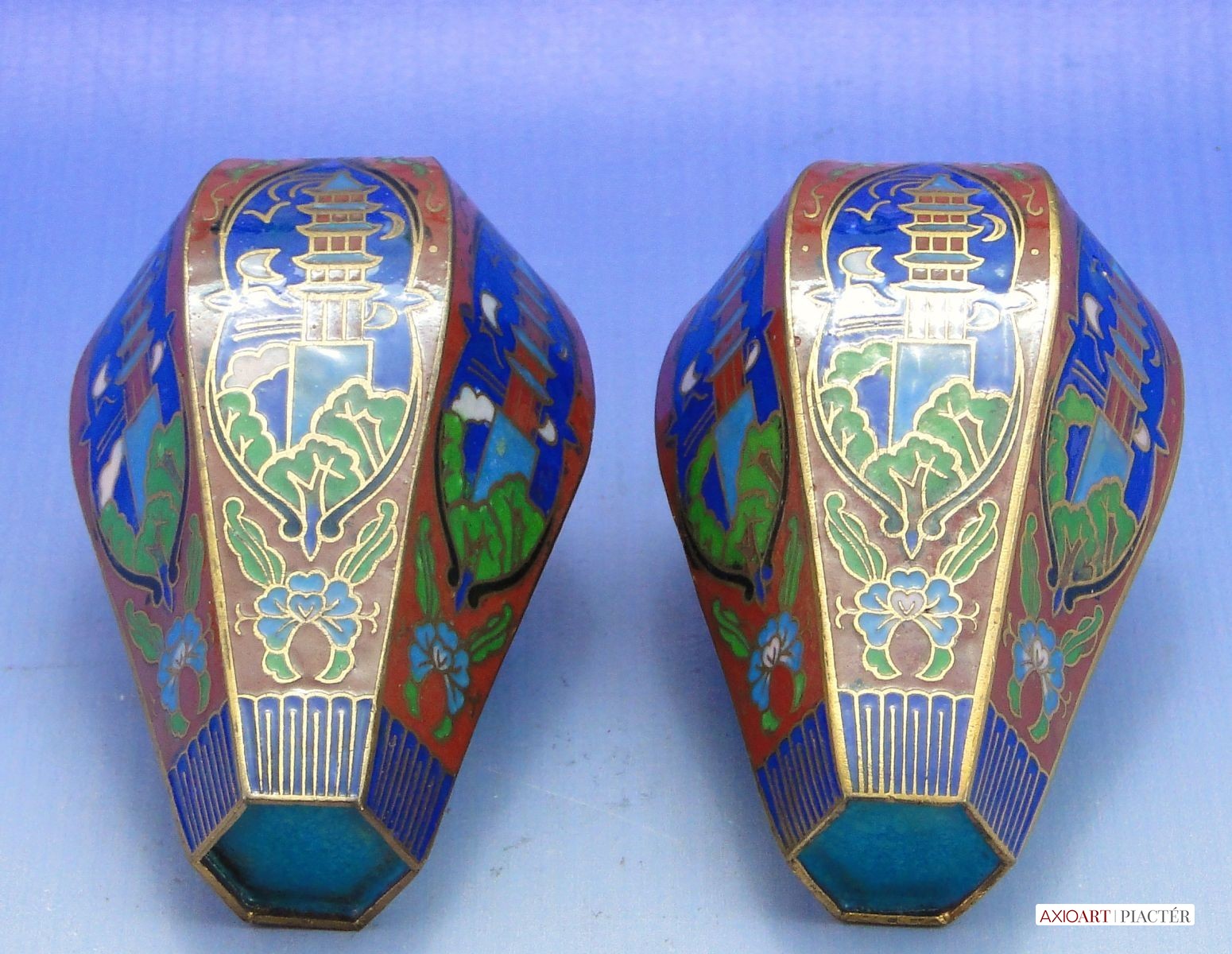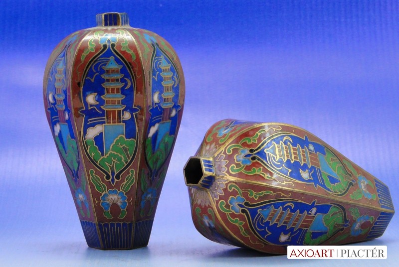 [0B200/UZ-K] Hibátlan állapotú ritkán előforduló gyűjteménybe illő régi tűz zománc keleti váza, oldalán pagoda díszítések. Magasság: 8.3 cm Szélesség: 4.3 cm Súly: 0.164 kg