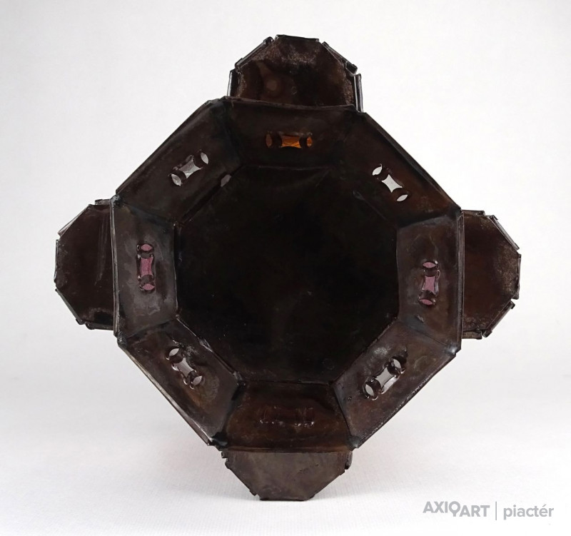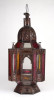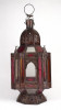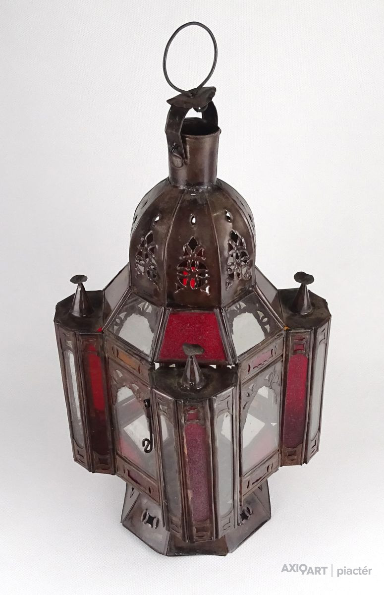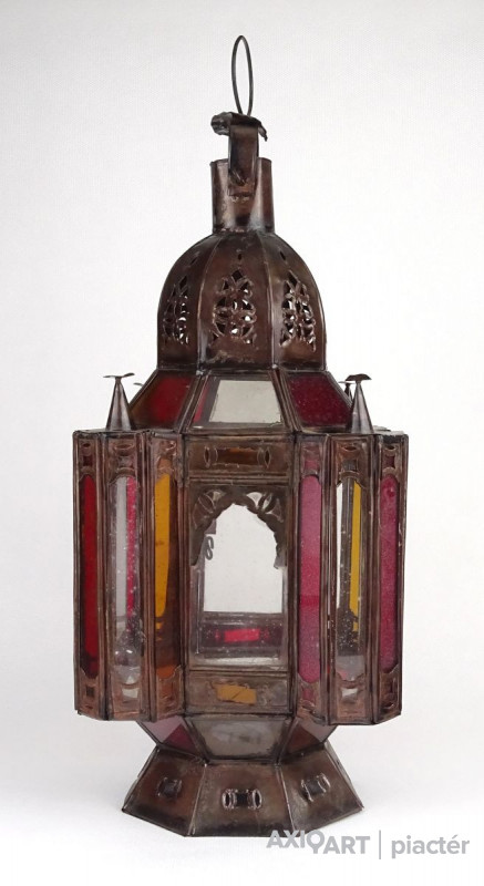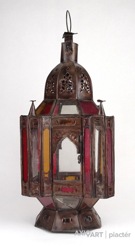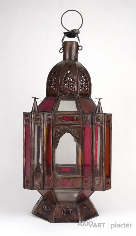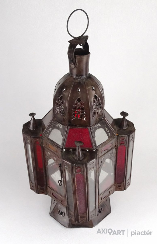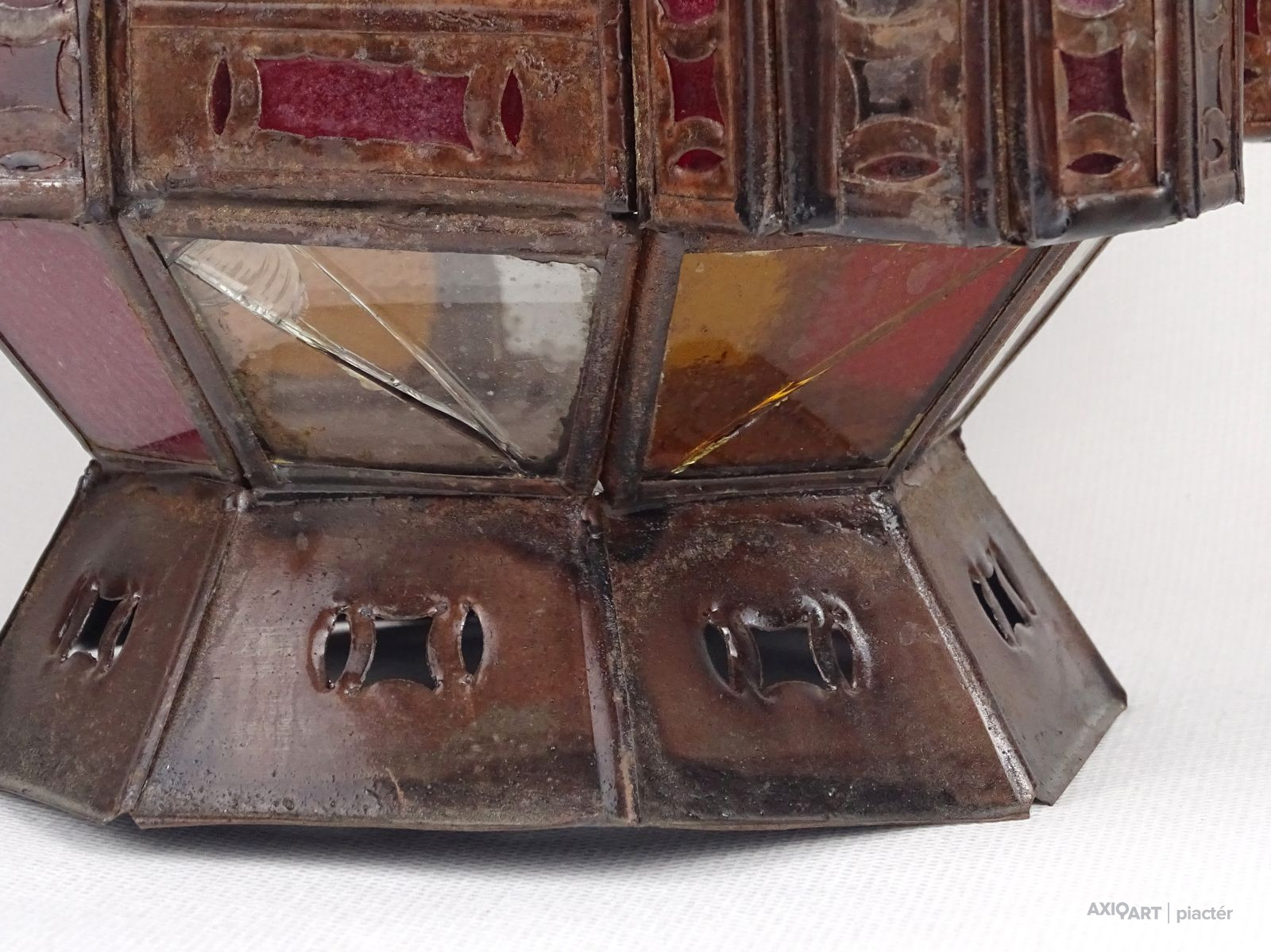 Antik szép állapotú templomi függeszték lámpa. Forrasztott fémlemez színes üvegbetétekkel. Kis ajtóval rendelkezik, gyertya helyezhető bele. Talpára is tehető, de akasztási lehetőséggel is rendelkezik.