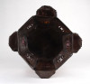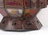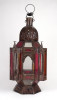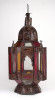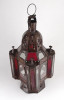 [1P643/X077] Antik szép állapotú templomi függeszték lámpa. Forrasztott fémlemez színes üvegbetétekkel. Kis ajtóval rendelkezik, gyertya helyezhető bele. Talpára is tehető, de akasztási lehetőséggel is rendelkezik. Magasság: 39 cm Szélesség: 19.5 cm Súly: 0.895 kg
