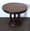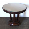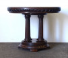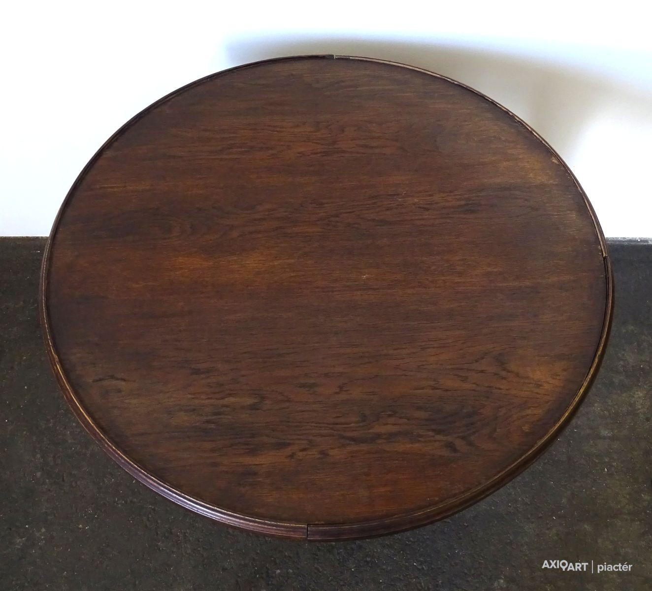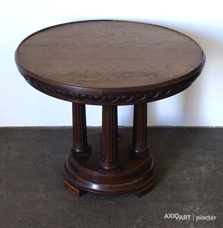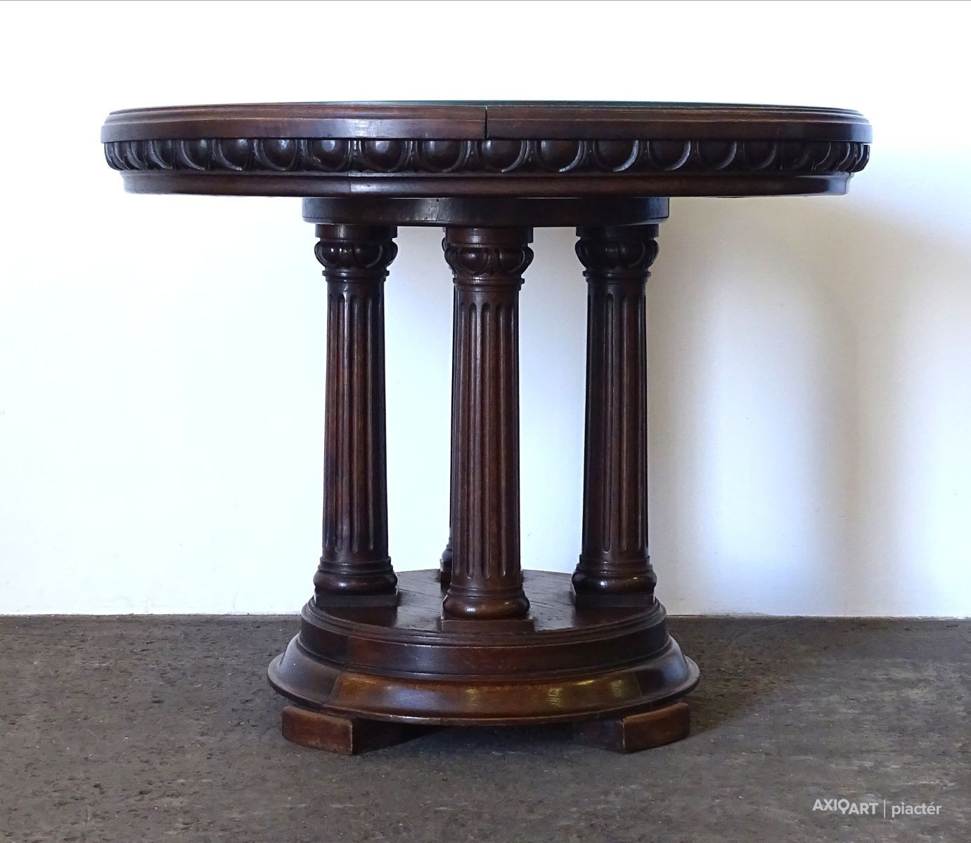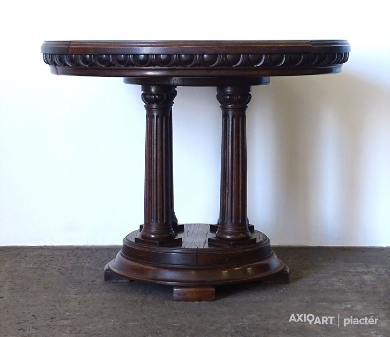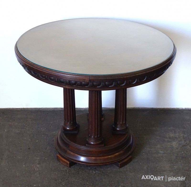 Antik, szép állapotú, faragott négyoszlopos üveglapos körasztal, dohányzóasztal. Körben ökörszemes díszítéssel.