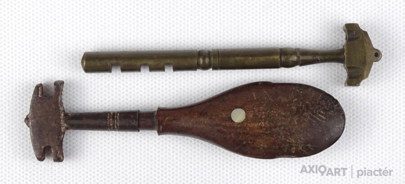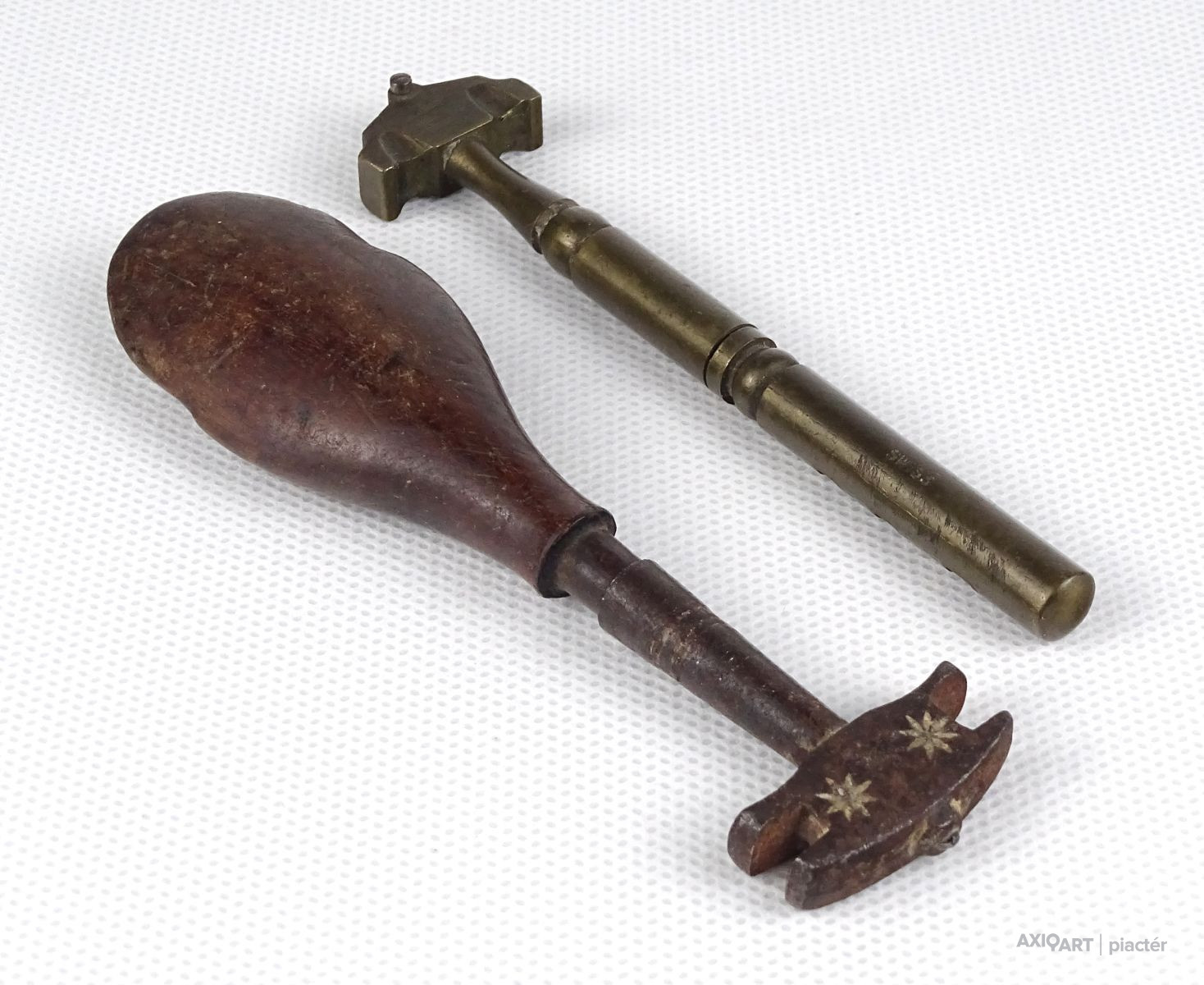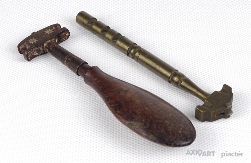 Szép állapotú antik üvegvágó szerszám. Az egyik gyöngyházberakásos fa nyéllel rendelkezik, a másik rézből készült.