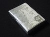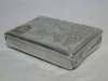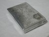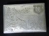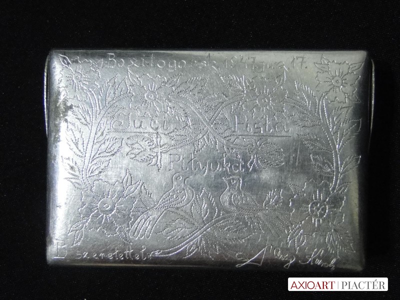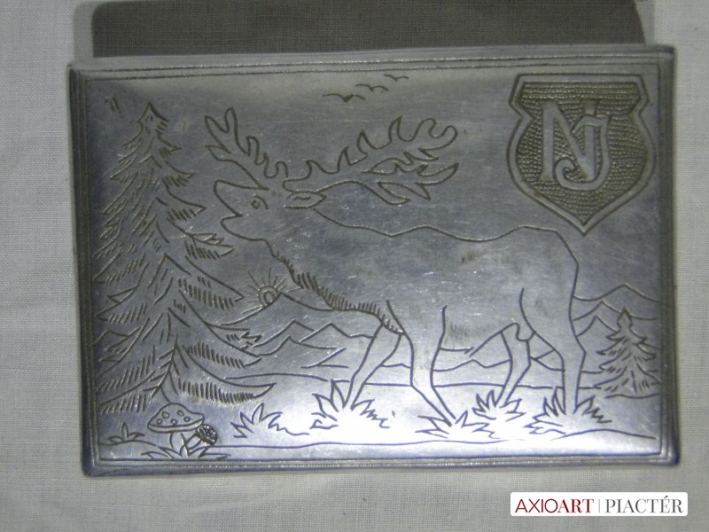 [0811/X019] Antik alumíniumból készült antik monogramos (N. I.) vadászjelenetes, szarvasos, gazdagon pontozással díszített, vésett cigaretta tartó tárca, jelzett hadifogoly munka. Alján felirat: BOXITOGORSK 1947. JUN. 17 JUCI PISTA PITYUKA B. SZERETETTEL IRÁZY KÁROLY (ersekcsanad.fw.hu/kuldjon.html) Magasság: 2.5 cm Szélesség: 7.5 cm Hosszúság: 10.5 cm Súly: 0.065 kg