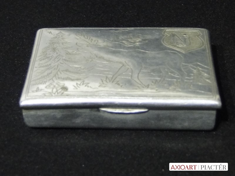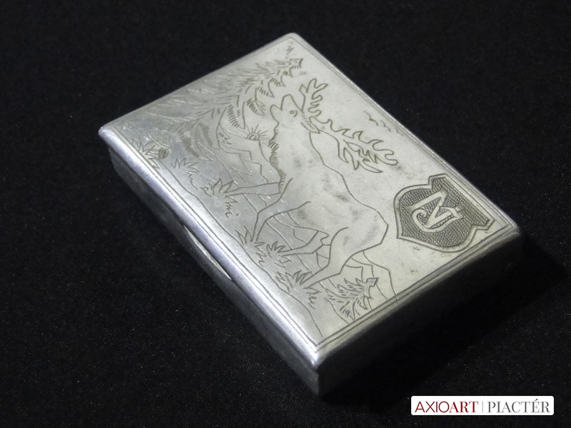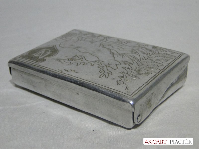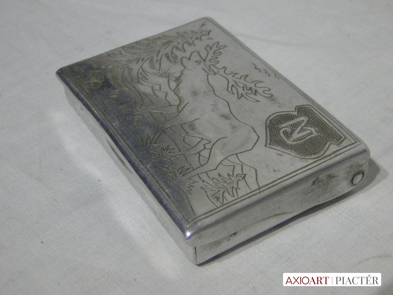 Antik alumíniumból készült antik monogramos (N. I.) vadászjelenetes, szarvasos, gazdagon pontozással díszített, vésett cigaretta tartó tárca, jelzett hadifogoly munka.