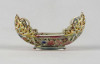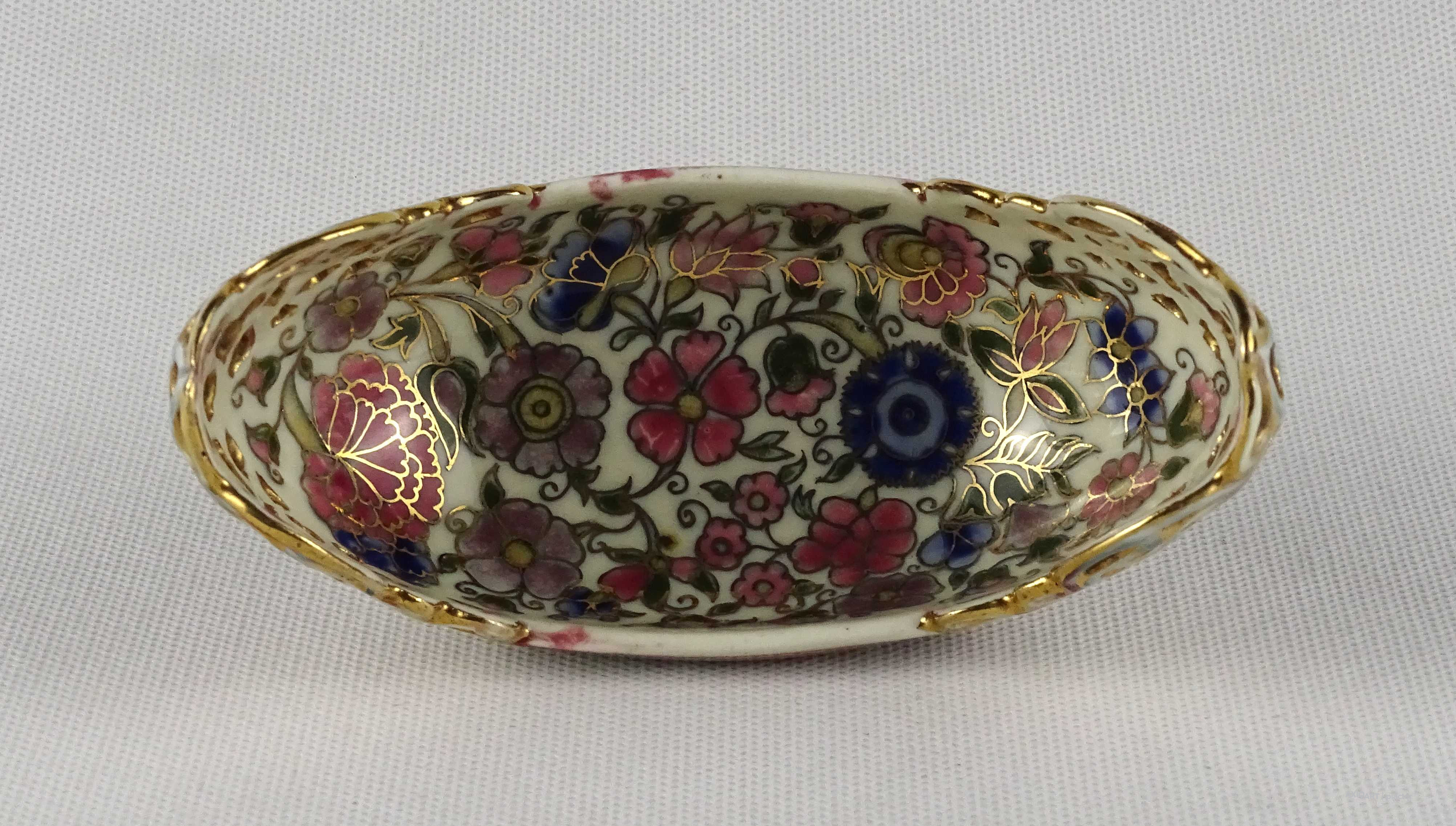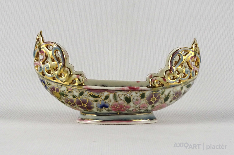 Antik vajszínű áttört gondola alakú Zsolnay majolika tálka 13 cm