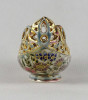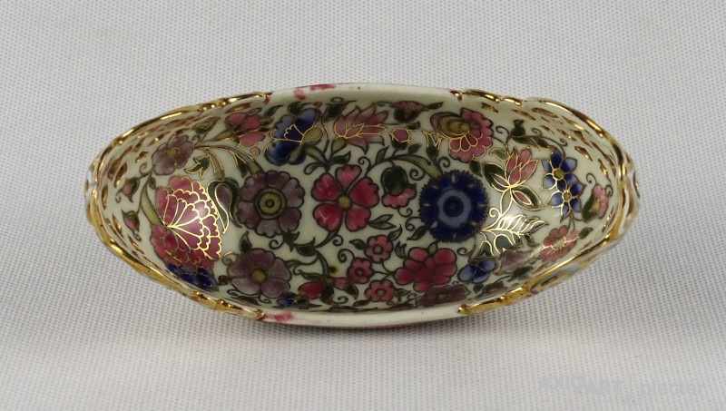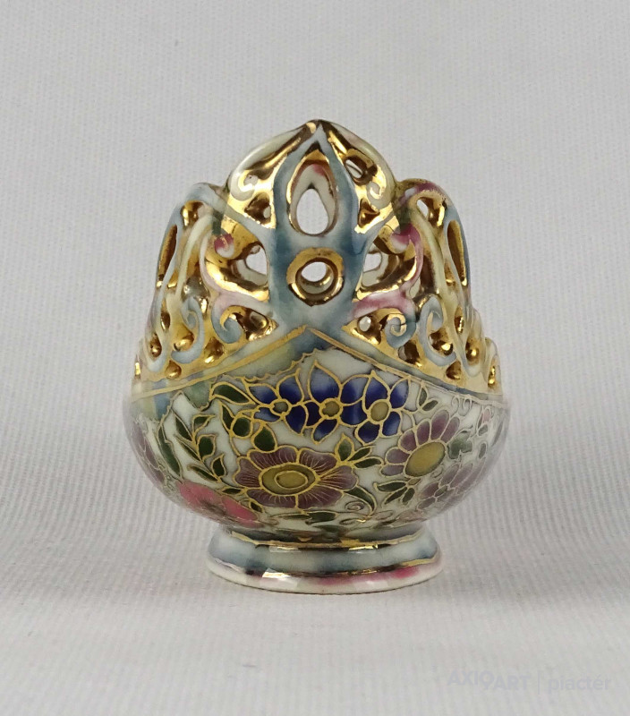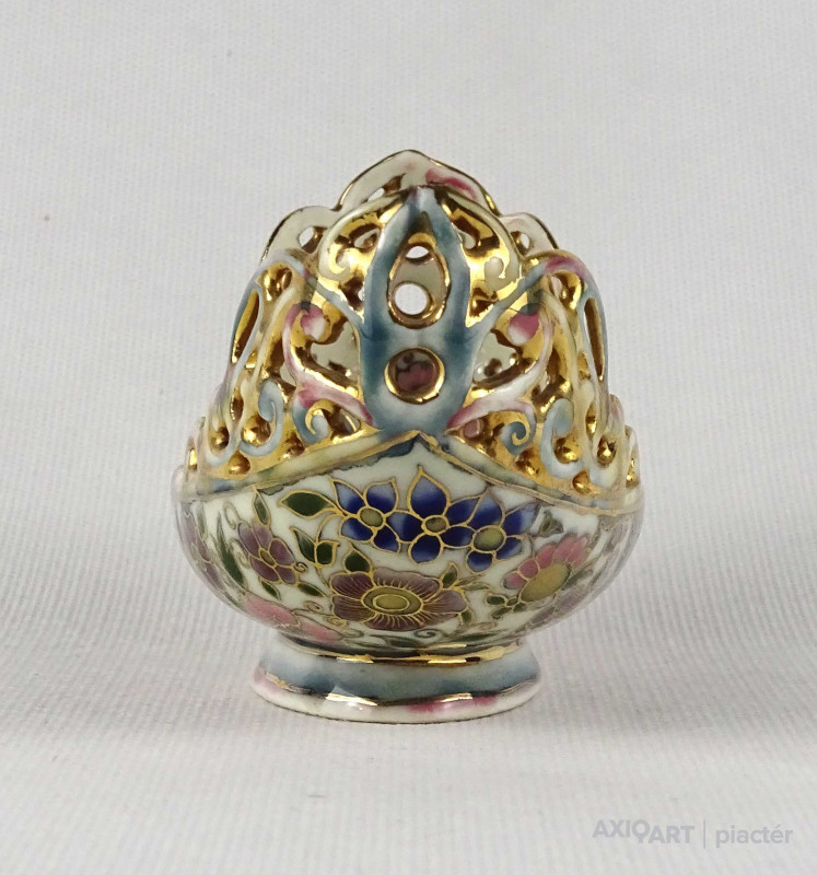 [1U055/Z008] Antik, aranyozott, virágmintás áttört Zsolnay majolika váza vagy kaspó. Alján barna öttornyos jelzés Mélynyomással: ZSOLNAY PÉCS mélynyomott formaszám: 9317 0000 31 Magasság: 6 cm Szélesség: 6.5 cm Súly: 0.08 kg