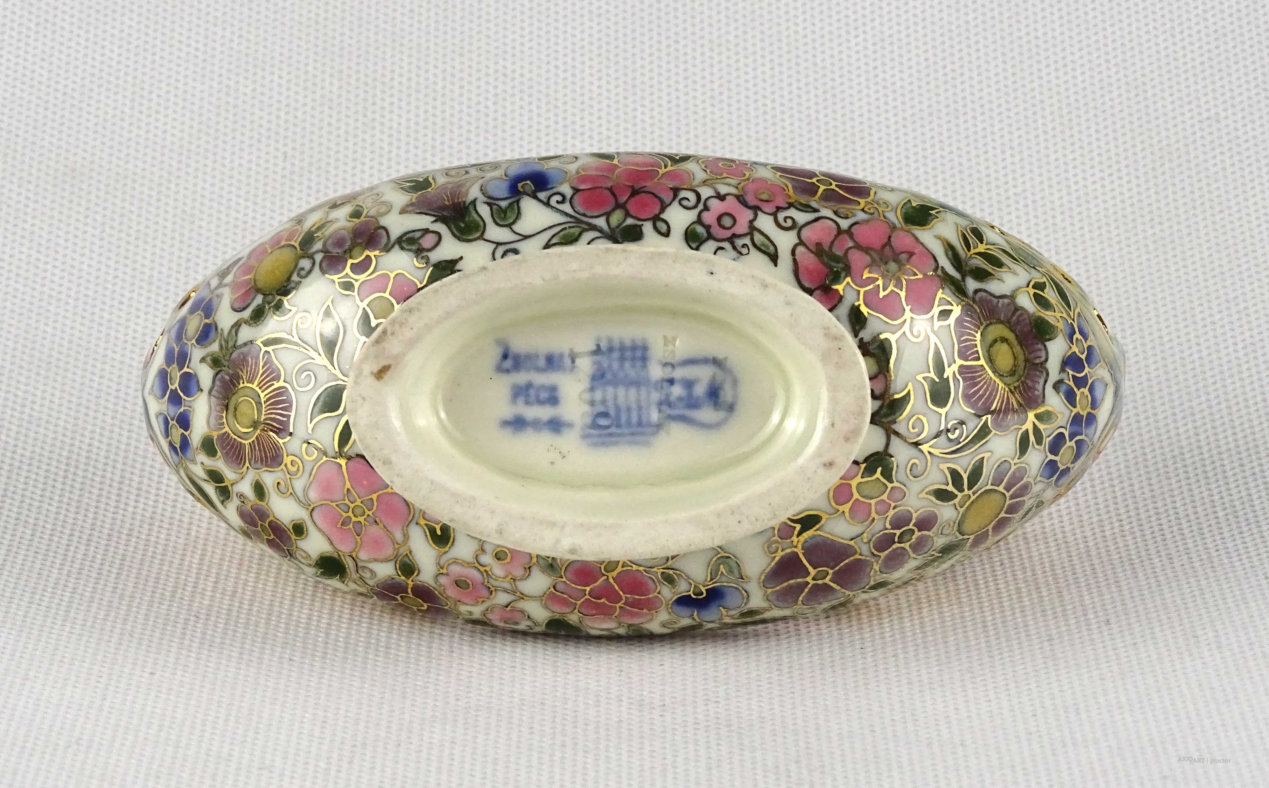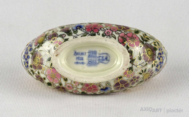 [1U066/Z008] Antik, vajszínű, virágmintás jelzett Zsolnay majolika váza vagy kaspó. Alján kék családi jelzés : ZSOLNAY PÉCS TJM Mélynyomással: ZSOLNAY PÉCS Mélynyomott formaszám: 1063 1/2 6000 48 Magasság: 6.4 cm Szélesség: 6 cm Hosszúság: 9 cm Súly: 0.095 kg