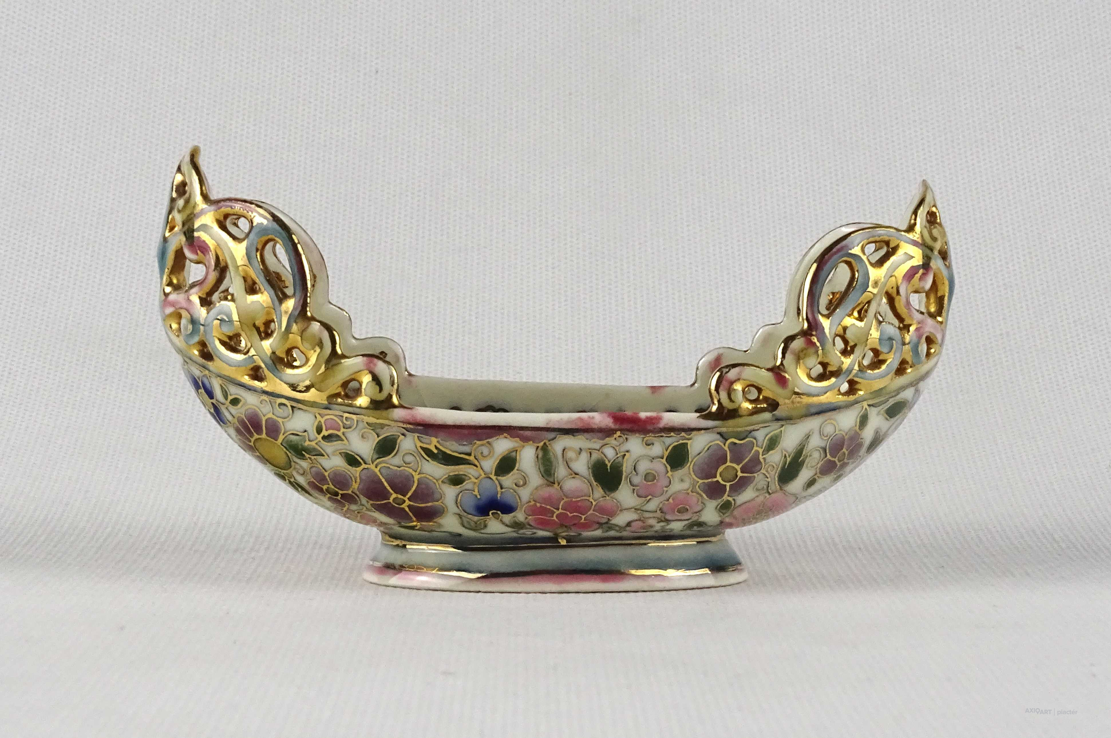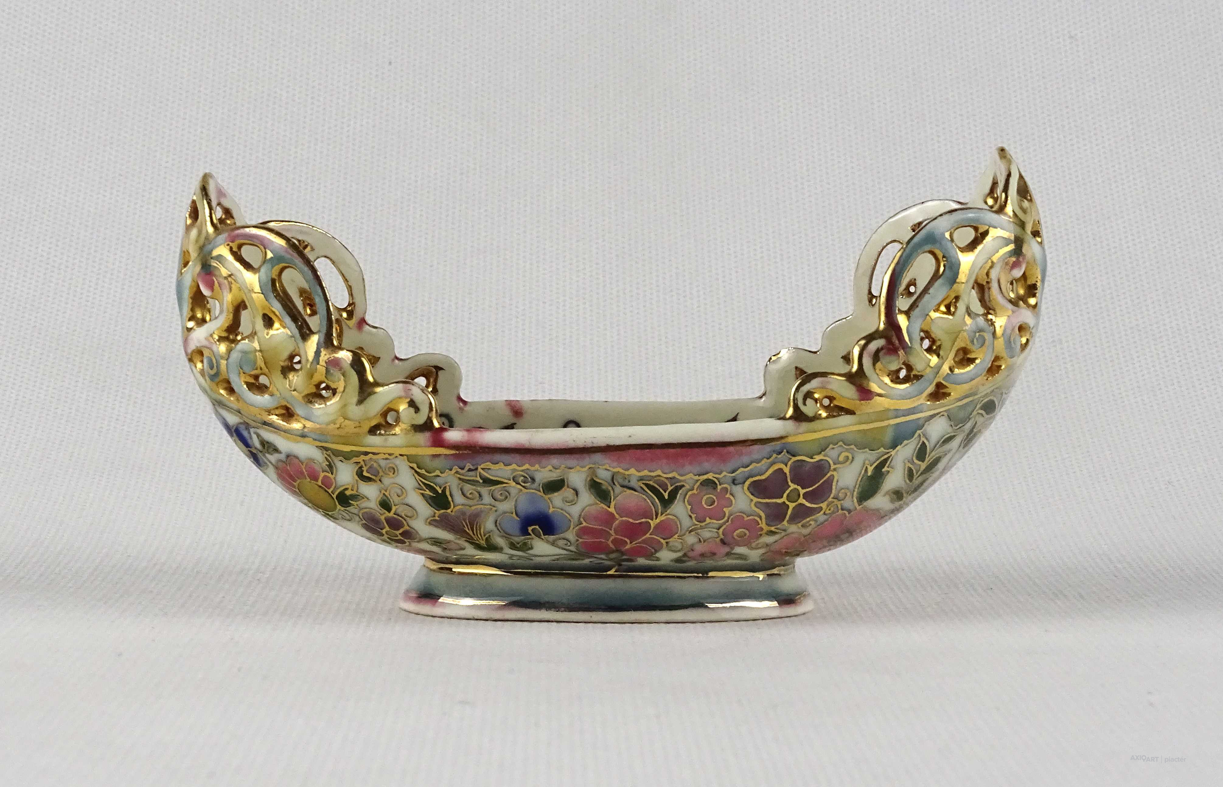 Antik aranyozott virágmintás áttört Zsolnay majolika kaspó