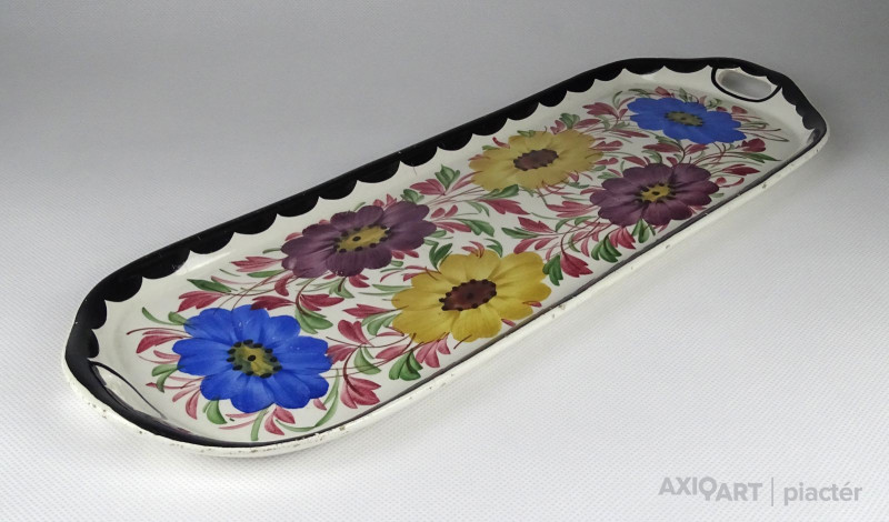 Antik, szép állapotú, kézzel festett, jelzett majolika tálca, kínáló tál.