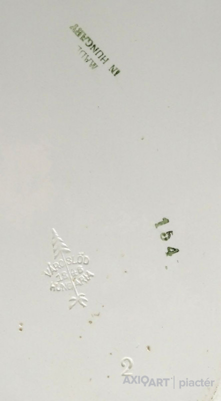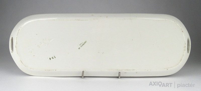 [1I448/X221] Antik, szép állapotú, kézzel festett, jelzett majolika tálca, kínáló tál. Városlődi gyűjtők figyelmébe ajánljuk! Alján mélynyomással jelzés: VÁROSLŐD HUNGÁRIA 1846 Zölddel felirat: MADE IN HUNGARY Formaszám: 154 Szélesség: 14.5 cm Hosszúság: 42 cm Súly: 0.53 kg