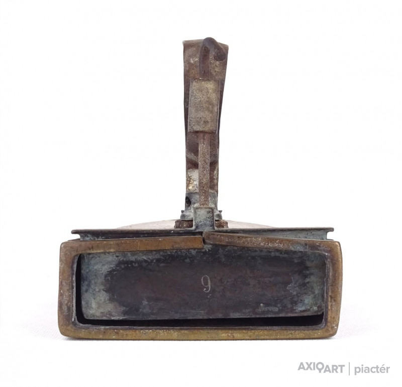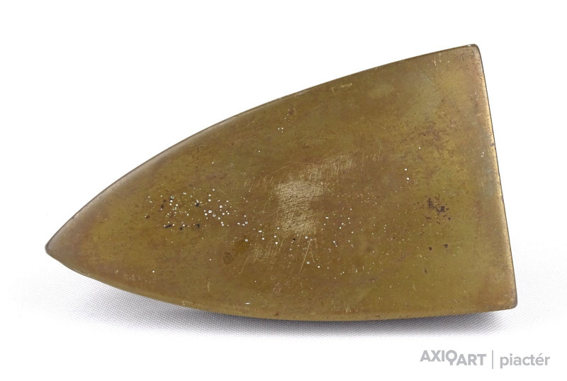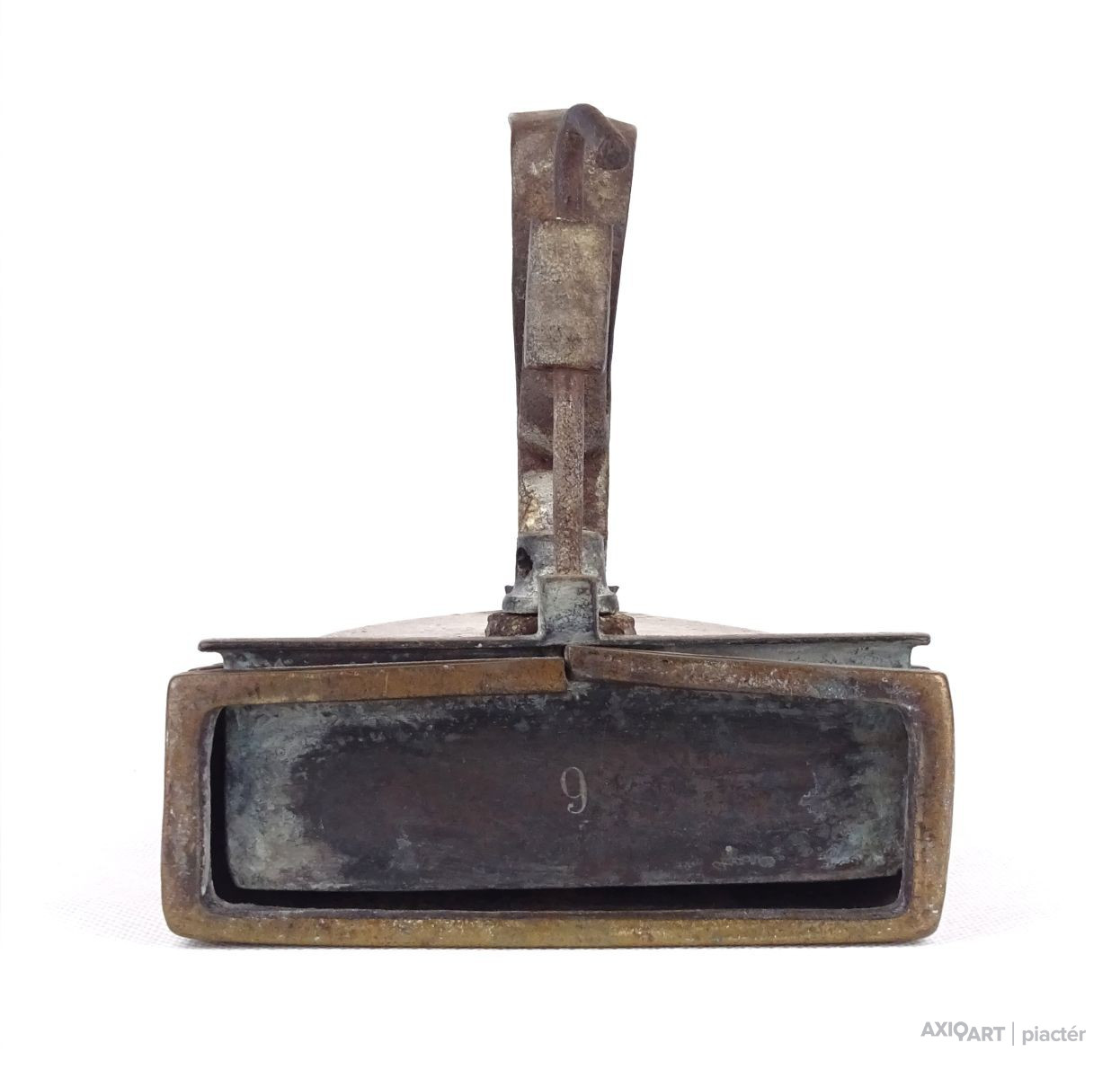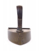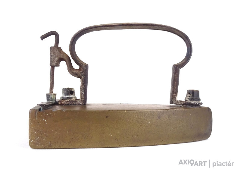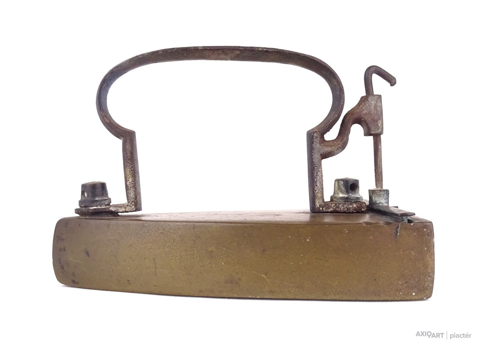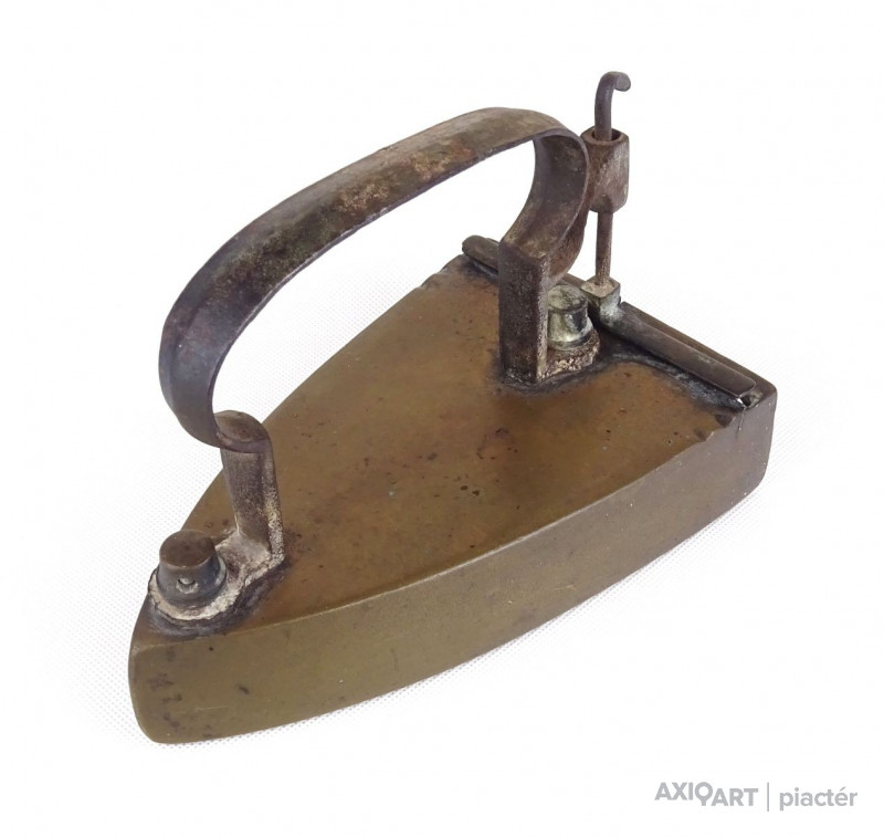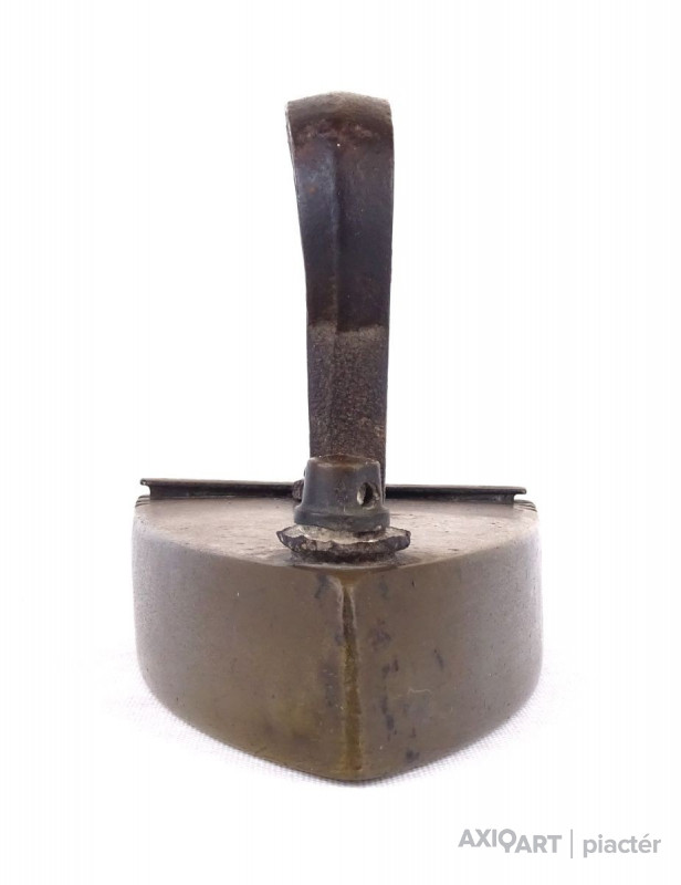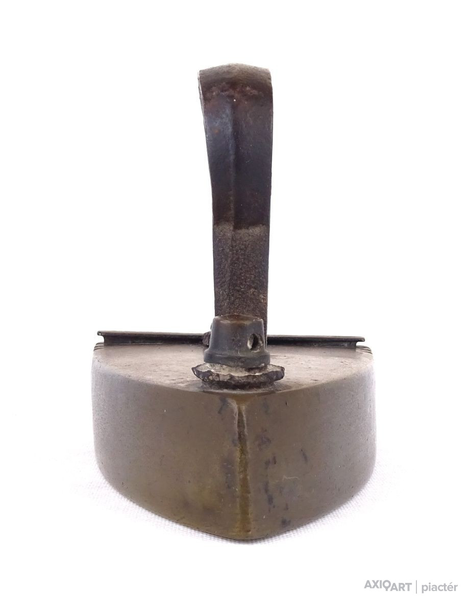 [1B863/X305] Antik, szép állapotú vasmagos réz vasaló. Öntöttvas fogóval rendelkezik. Vasmag betétje nincs meg. Hátoldalán méretezés látható: 9 Magasság: 13.5 cm Szélesség: 12 cm Hosszúság: 20 cm Súly: 1.705 kg