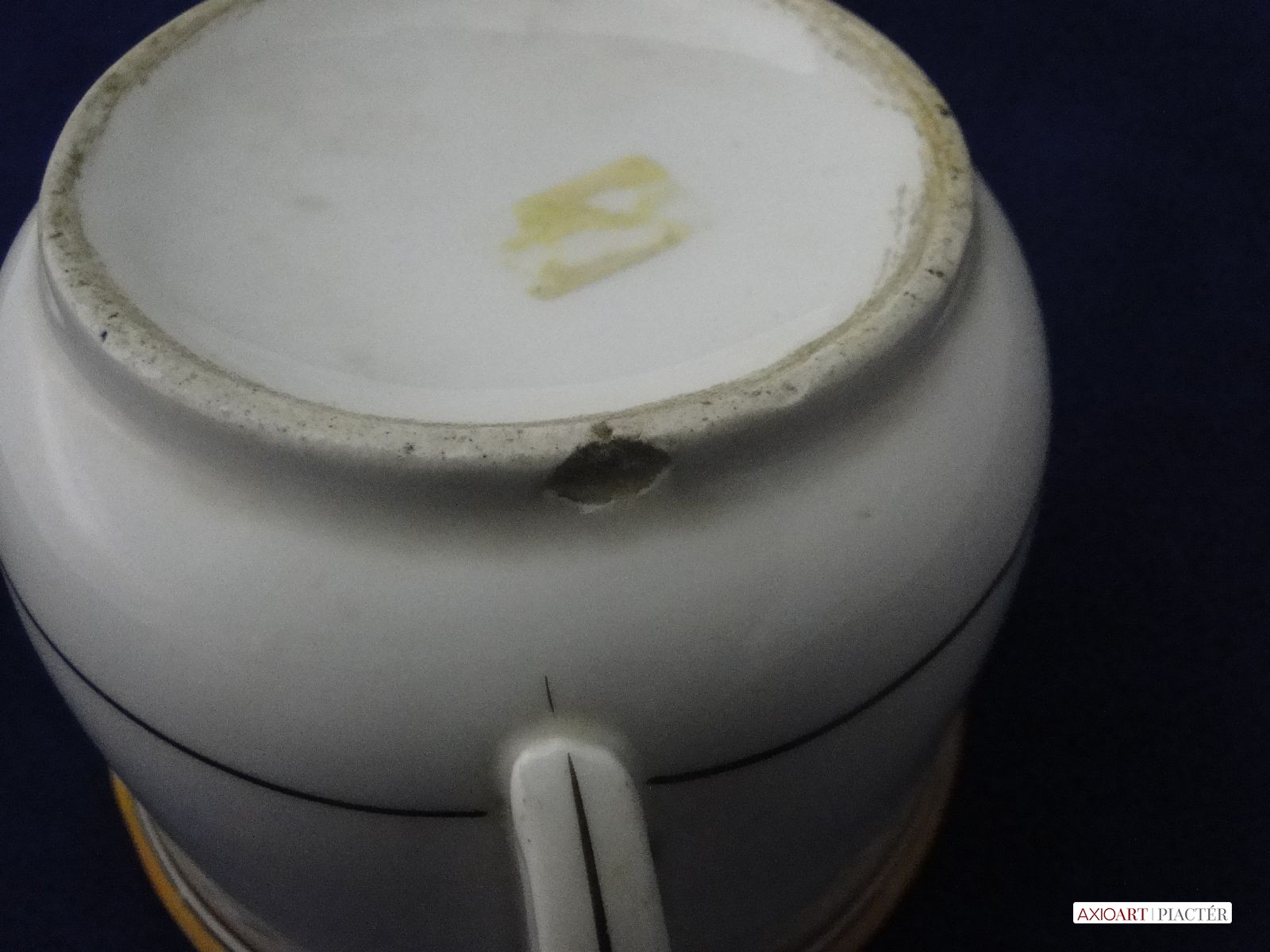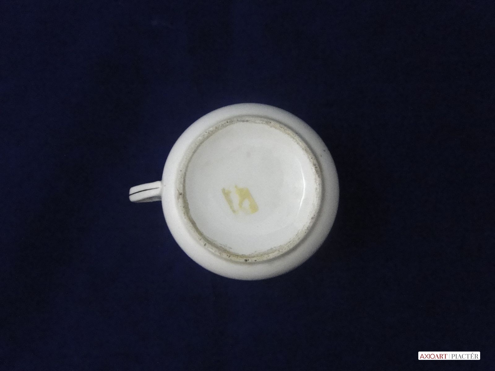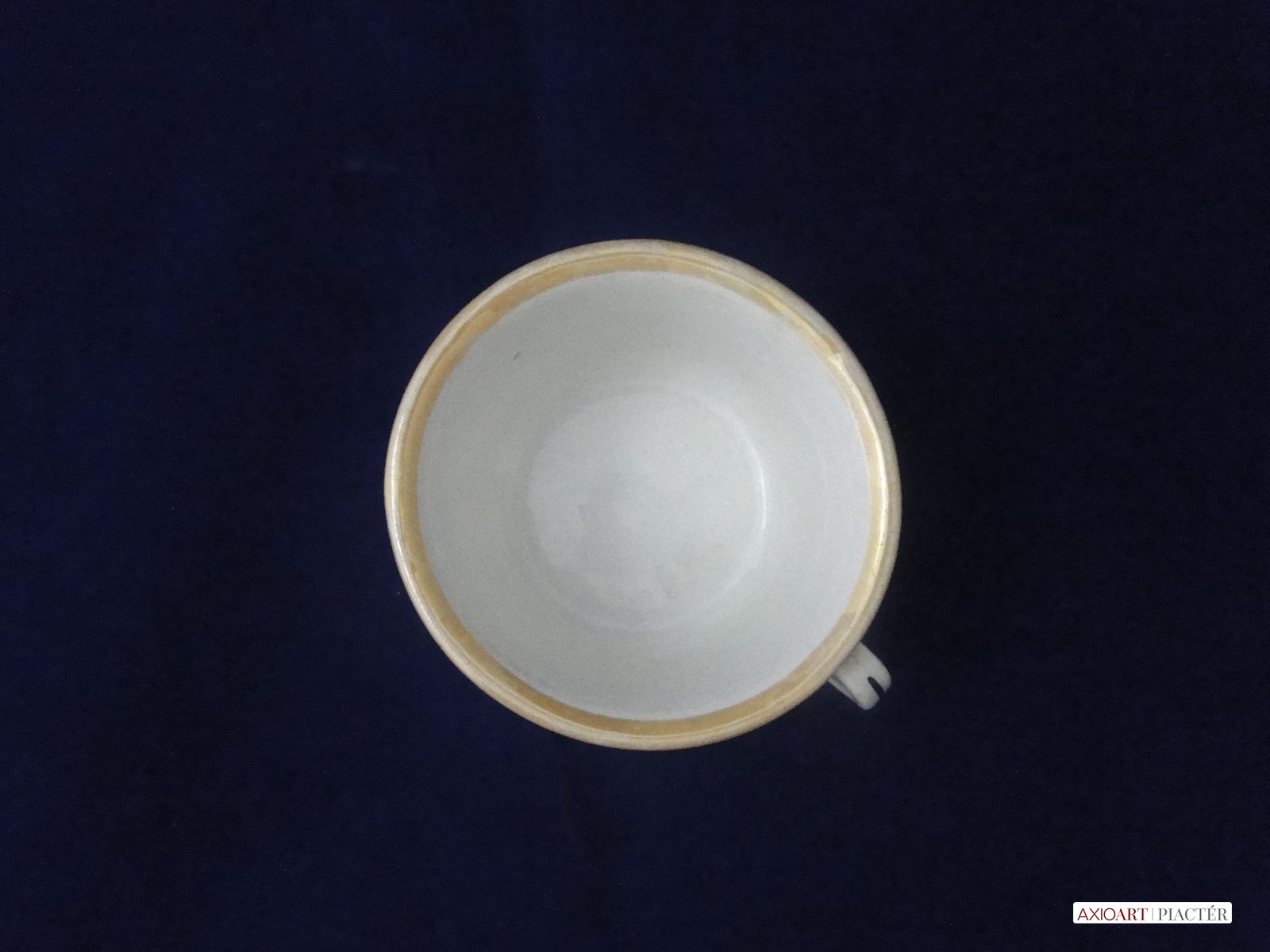 Antik szép állapotú vastagfalú porcelán koma csésze koma tál, oldalán körben elegáns irizáló kézi festésű díszítés.