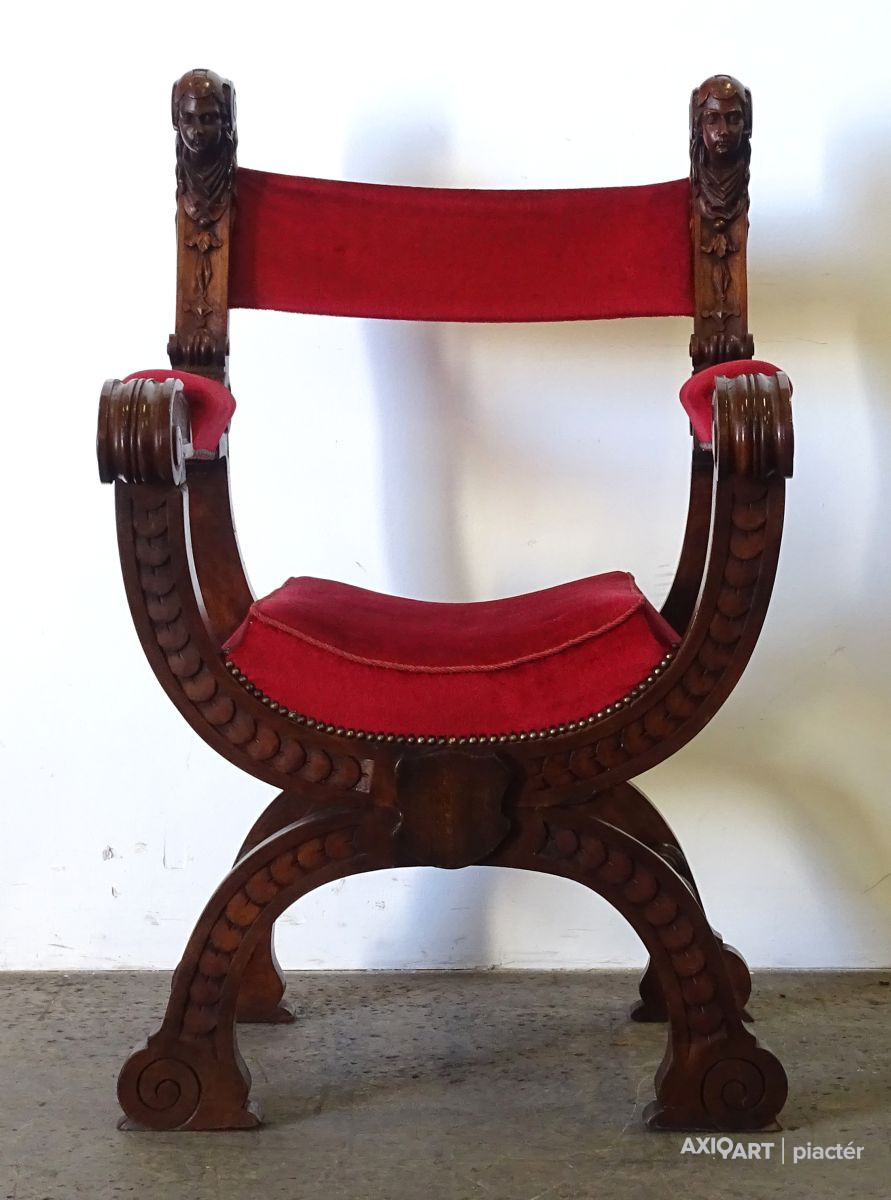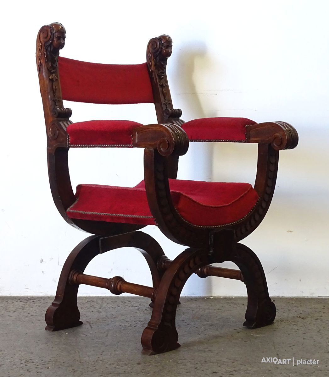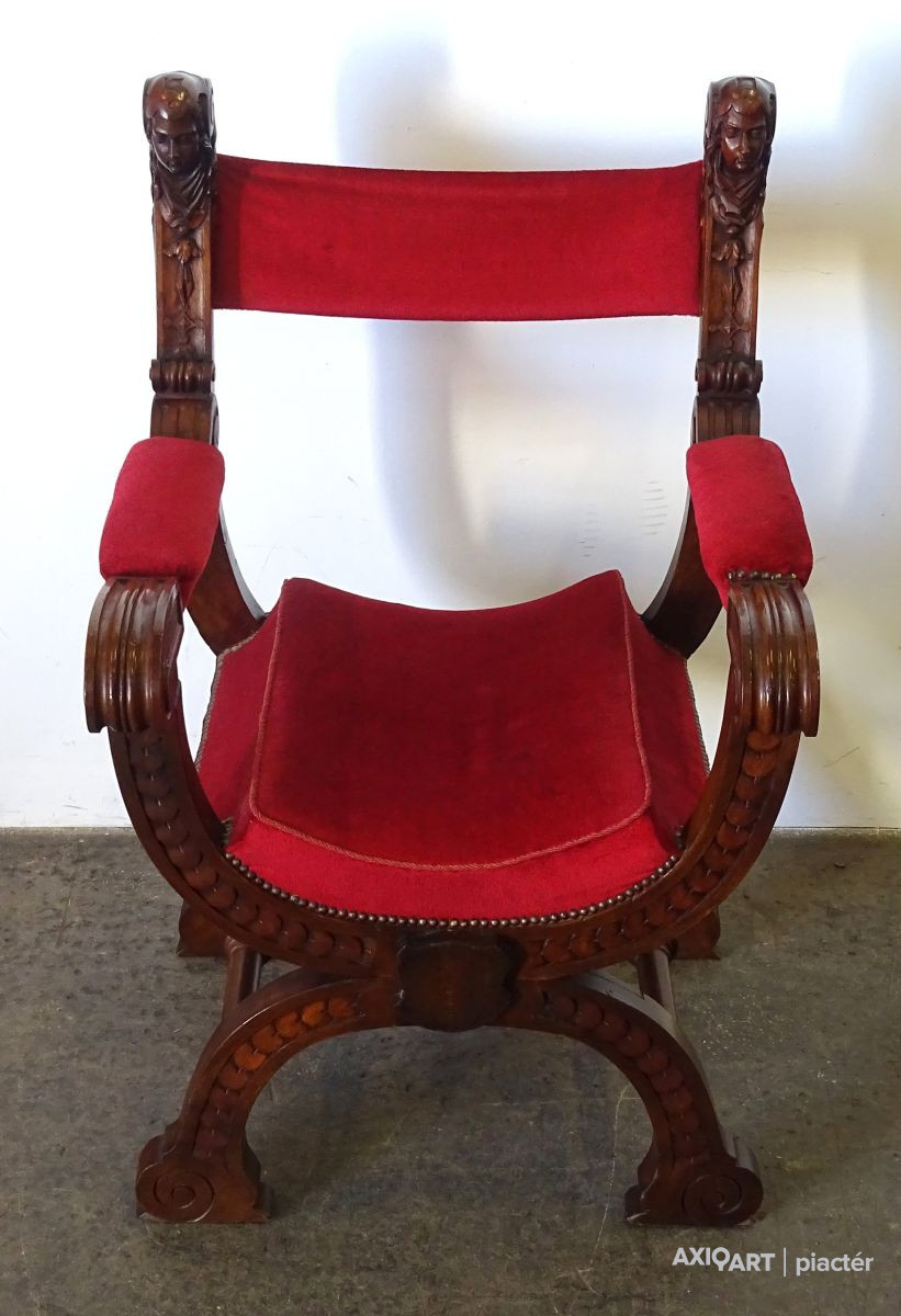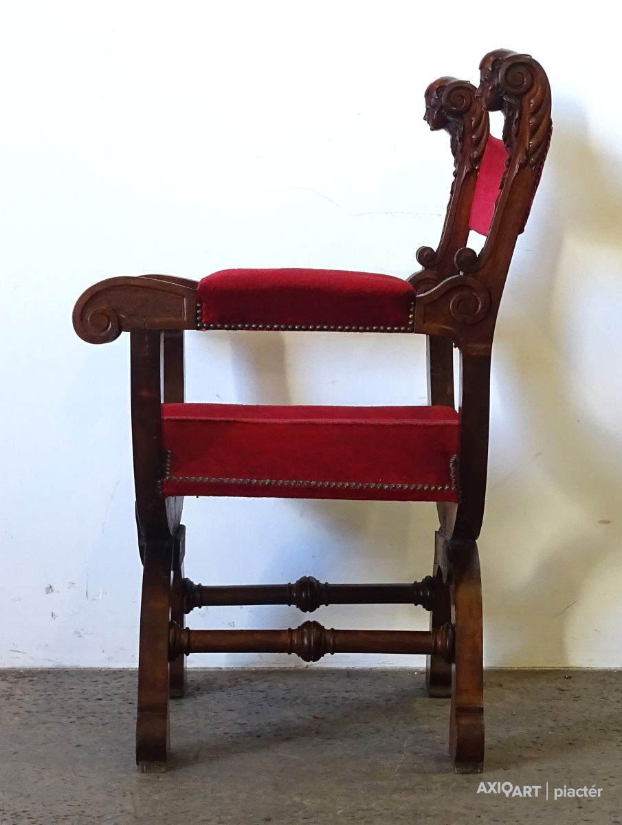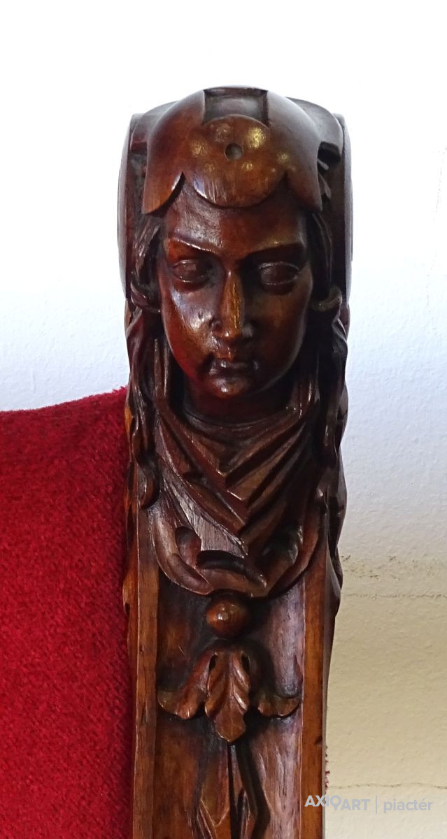 Gyönyörű antik kárpitozott trónszék, támlás szék. A bordó kárpit körben szegecsekkel díszített. Szerkezetileg stabil. Dúsan faragott, A támla végei gyönyörű női fejekkel díszített. Azonnal enteriőrbe helyezhető gyönyörű darab.