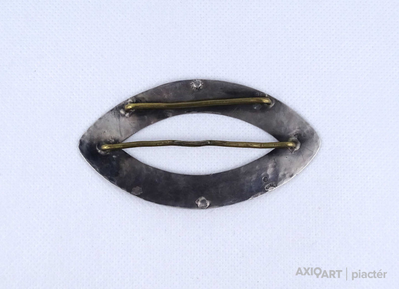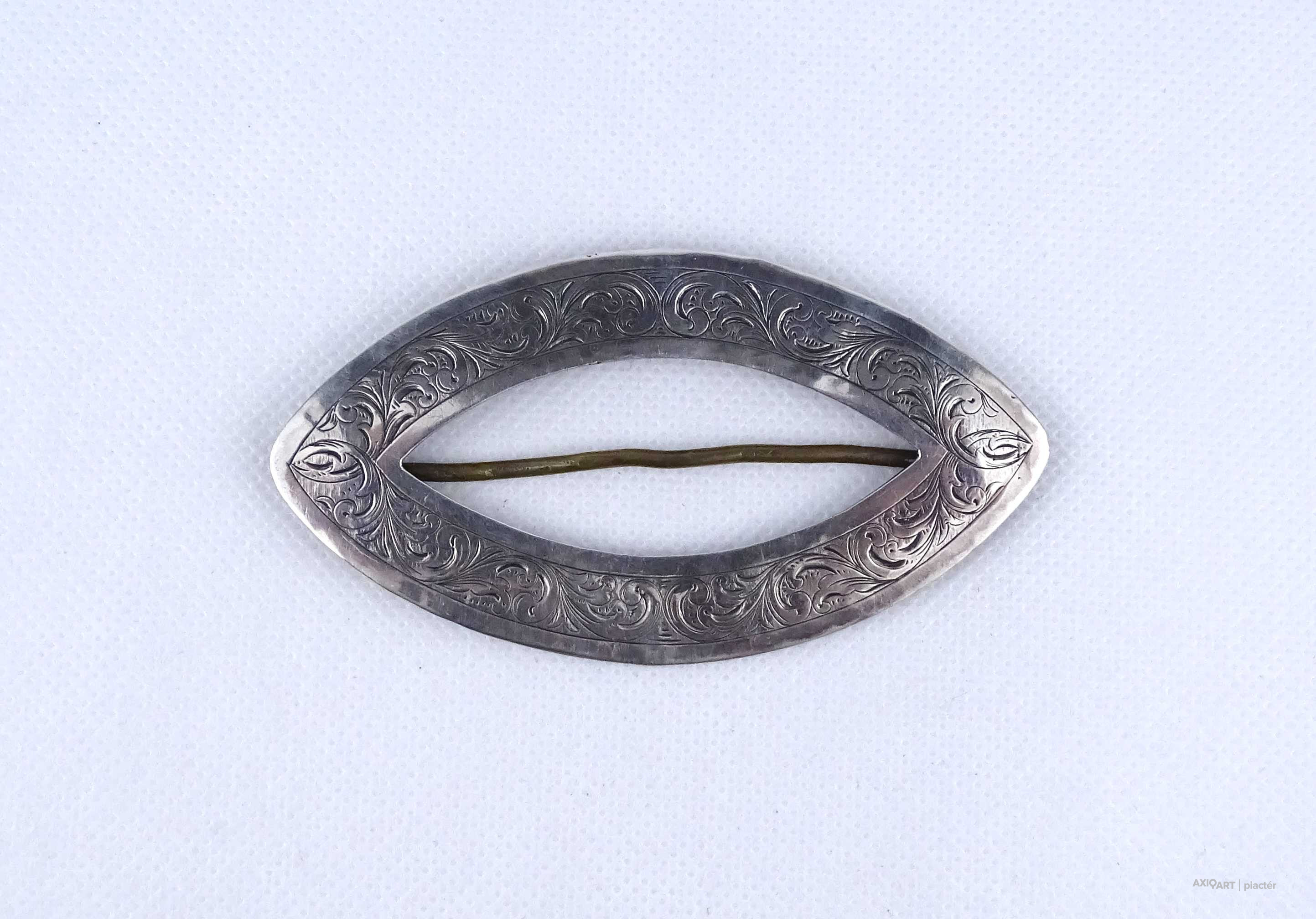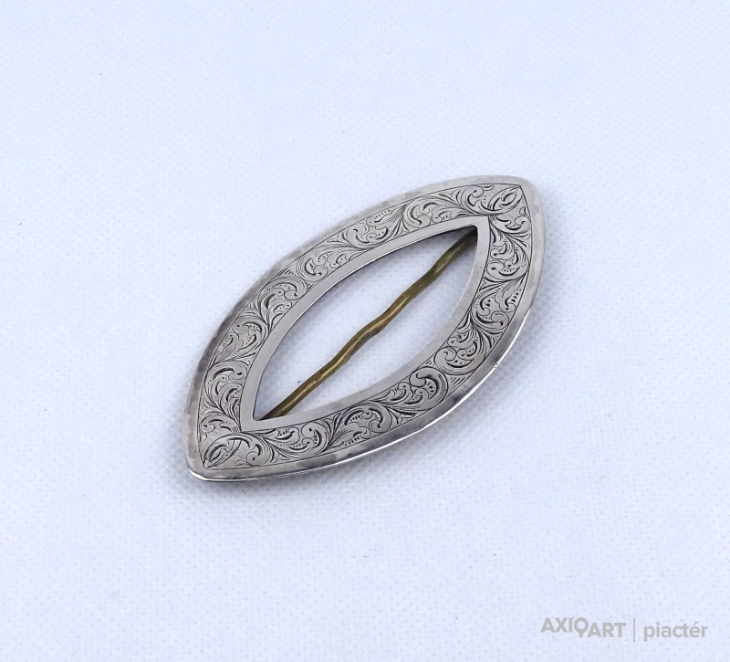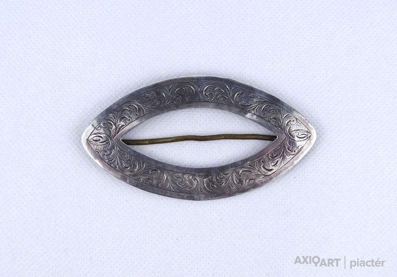 [1Z823/X024/18] Antik, szép állapotú, vésett levélmintákkal díszített, jelzett ezüst csat, ruhacsat, övcsat. Maximum 5.8 cm széles öv fűzhető át rajta. A csat előlapja ezüst, de a bujtatók sárgarézből készültek. Hátoldalán beütött jelzések, lásd fotó. Magasság: 10.3 cm Szélesség: 5.55 cm Súly: 0.034 kg