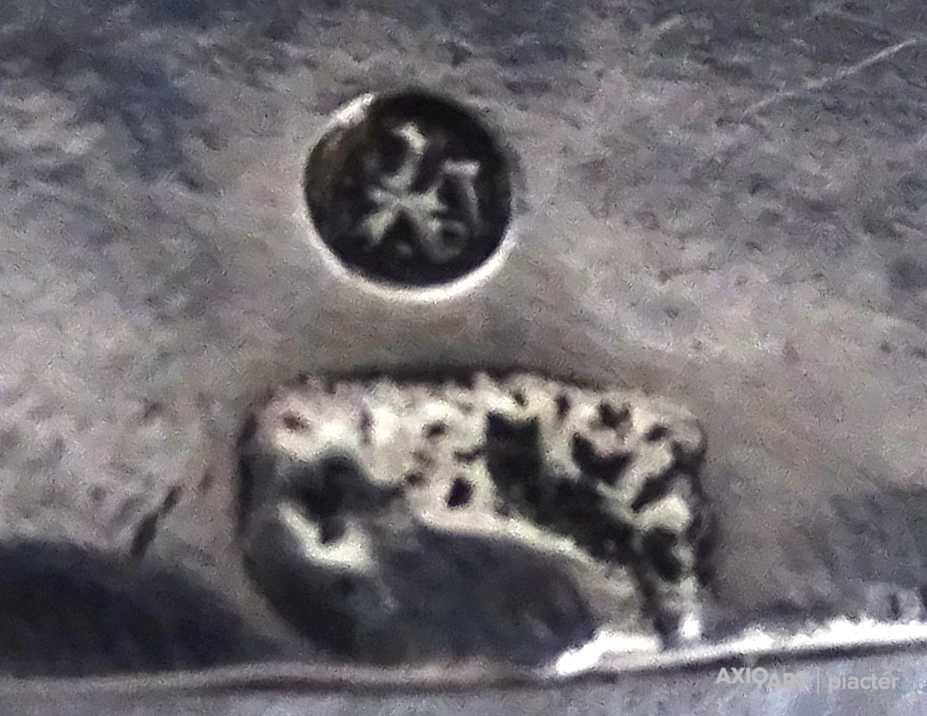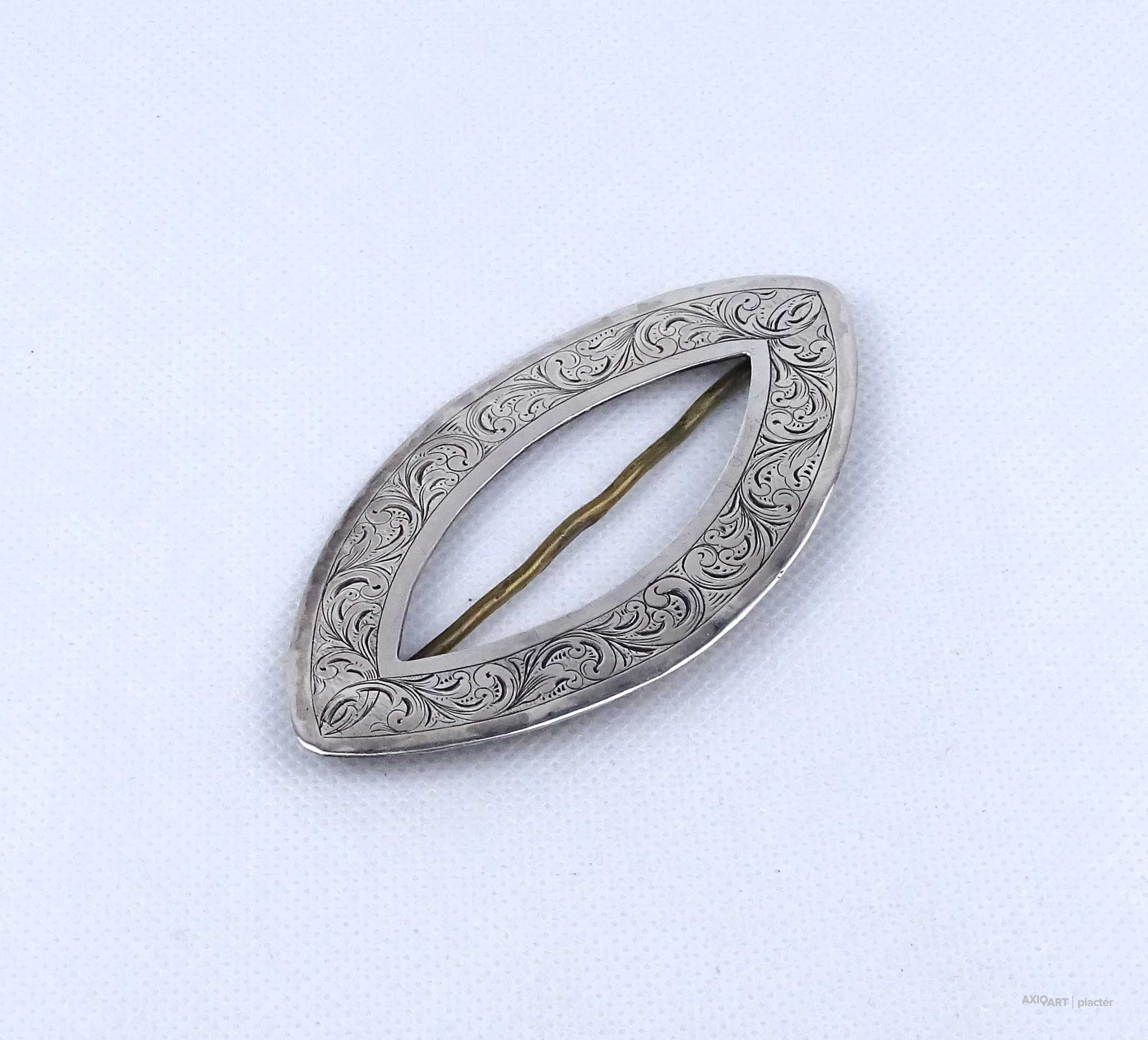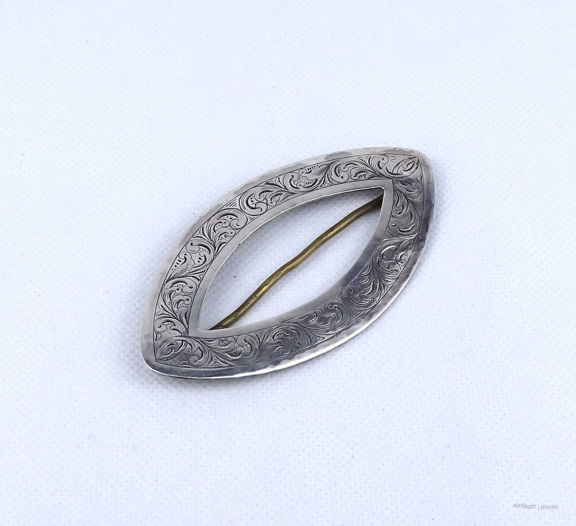 Antik, szép állapotú, vésett levélmintákkal díszített, jelzett ezüst csat, ruhacsat, övcsat. Maximum 5.8 cm széles öv fűzhető át rajta. A csat előlapja ezüst, de a bujtatók sárgarézből készültek.