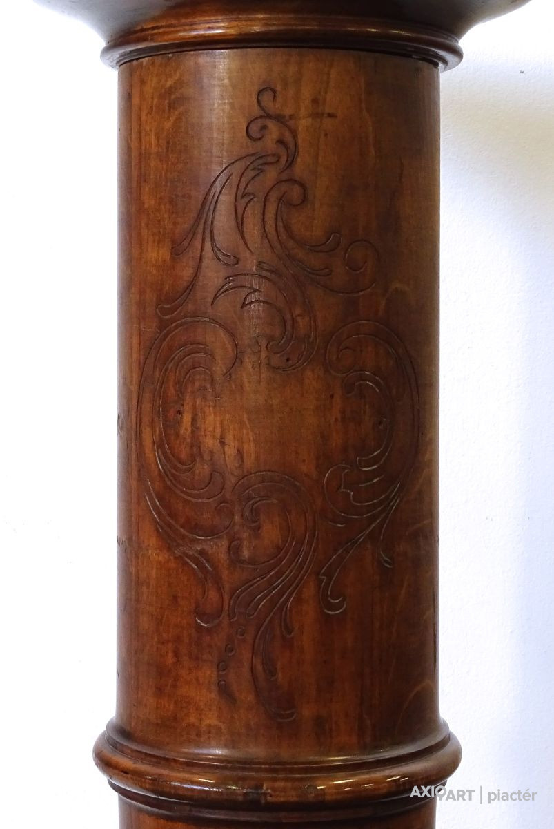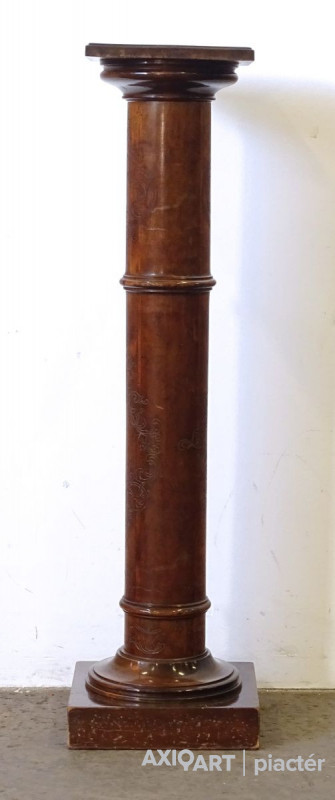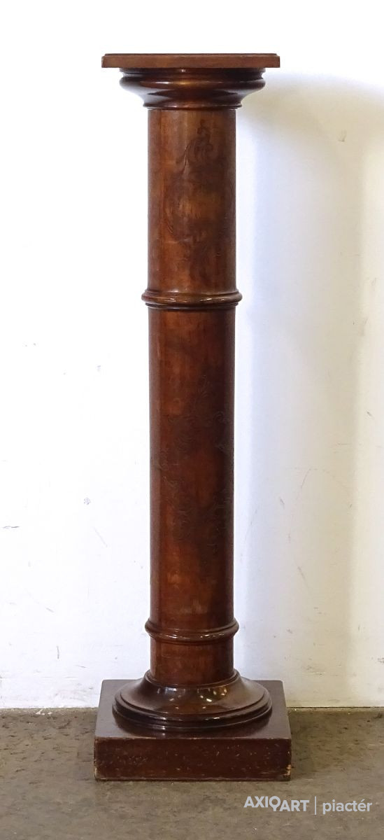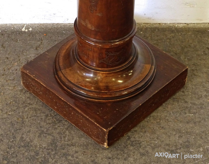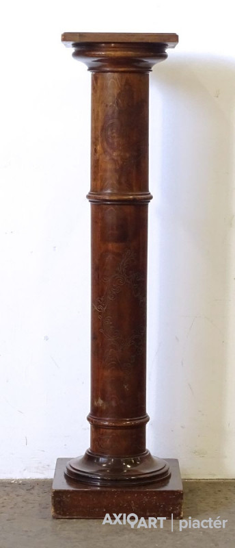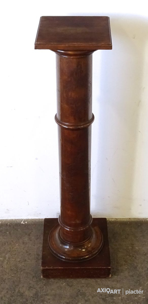 Régi, vastag oszlopos, vésett felületű szobortartó állvány vagy virágállvány.