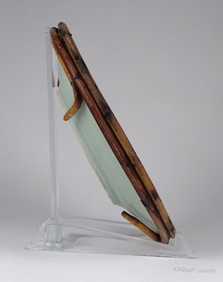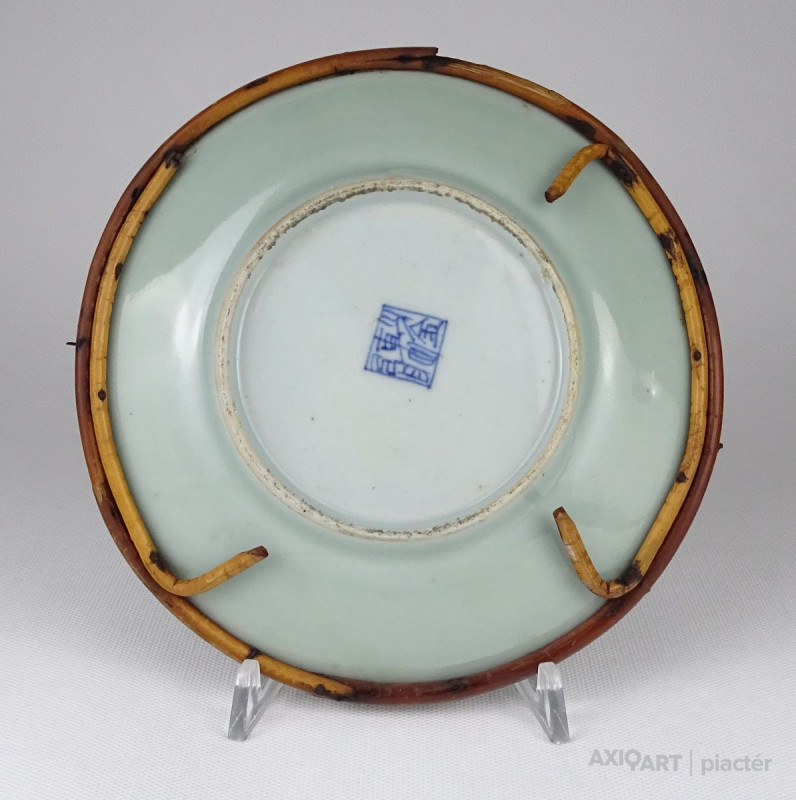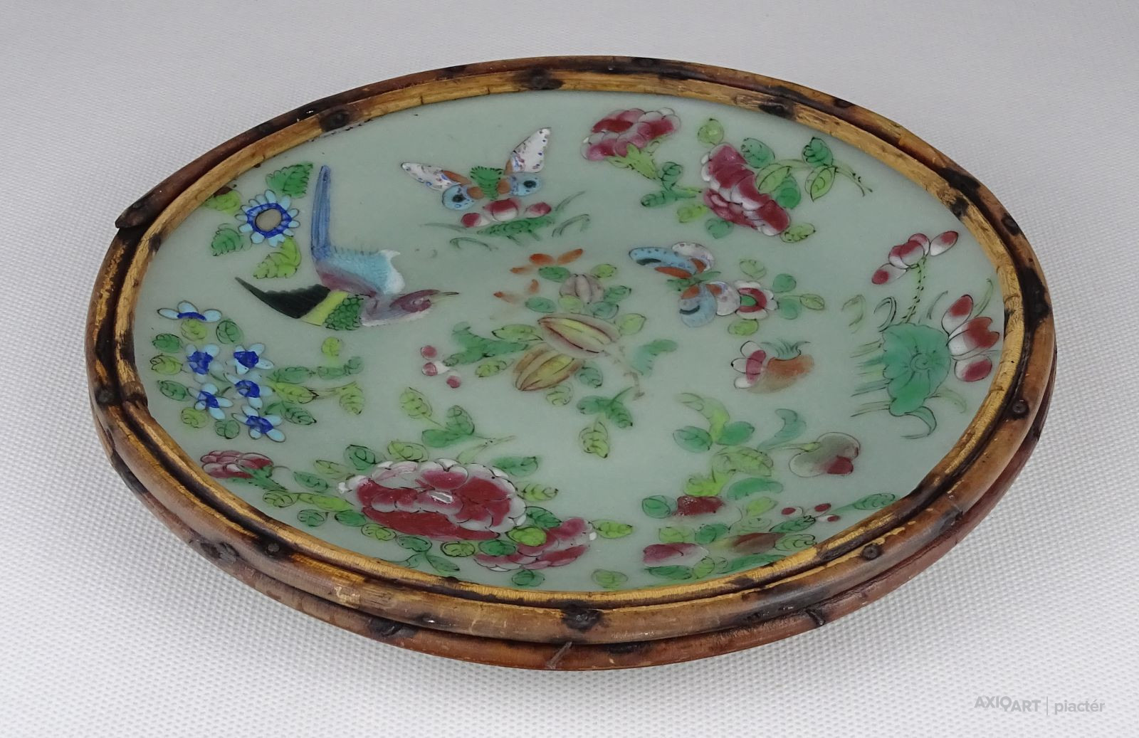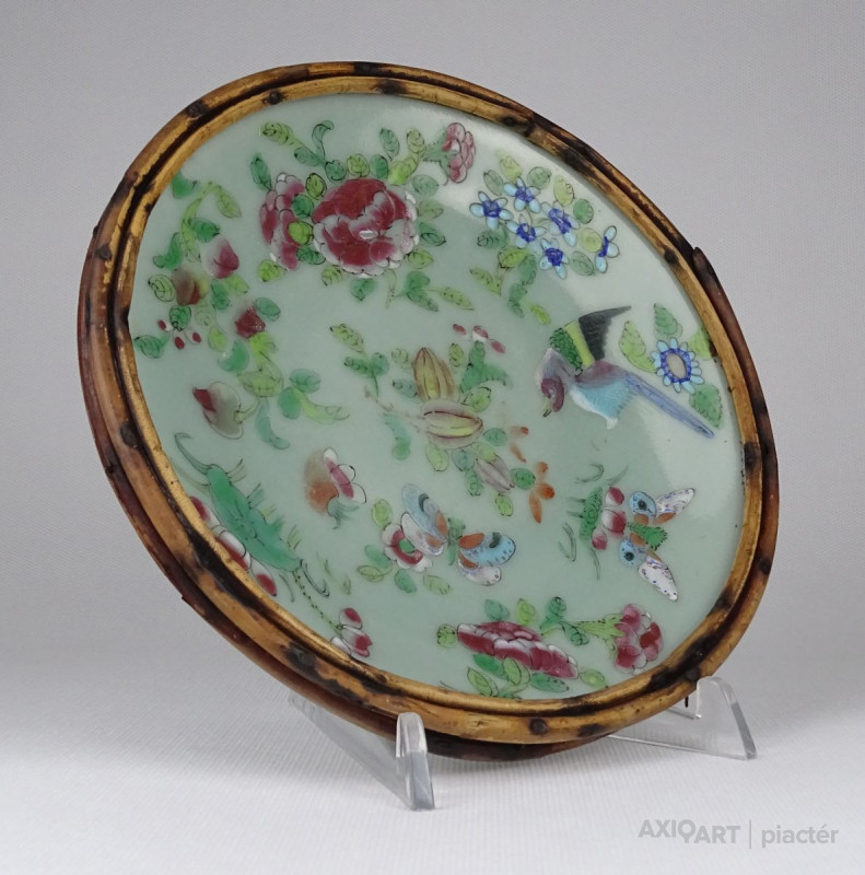 Antik, hibátlan állapotú gazdag kézi festéssel díszített keleti kőporcelán tányér. Vesszőkeretbe foglalt dísztányér. Rajta virág díszítés és madár látható.