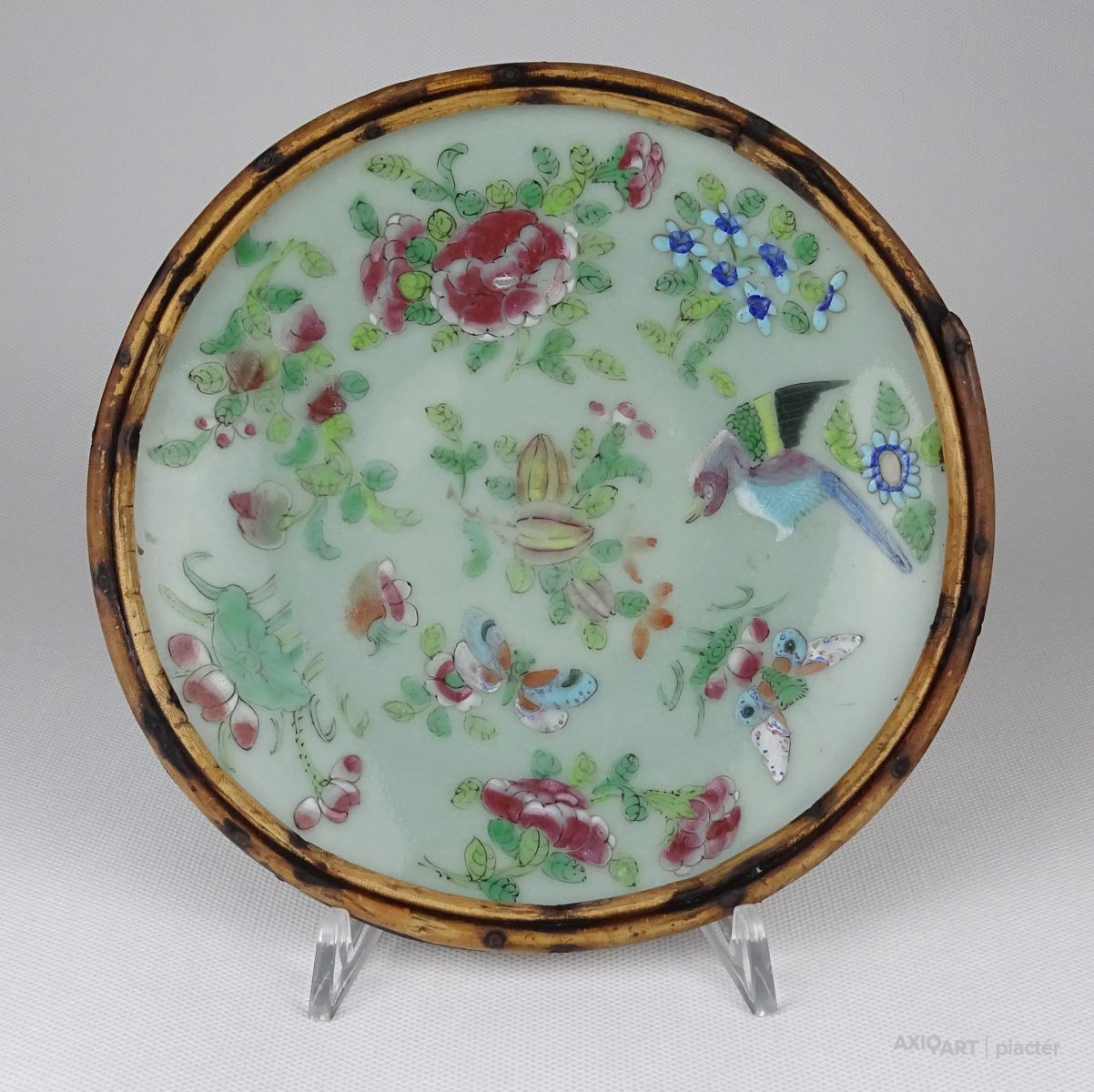 [1O724/BX-2] Antik, hibátlan állapotú gazdag kézi festéssel díszített keleti kőporcelán tányér. Vesszőkeretbe foglalt dísztányér. Rajta virág díszítés és madár látható. Szélesség: 19 cm Súly: 0.385 kg