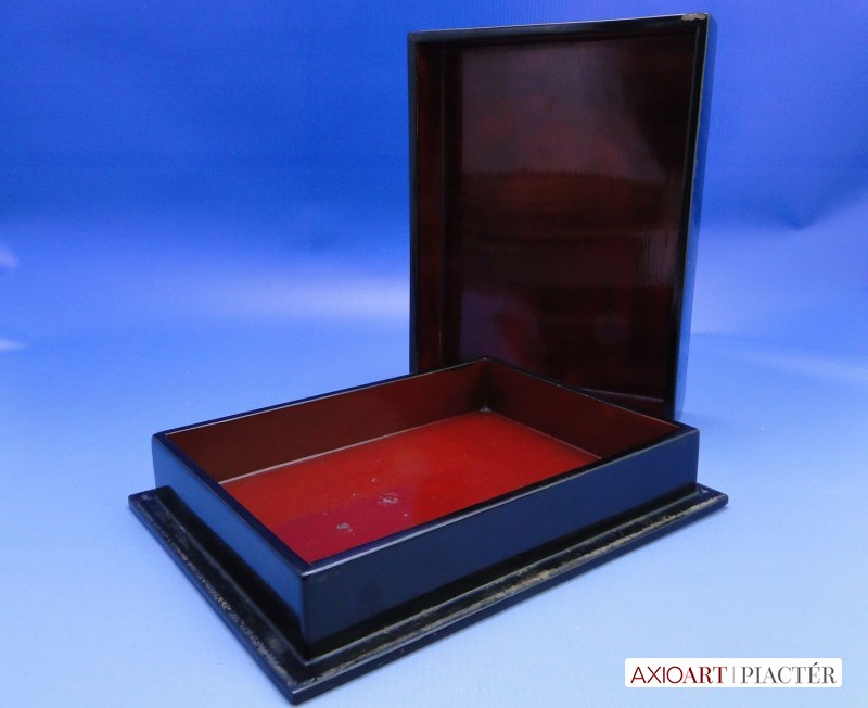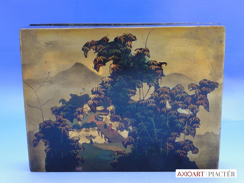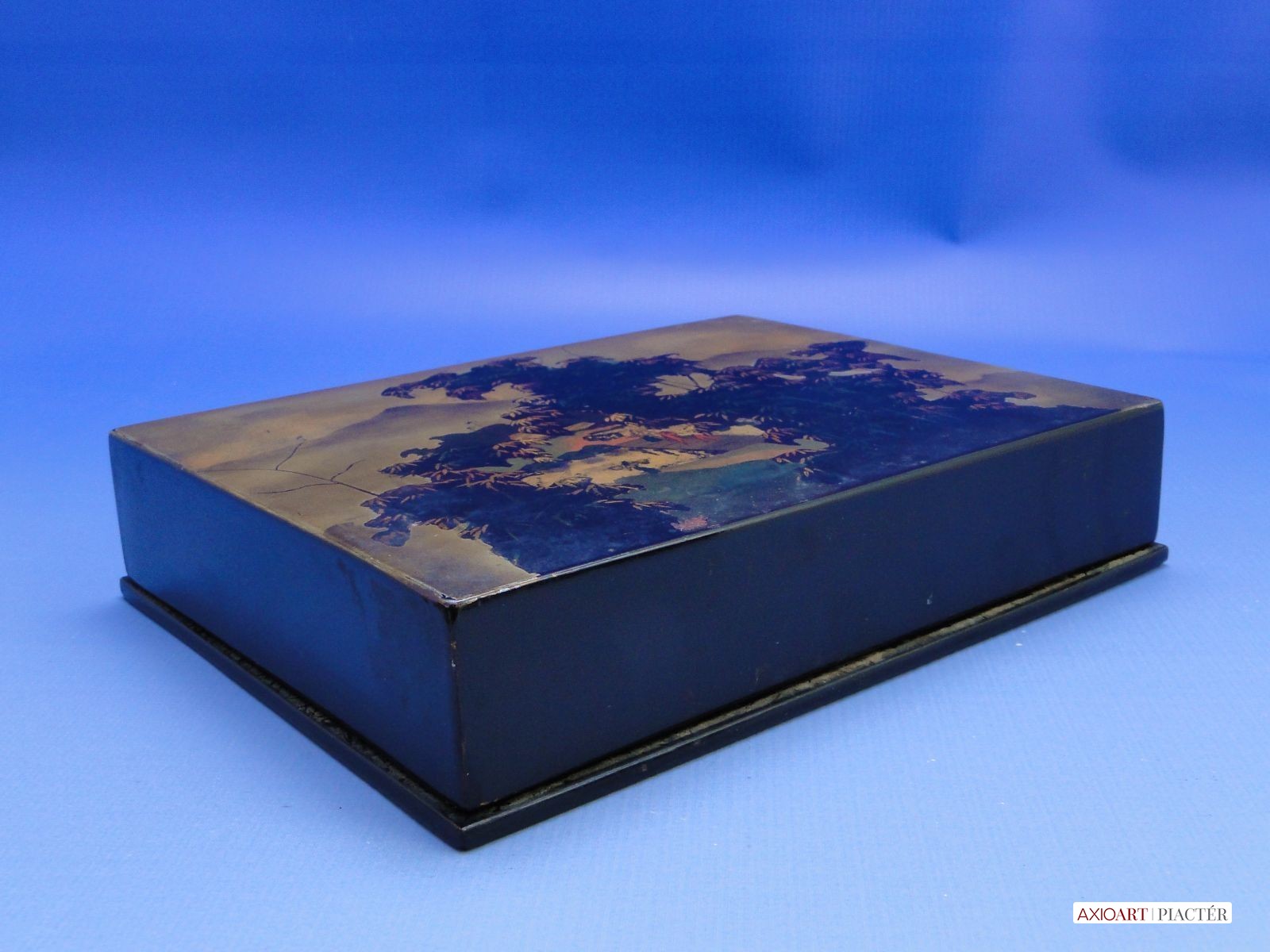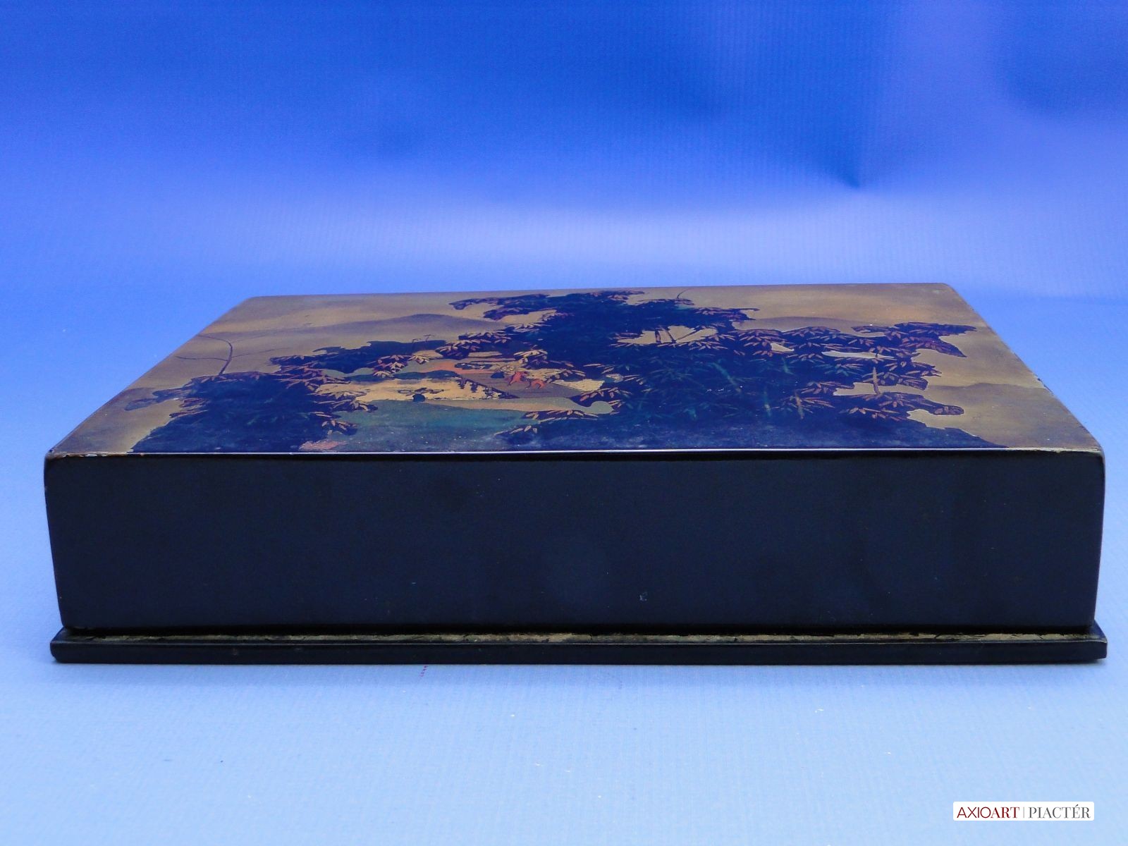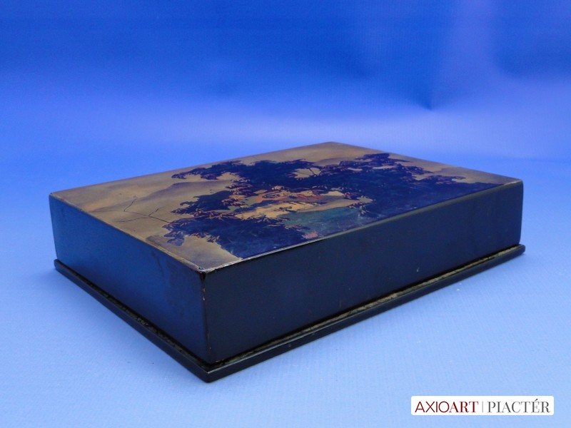 [0B978/BX-2] Szép állapotú lakkozott fa kártyadoboz, szivardoboz. Tetején kézi festésű jelenet. Alján jelzés: GHE VIETNAM Magasság: 4.3 cm Szélesség: 15.5 cm Hosszúság: 20.5 cm Súly: 0.424 kg